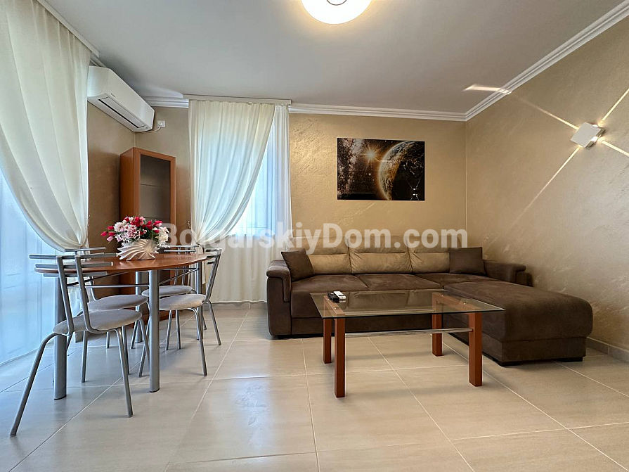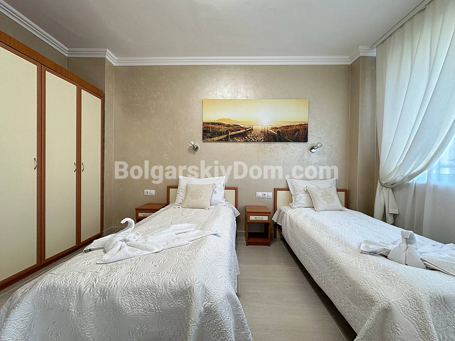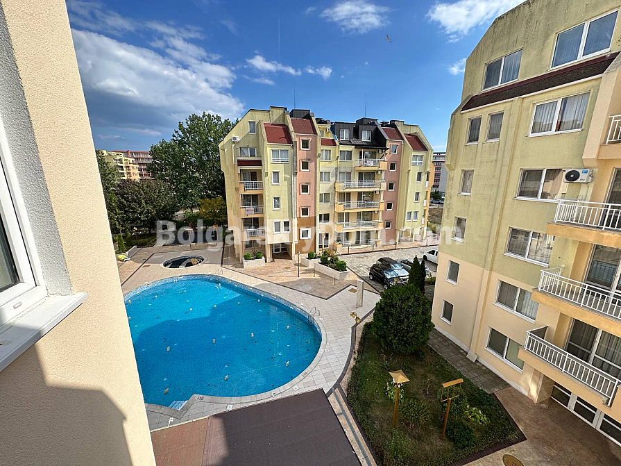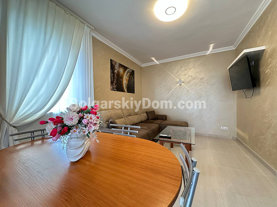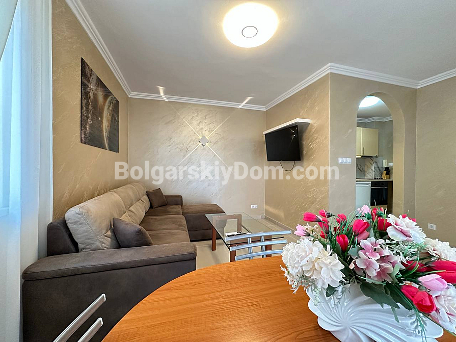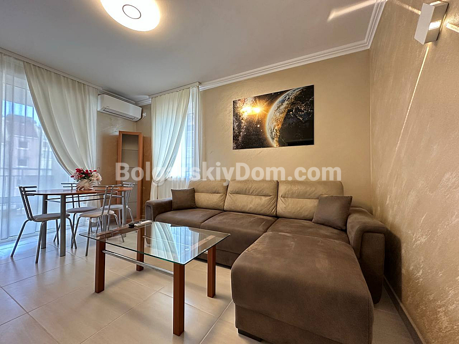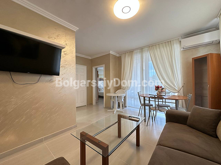 A worthy novelty in the top resort town of Bulgaria, Sunny Beach! A one–bedroom apartment in a year-round Sea Dreams complex is open for sale - with appliances, furniture, a convenient layout and in excellent technical condition. The apartment is suitable for a long stay: it has a comfortable layout with a kitchen located in a separate niche (washing machine, oven, stove, refrigerator), an autonomous bedroom with two beds, air conditioning and TV, and a spacious living room divided into a sitting area and a dining room. Fifth floor, total area 63 sq. m. Arrange with the agents of the Bulgarian House about a convenient time for you to inspect.