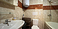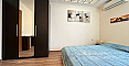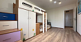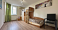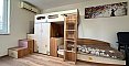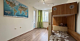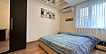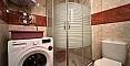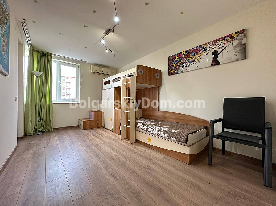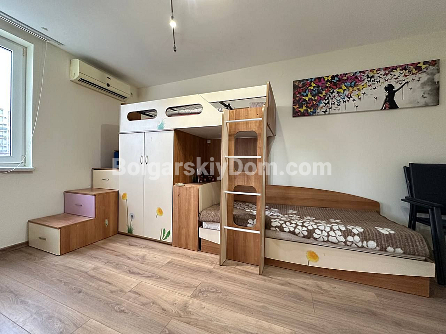 The master bedroom features a large bed and a dedicated workspace. The second bedroom is designed as a children's room. The apartment has two bathrooms: one with a bathtub and the other with a shower cabin, as well as a washing machine.