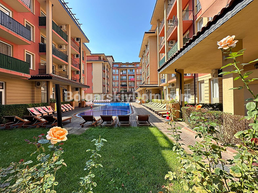Special offer at a super price from "Bolgarskiy Dom"! This two-bedroom apartment with an area of 111.8 sq.m, located on the fifth floor with an elevator in the Sunny View Central complex, is a real find for those who value space and views. Two large bedrooms, each with its own bathroom and terrace, provide personal space, while the bright living room with a kitchen opens onto the main terrace – equipped with loungers and offering a panoramic view of the pool and gardens. The apartment is already furnished, with air conditioning, a washing machine, and an oven – everything is ready for living or renting. The annual fee of 1344 euros is justified by the amenities, and the condition of the apartment means no extra expenses for renovations.