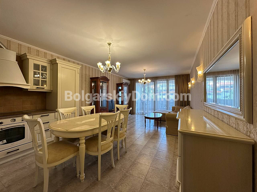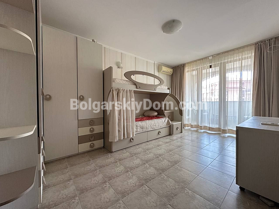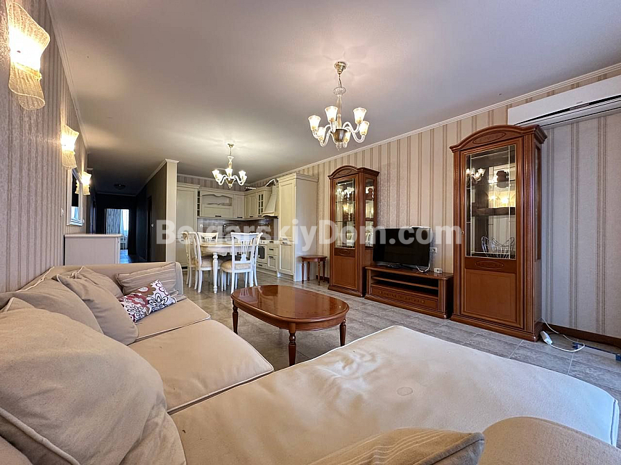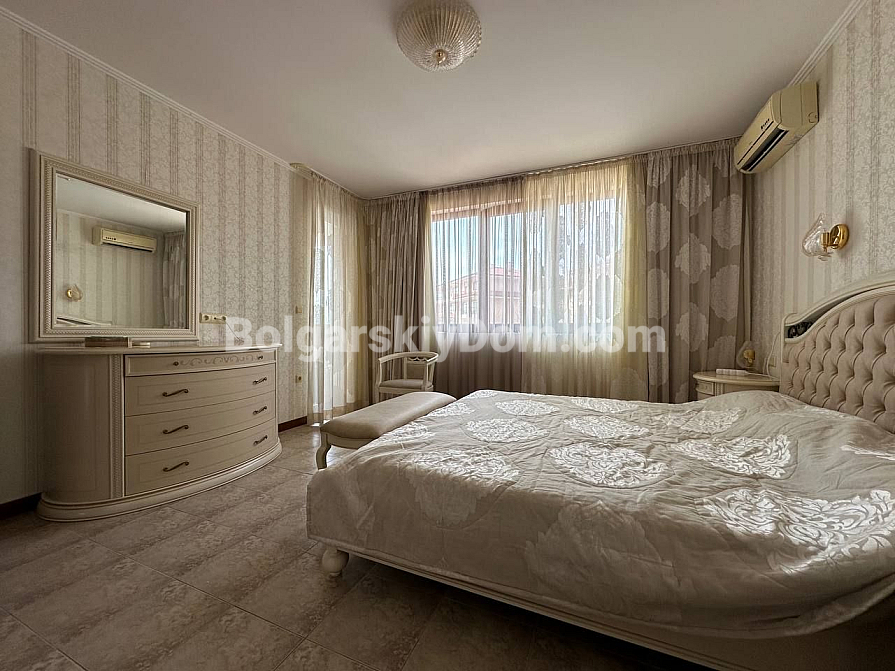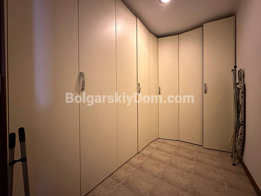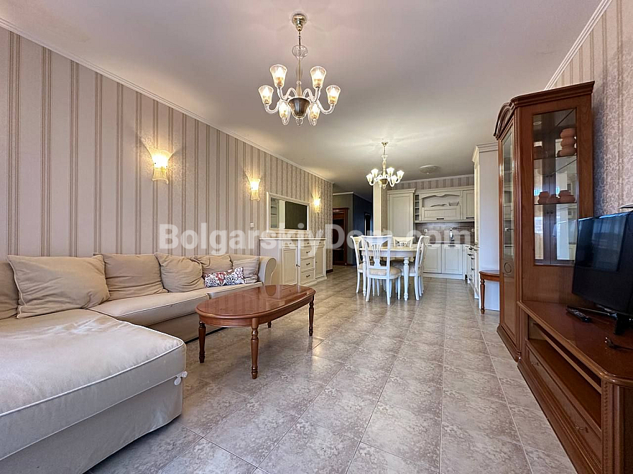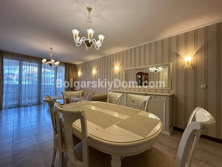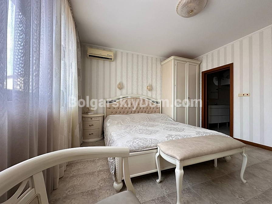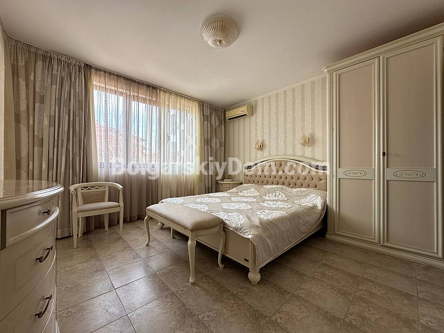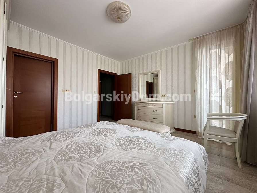 Panoramic premium-class apartment! Bolgarskiy Dom real estate agency presents to your attention a spacious two-bedroom apartment in the elite complex Casa Real in Sveti Vlas. With a total area of 149.25 sq.m., it is one of the largest and most comfortable in its class. The apartment consists of an entrance hall, a spacious corridor, a large living room with a kitchen and dining area, two bedrooms, two bathrooms, and two terraces. The property is fully furnished and equipped for permanent residence: it has all necessary appliances, including a refrigerator, stove, and washing machine, as well as dishes and kitchen utensils. Special attention should be paid to the spacious walk-in closet and the en-suite bathroom in one of the bedrooms.