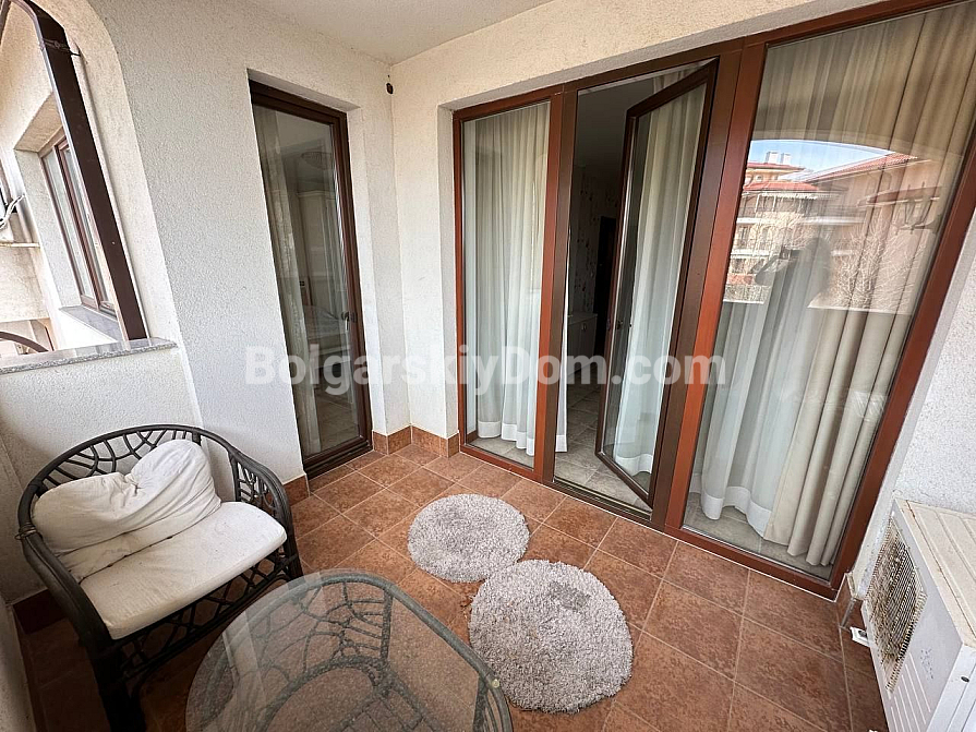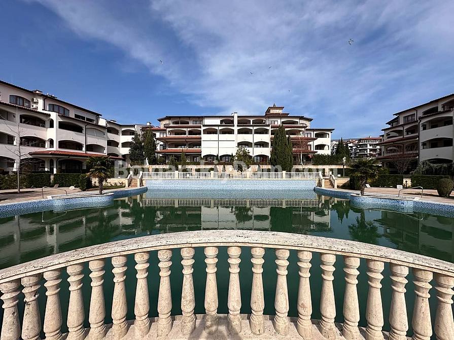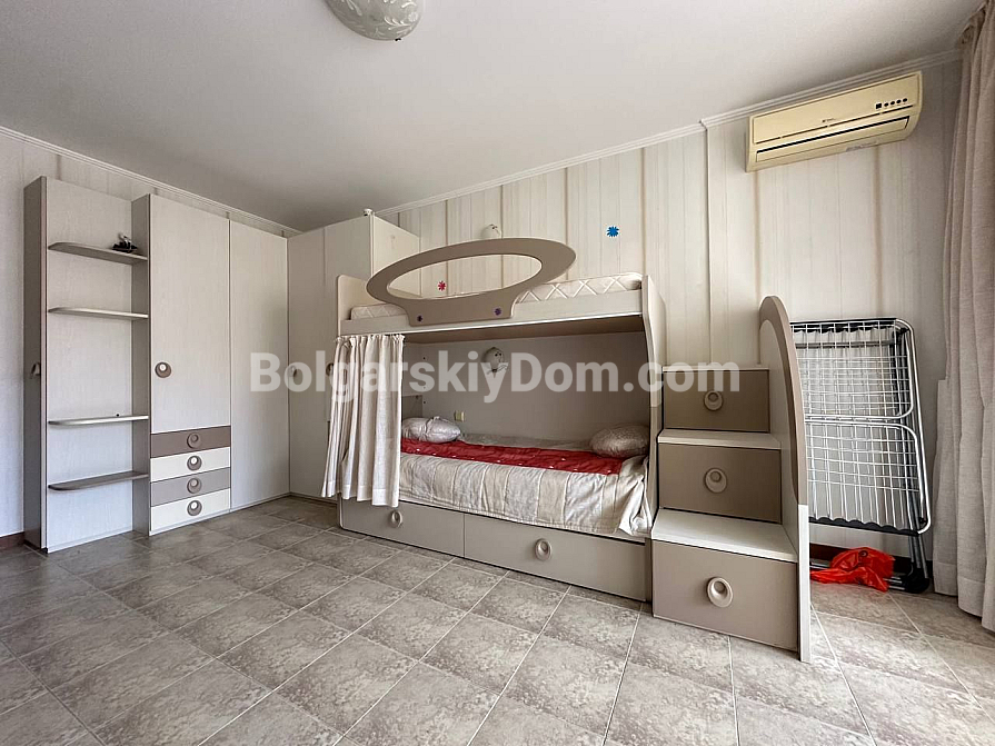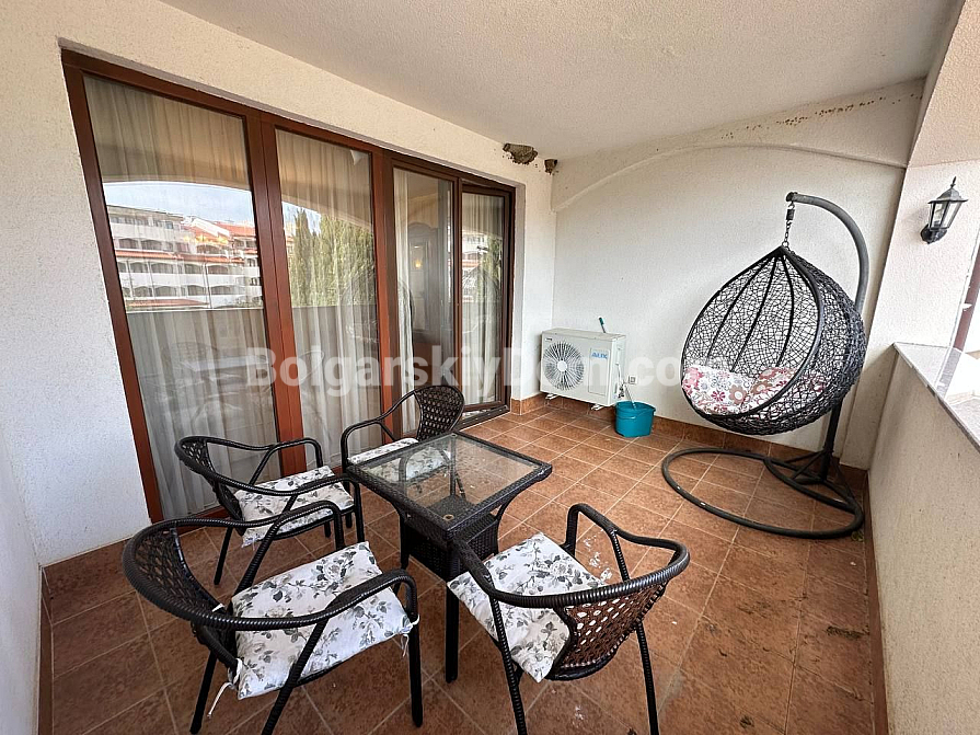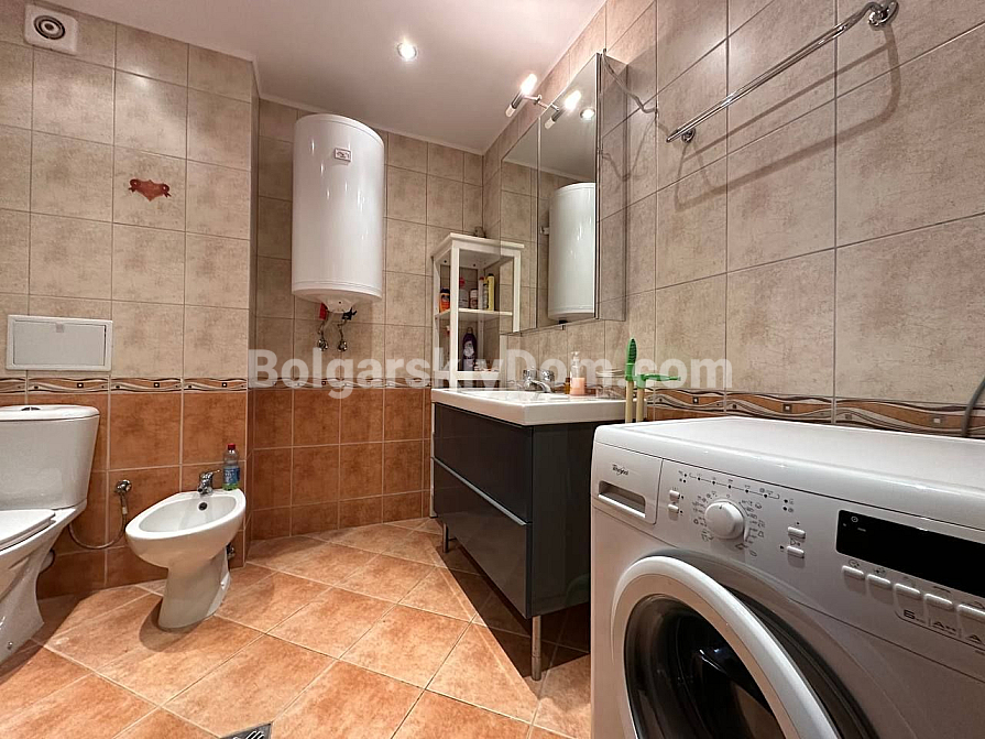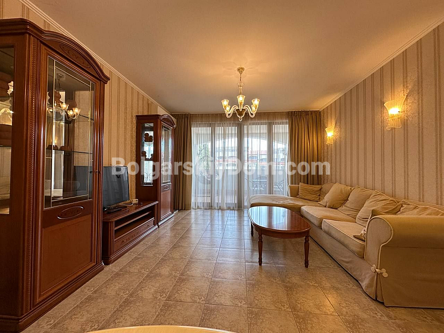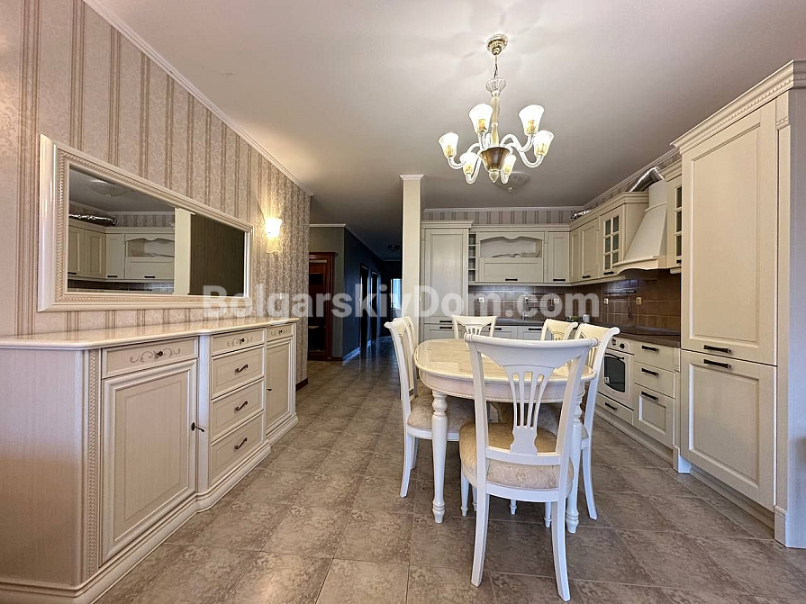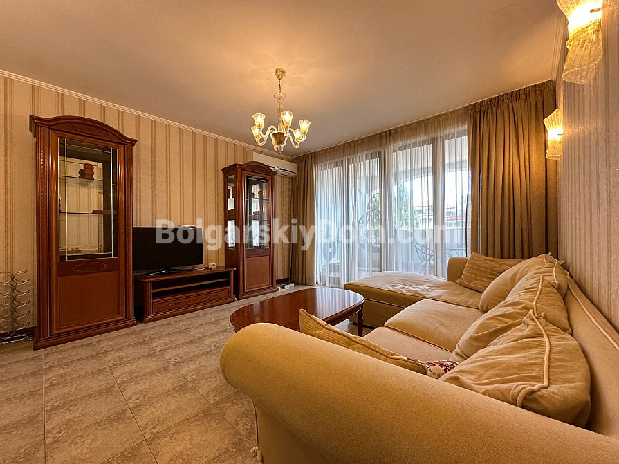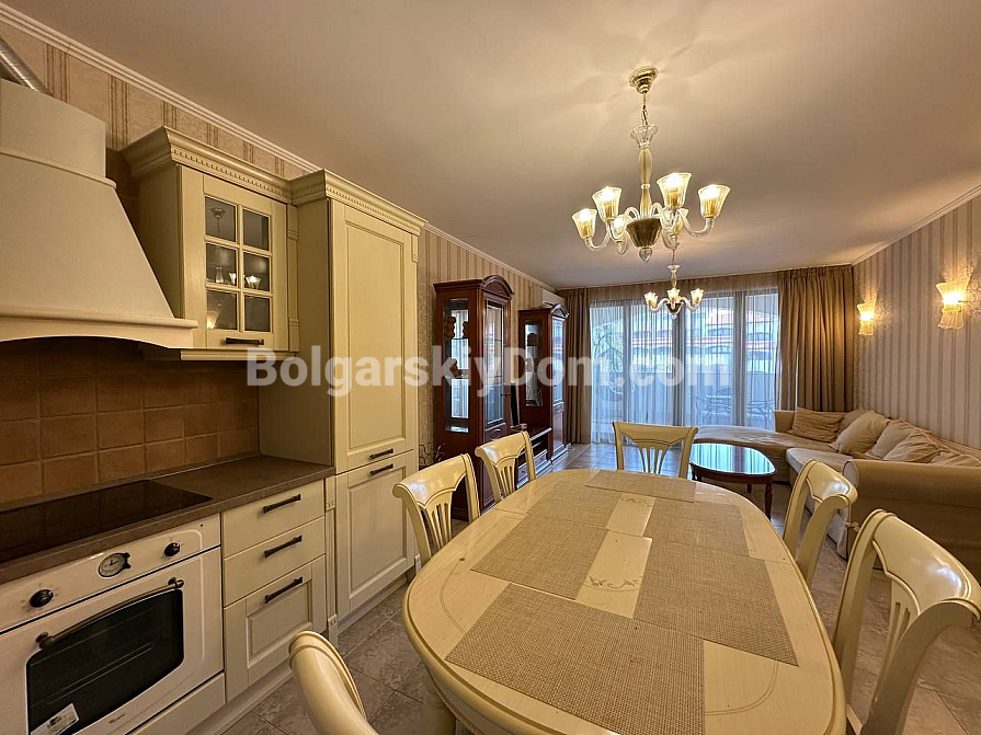 Panoramic premium-class apartment! Bolgarskiy Dom real estate agency presents to your attention a spacious two-bedroom apartment in the elite complex Casa Real in Sveti Vlas. With a total area of 149.25 sq.m., it is one of the largest and most comfortable in its class. The apartment consists of an entrance hall, a spacious corridor, a large living room with a kitchen and dining area, two bedrooms, two bathrooms, and two terraces. The property is fully furnished and equipped for permanent residence: it has all necessary appliances, including a refrigerator, stove, and washing machine, as well as dishes and kitchen utensils. Special attention should be paid to the spacious walk-in closet and the en-suite bathroom in one of the bedrooms.