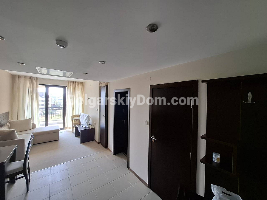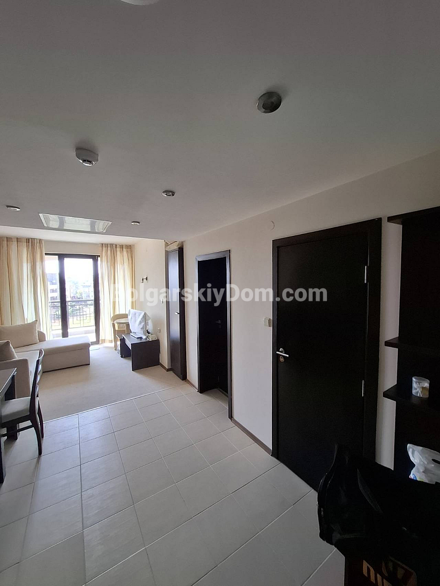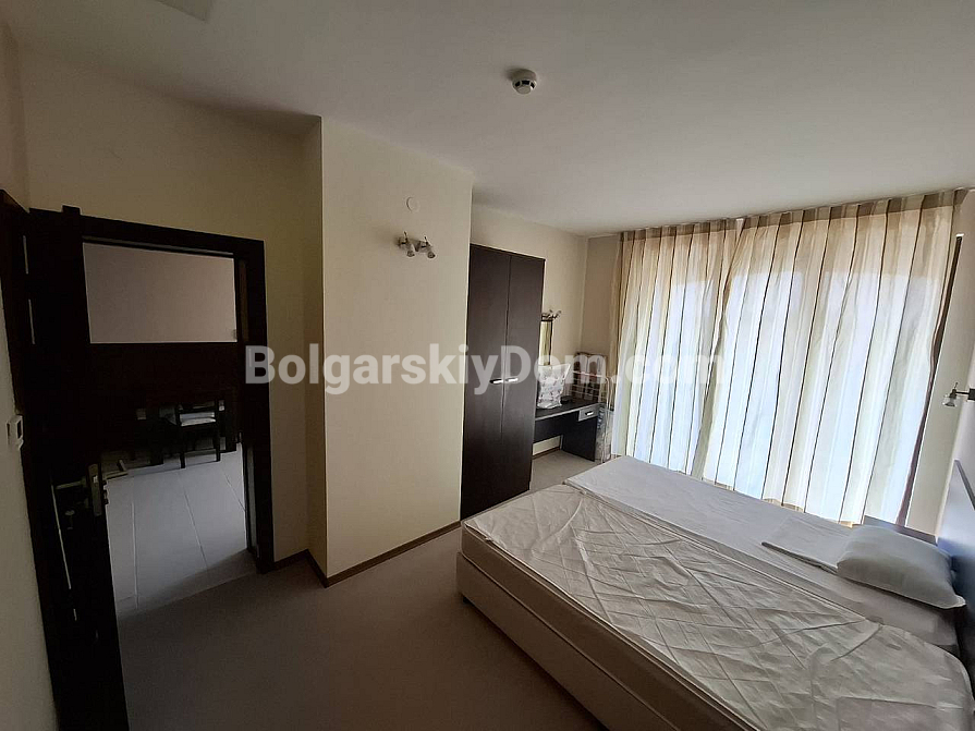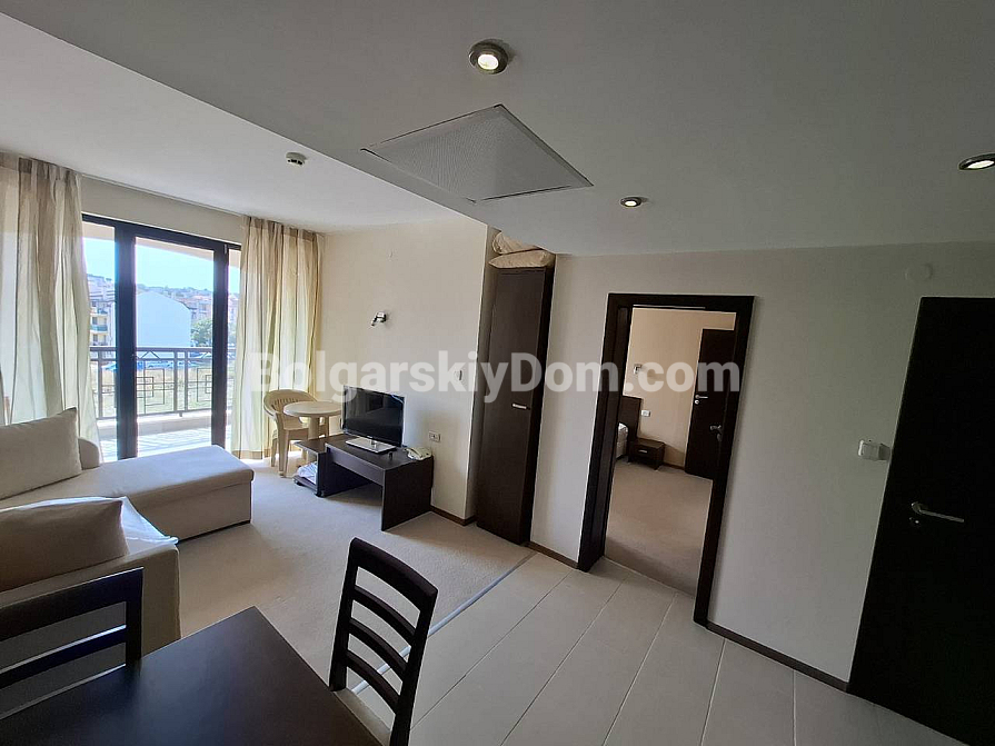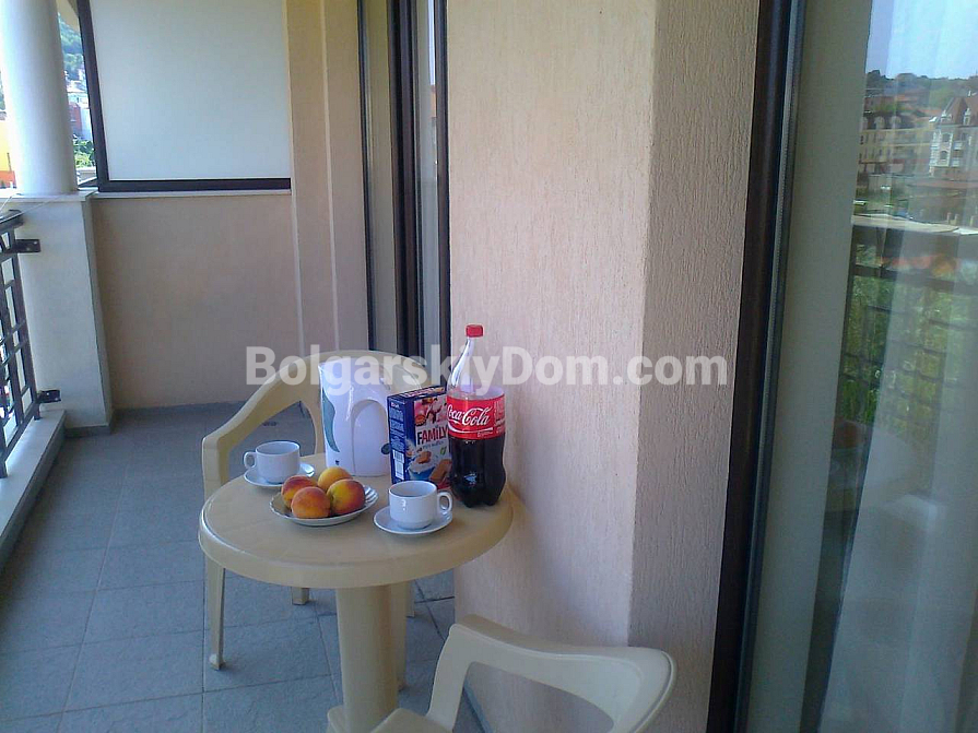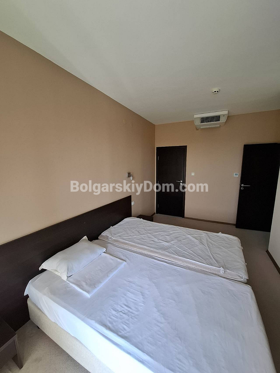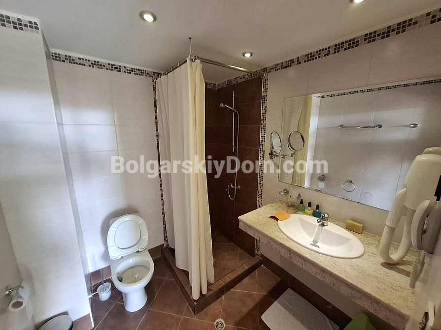 Bolgarskiy Dom presents! Our catalog now features a unique apartment in the four-star Casablanca Hotel. The beach is only 100 meters away, yet the location is quiet and pleasant. The apartment has an area of 70.6 sq.m., is located on the fourth floor, and offers a wonderful view of the sea, city, and mountains — a real combo. The layout includes a living room with a kitchenette, a separate dressing room, a bedroom, two bathrooms, and a shared terrace. The property is fully equipped with all household appliances, air conditioning, internet, and digital TV. Individual meters for electricity and water are installed.