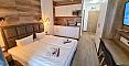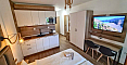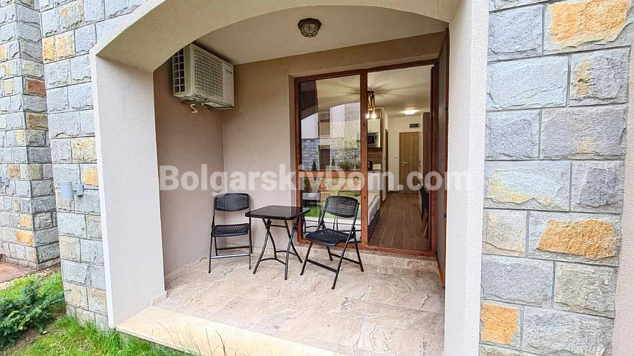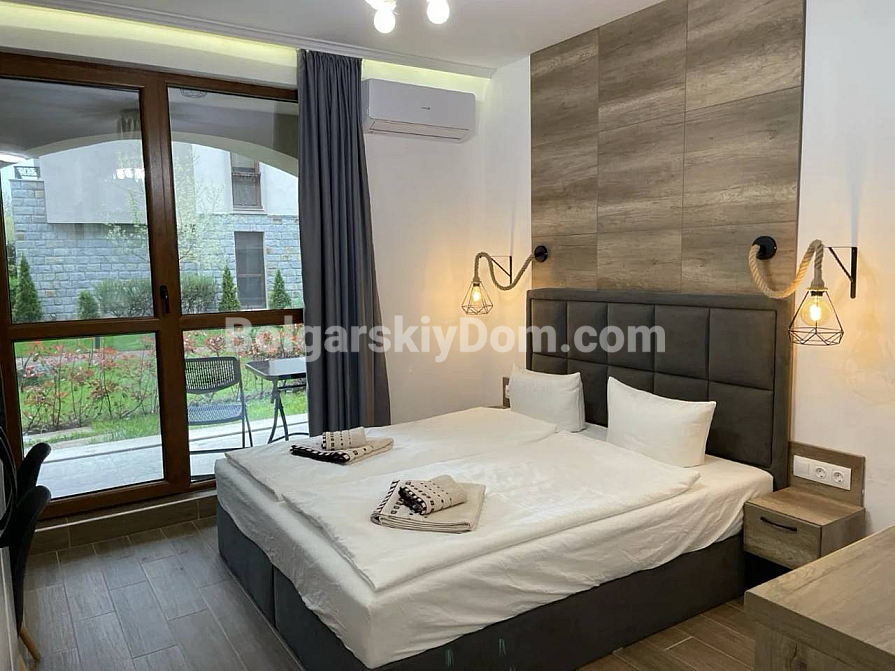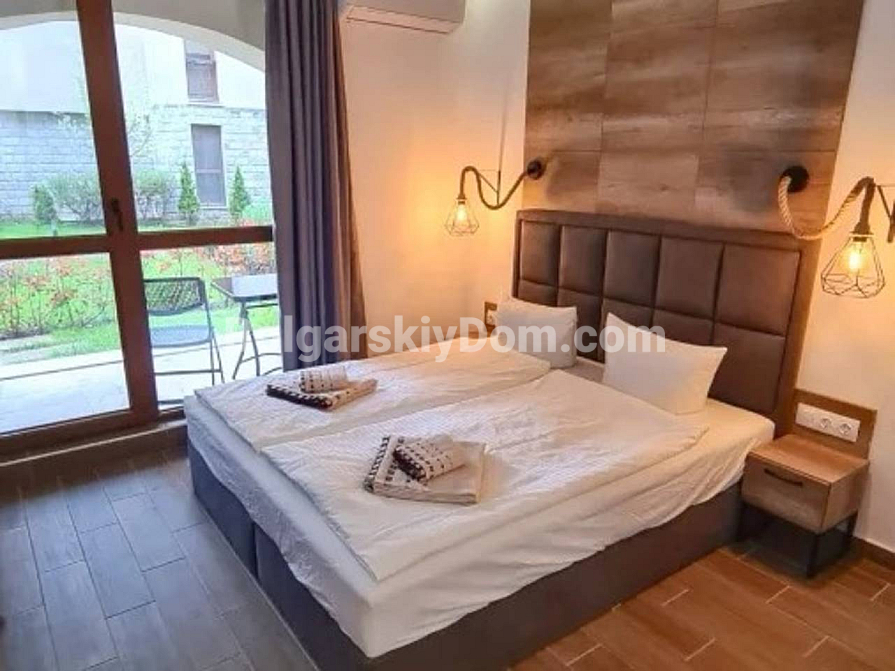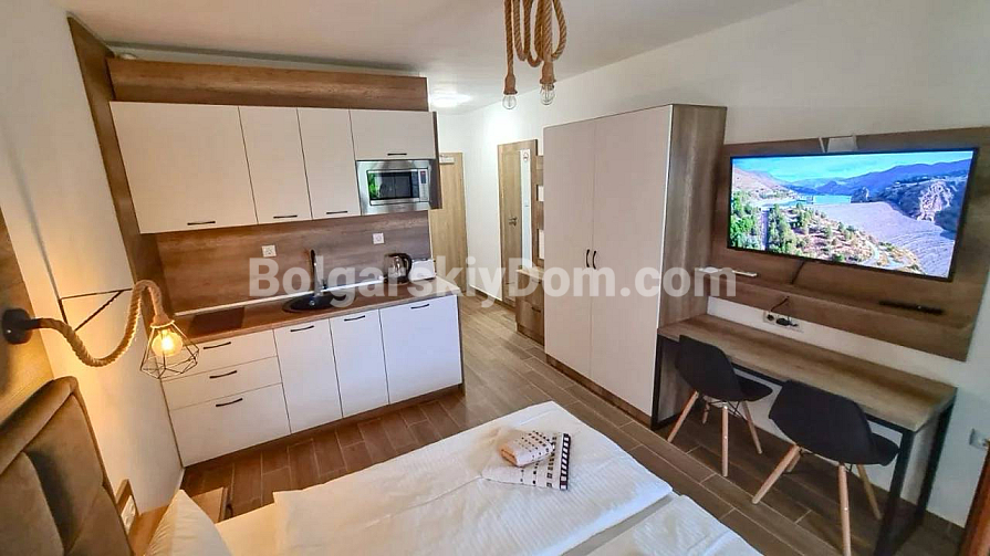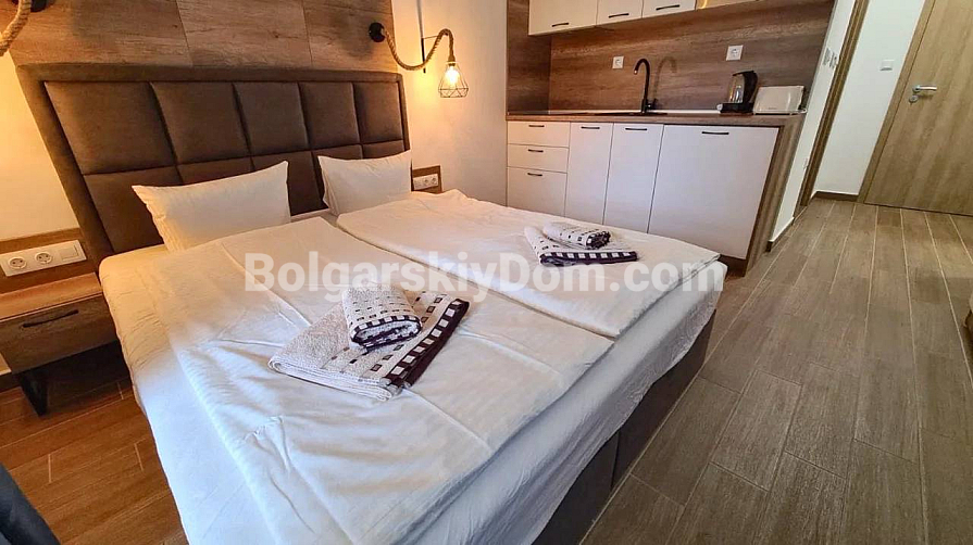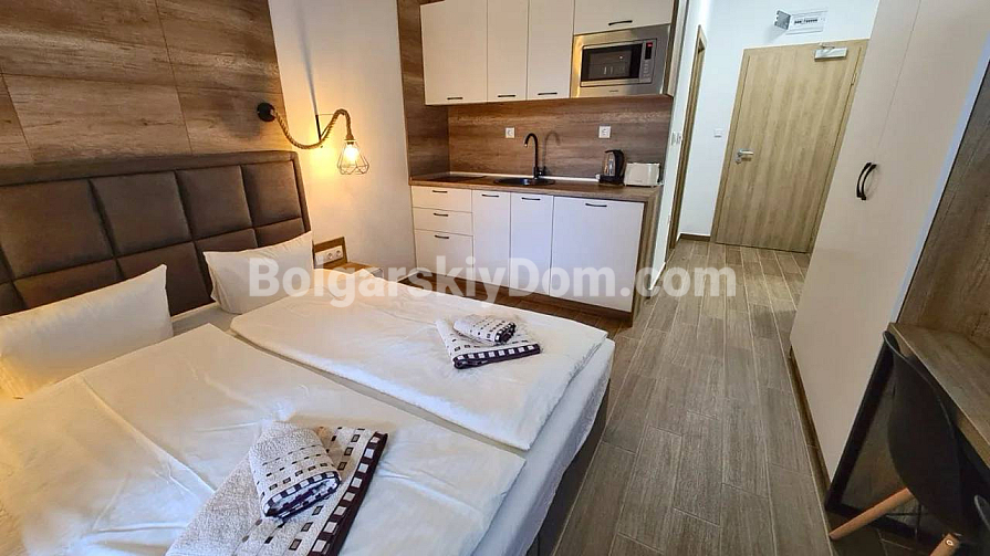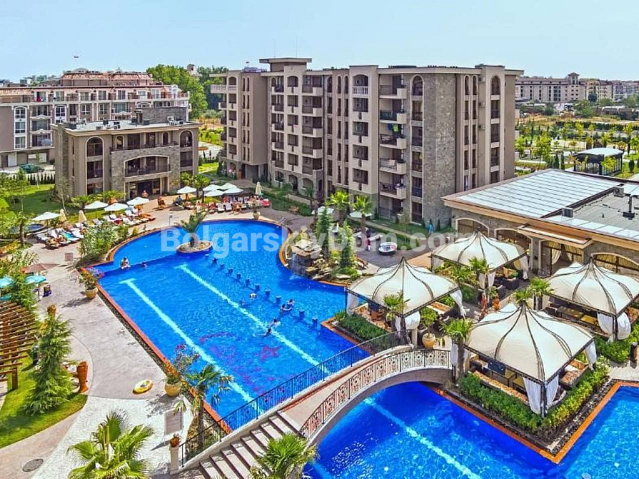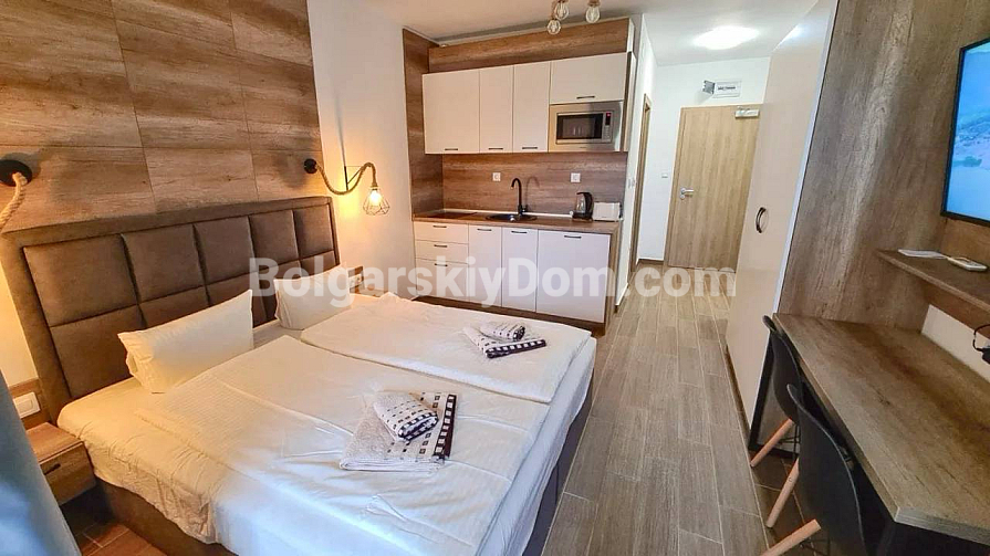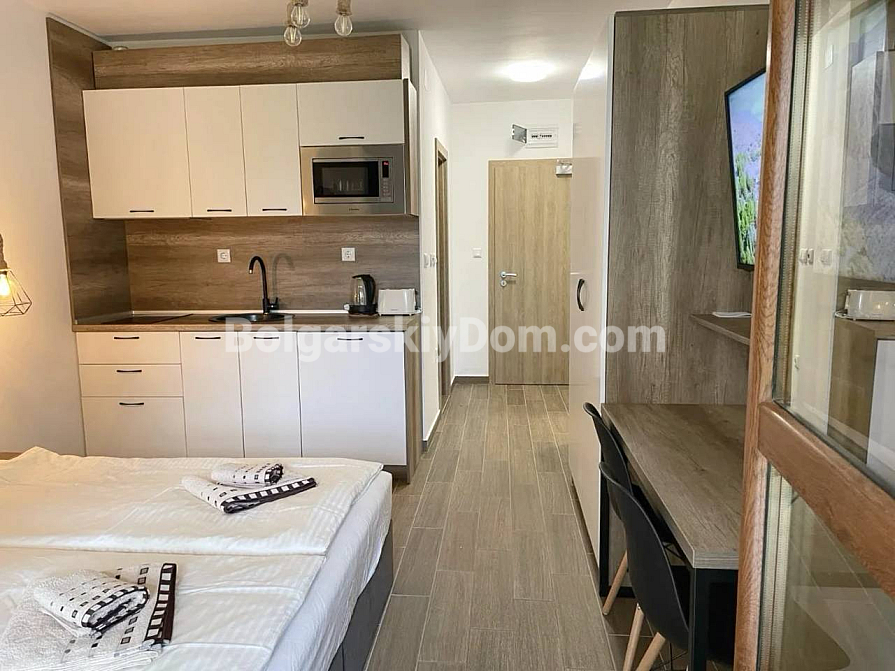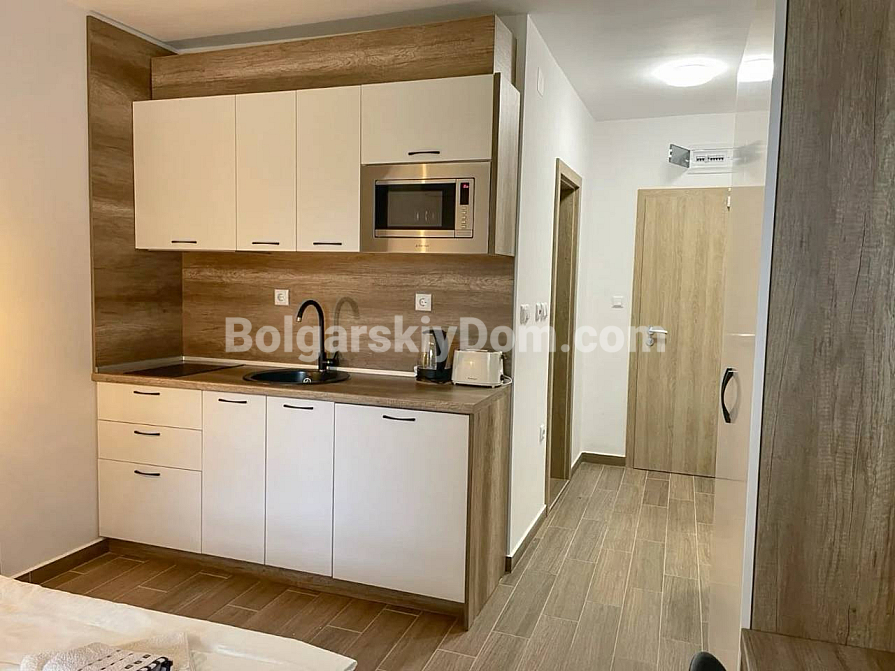 In the luxurious Cascadas complex in Sunny Beach, one of the most elite and popular developments, a stylish studio apartment with a brand-new renovation is for sale. This cozy 36 sq.m. home, located on the first floor, is designed in warm wooden tones. The apartment has everything needed for comfortable living: a large double bed with a soft headboard, a modern kitchenette with a stove, microwave, and full set of dishes. There is also a working area with a TV, a modern bathroom, air conditioning, and high-speed Wi-Fi. The apartment combines homely comfort with high-level service, making it ideal for couples, families, or business trips.