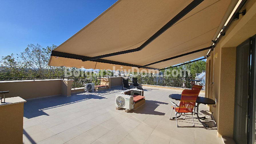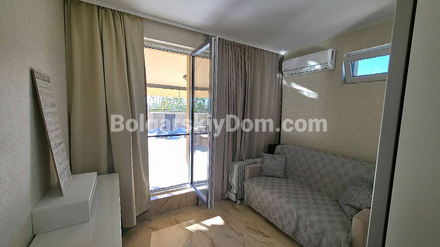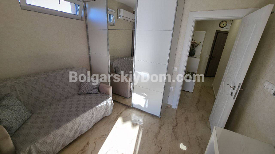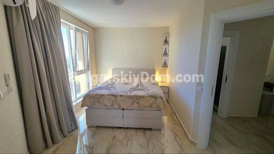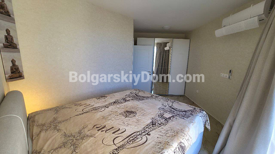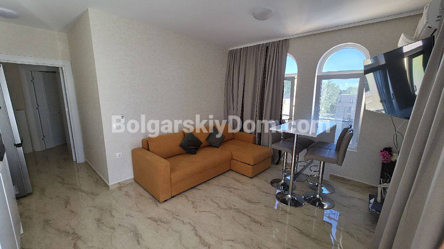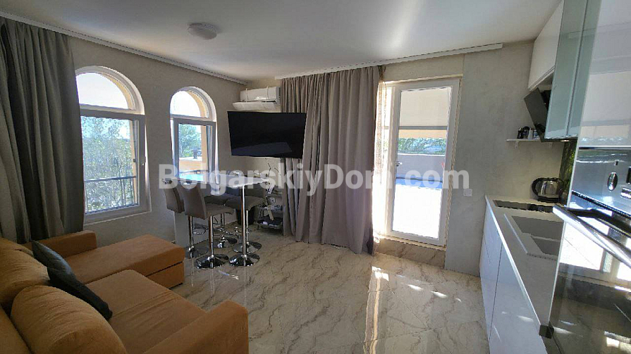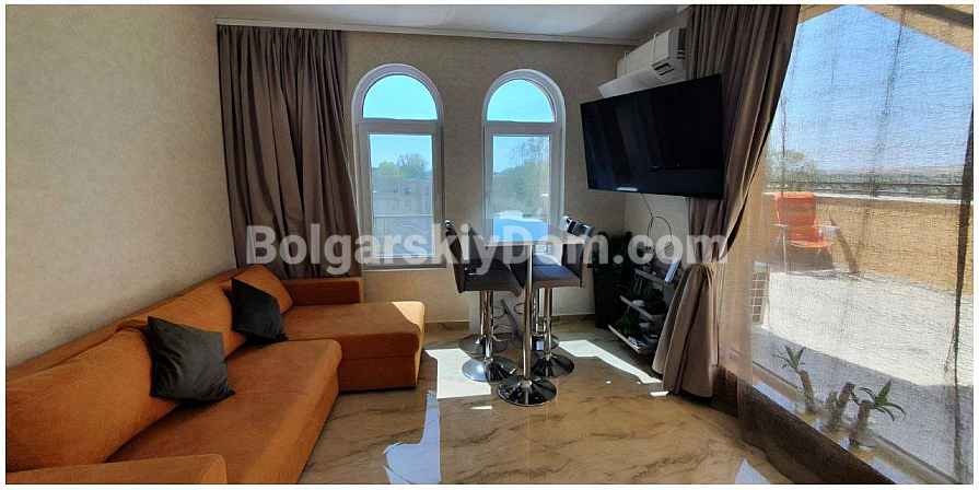 In the catalog of the company Bolgarskiy Dom, there is an exclusive property that impresses with its perfect condition and readiness for immediate occupancy. For sale: a two-bedroom apartment in the Aphrodite Green complex in Sunny Beach. The apartment has an area of 120 sq.m., is located on the sixth and top floor, and features a functional layout: entrance hall, living room with kitchen, two bedrooms, bathroom, and a large landscaped terrace. The property is fully furnished, equipped with appliances, everything brand new. The interior is given a special charm by very beautiful arched windows.