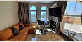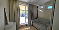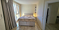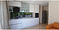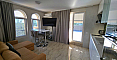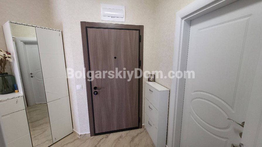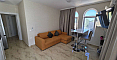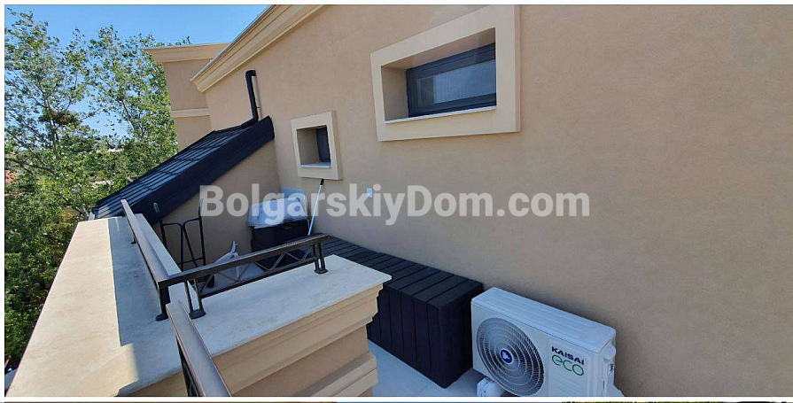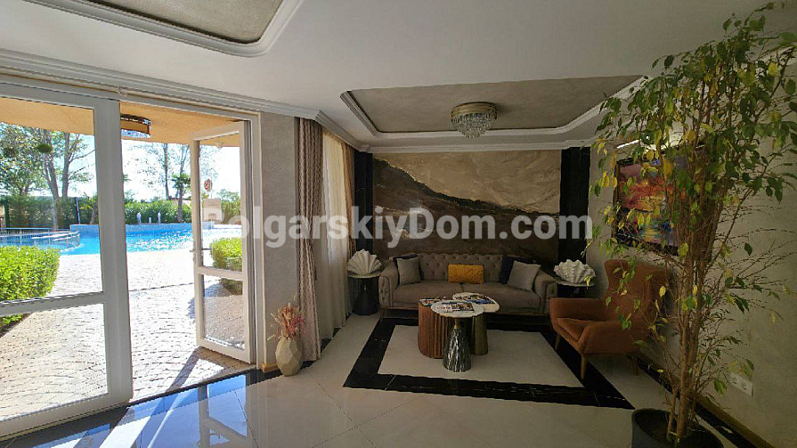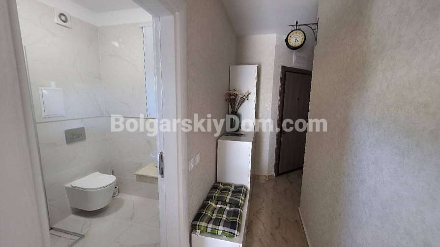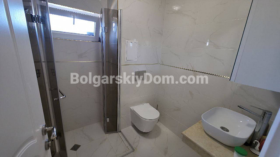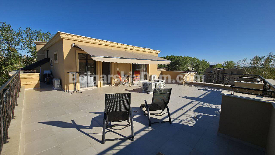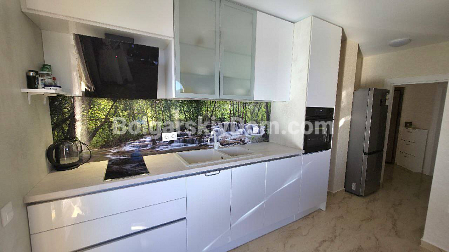 In the catalog of the company Bolgarskiy Dom, there is an exclusive property that impresses with its perfect condition and readiness for immediate occupancy. For sale: a two-bedroom apartment in the Aphrodite Green complex in Sunny Beach. The apartment has an area of 120 sq.m., is located on the sixth and top floor, and features a functional layout: entrance hall, living room with kitchen, two bedrooms, bathroom, and a large landscaped terrace. The property is fully furnished, equipped with appliances, everything brand new. The interior is given a special charm by very beautiful arched windows.