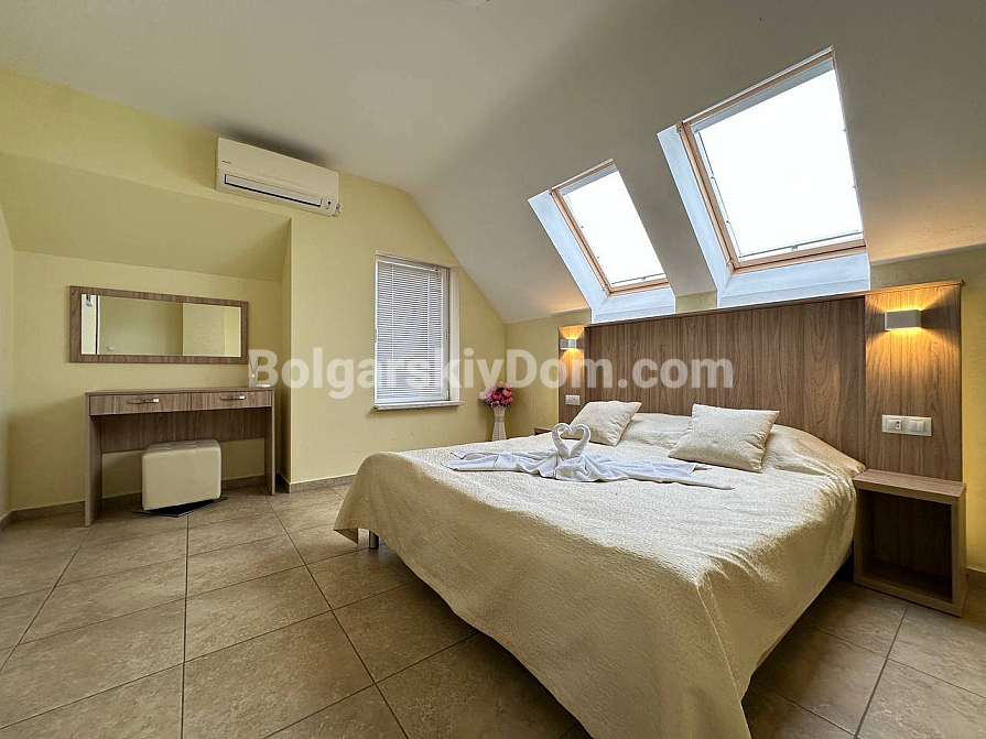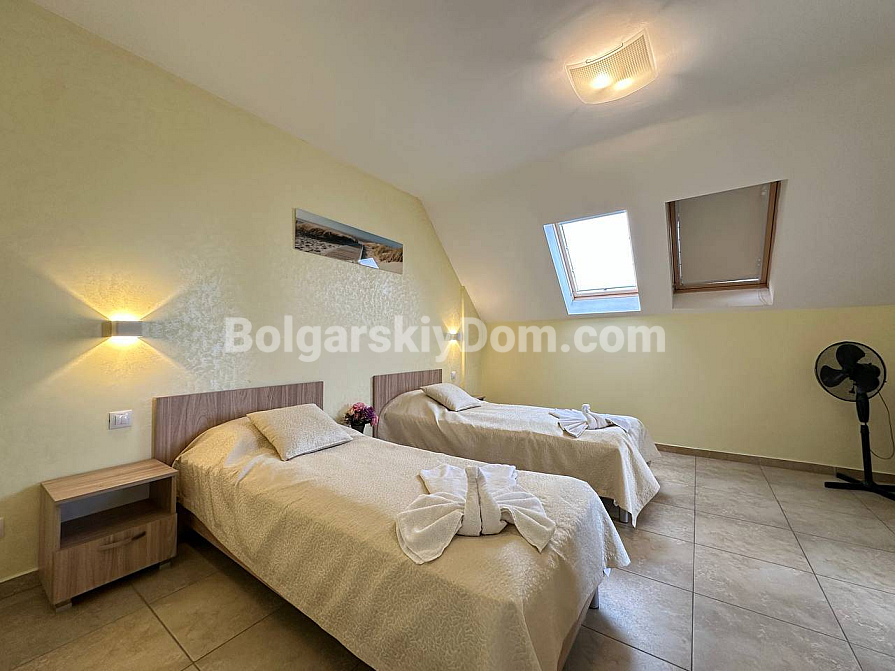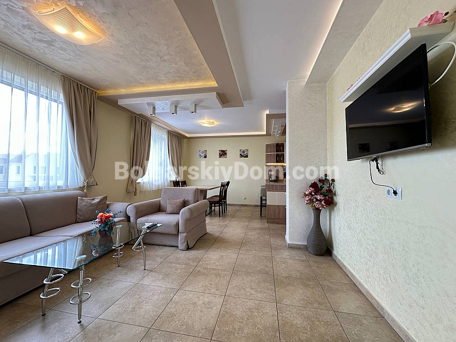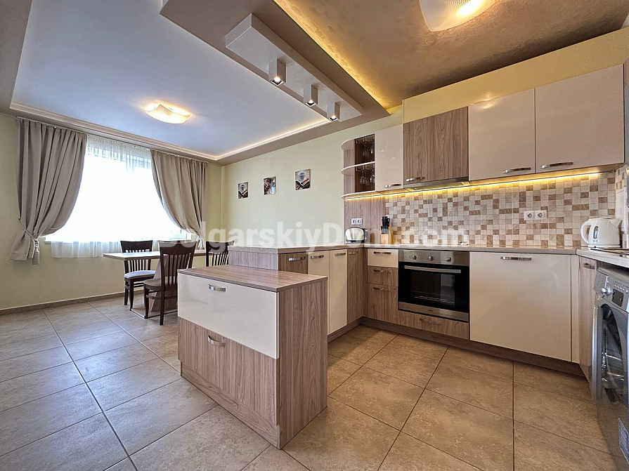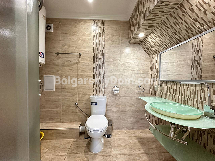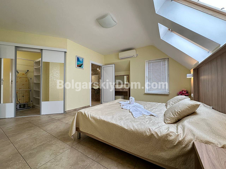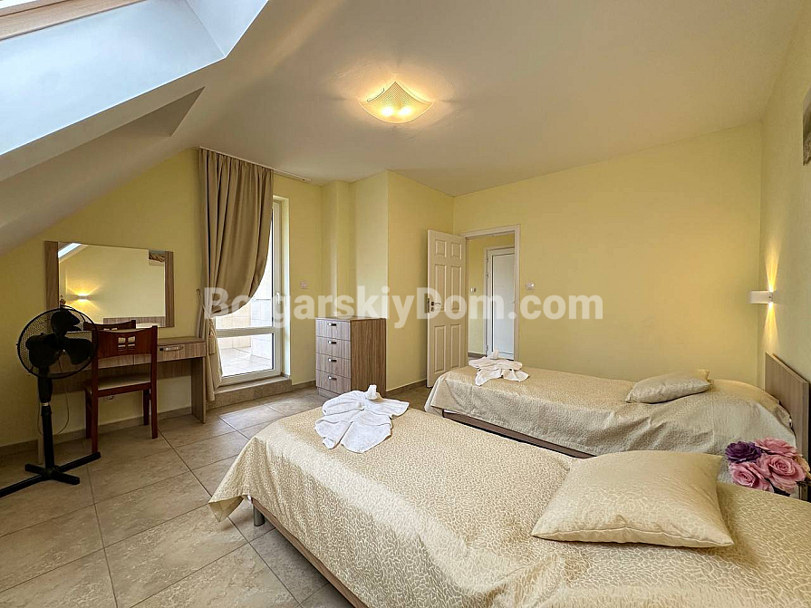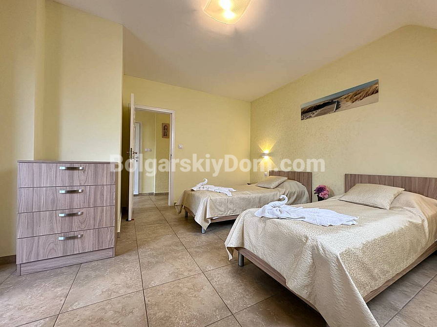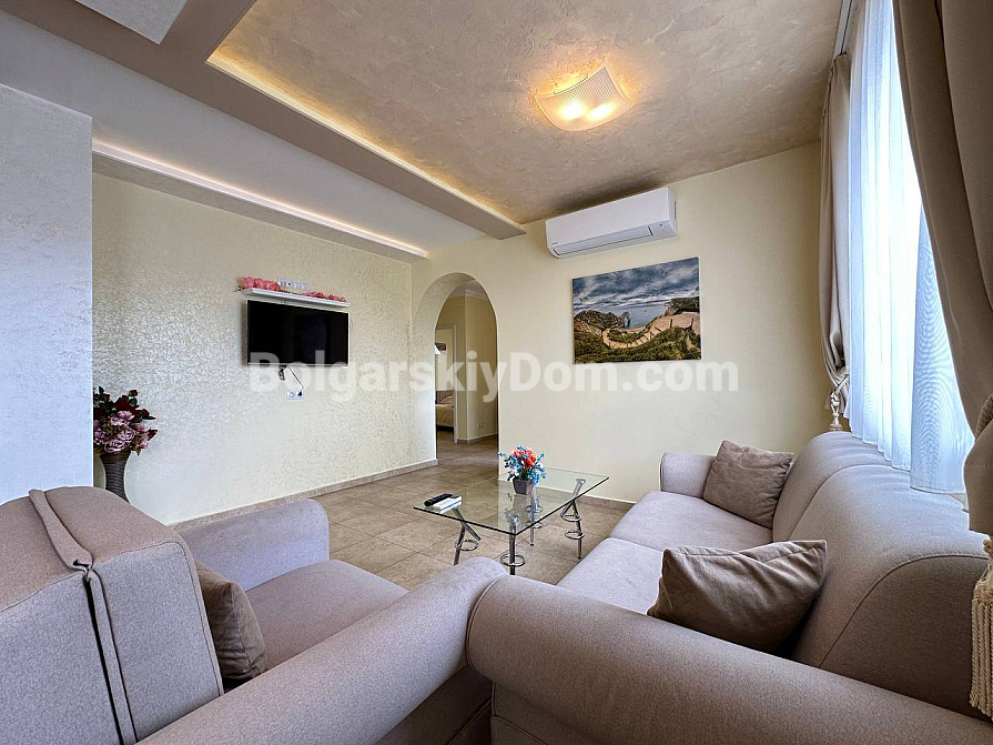 If you are looking for maximum space and a carefully thought-out design, Bolgarskiy Dom has found the perfect offer for you. On the top (sixth) floor of the Sea Dreams complex, a luxurious two-bedroom apartment with a total area of 127 sq.m. is for sale! The interior is decorated in light pastel tones, creating an exceptionally cozy and relaxing atmosphere. The spacious living room features a large sofa, TV, and stylish décor. The modern kitchen with wooden fronts is fully equipped with large appliances: refrigerator, oven, microwave, and even a washing machine. The master bedroom has attic windows and a large bed, while the second bedroom is furnished with two single beds. The entire apartment is air-conditioned and completely ready for move-in.