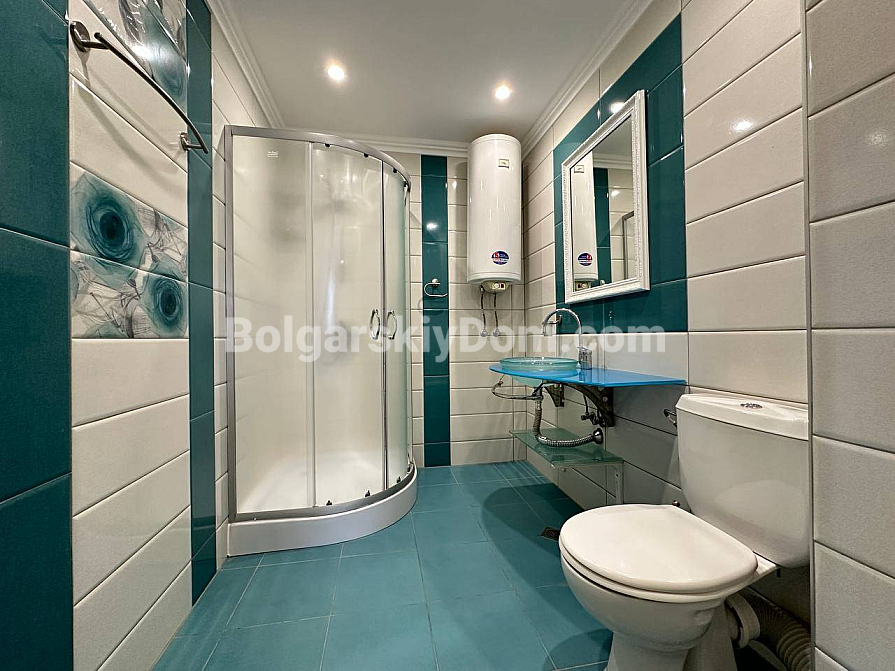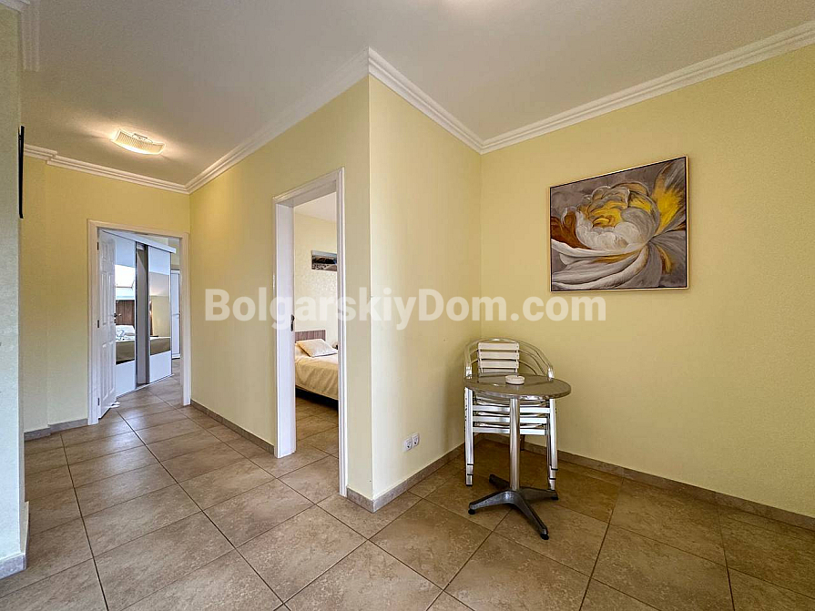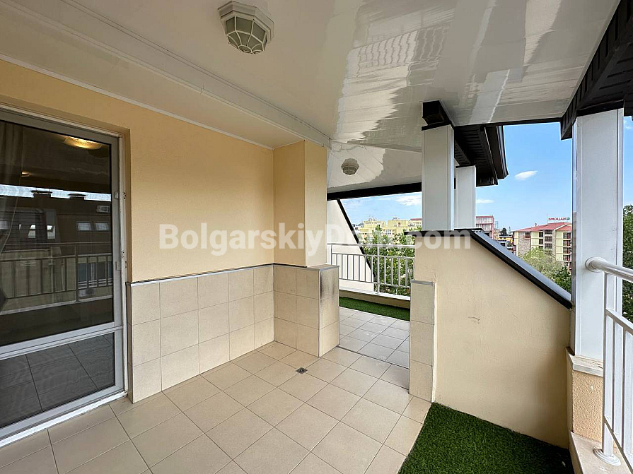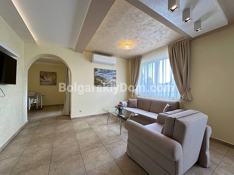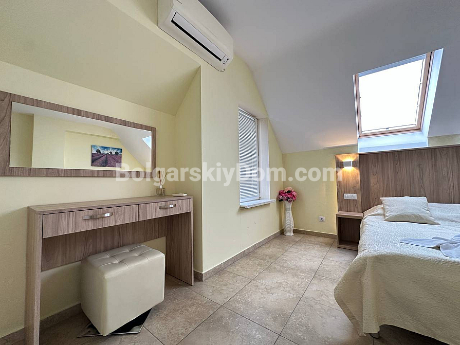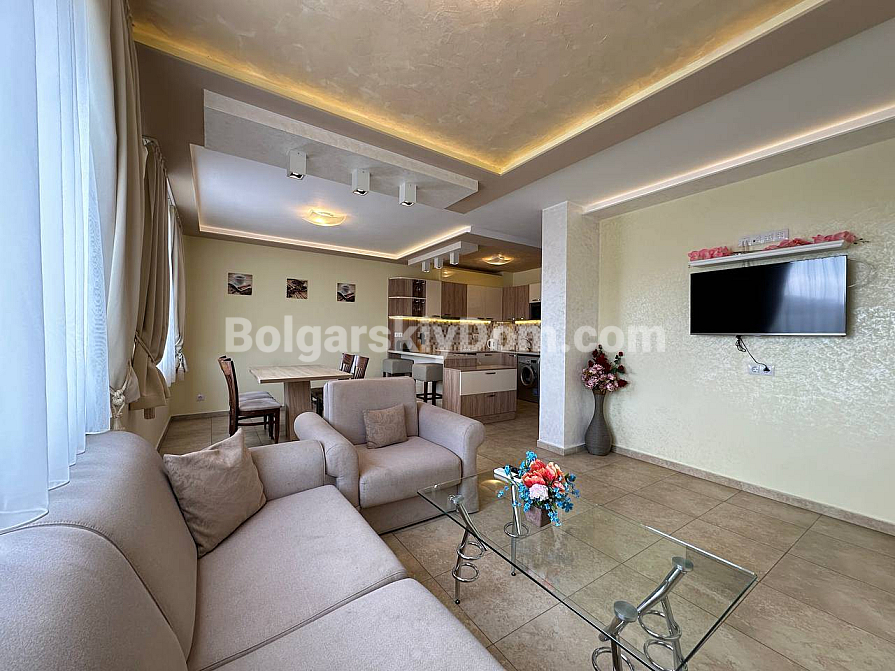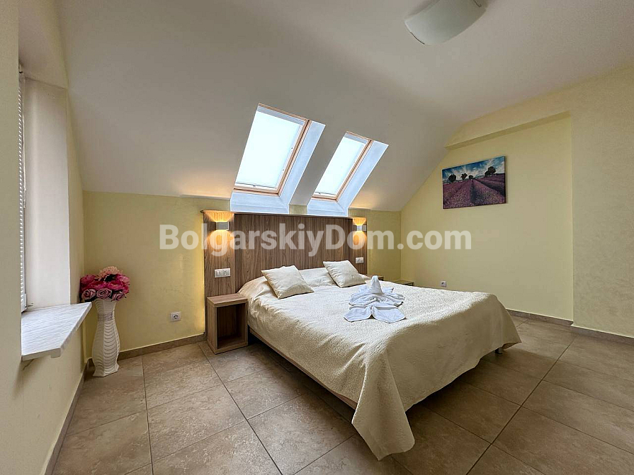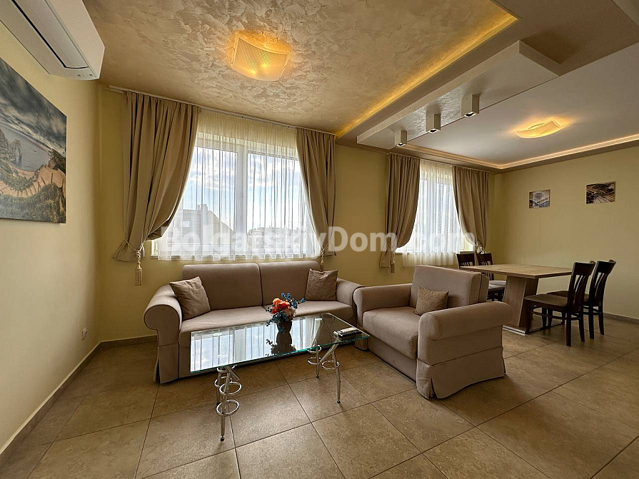If you are looking for maximum space and a carefully thought-out design, Bolgarskiy Dom has found the perfect offer for you. On the top (sixth) floor of the Sea Dreams complex, a luxurious two-bedroom apartment with a total area of 127 sq.m. is for sale! The interior is decorated in light pastel tones, creating an exceptionally cozy and relaxing atmosphere. The spacious living room features a large sofa, TV, and stylish décor. The modern kitchen with wooden fronts is fully equipped with large appliances: refrigerator, oven, microwave, and even a washing machine. The master bedroom has attic windows and a large bed, while the second bedroom is furnished with two single beds. The entire apartment is air-conditioned and completely ready for move-in.