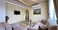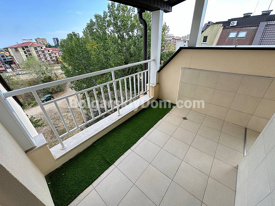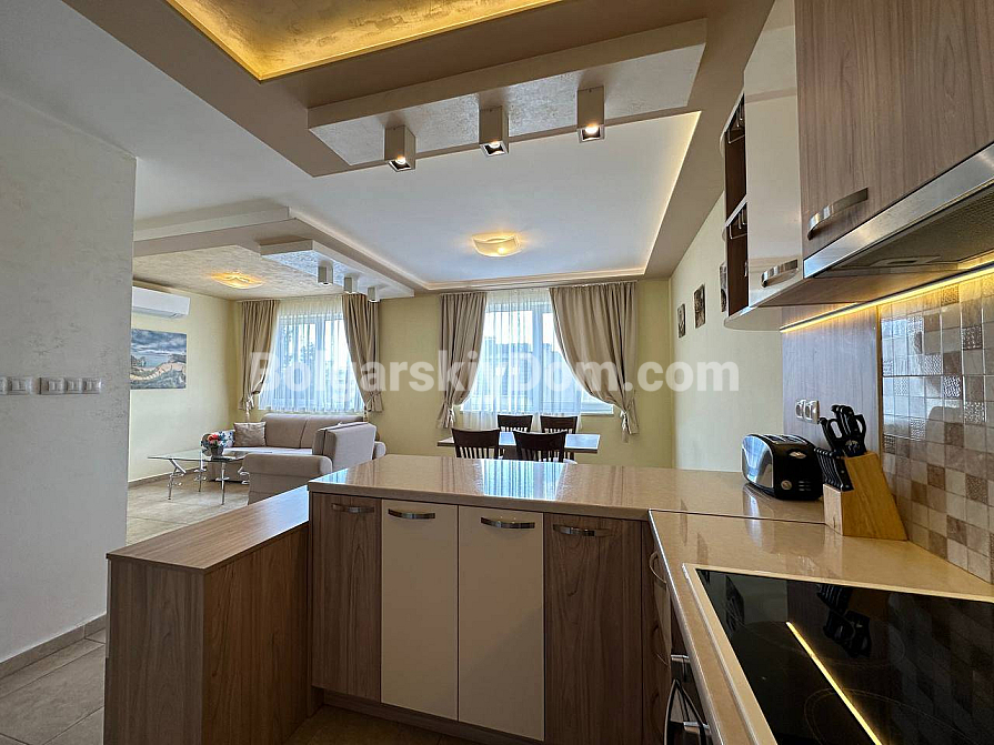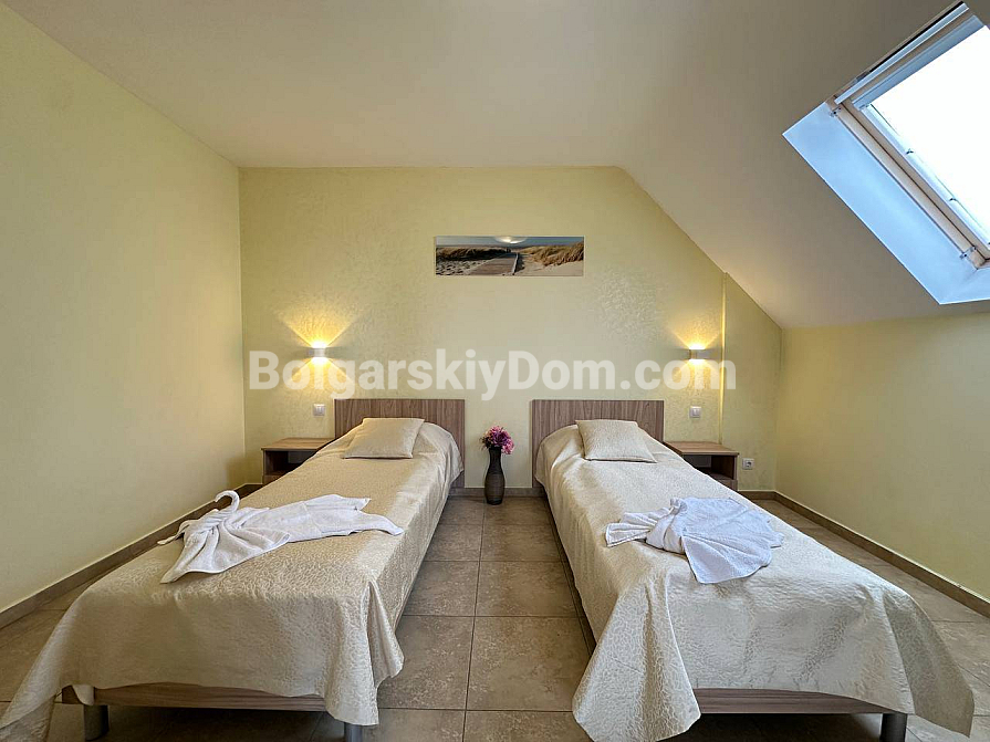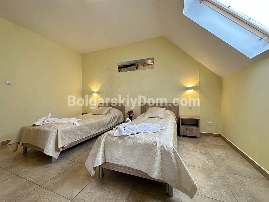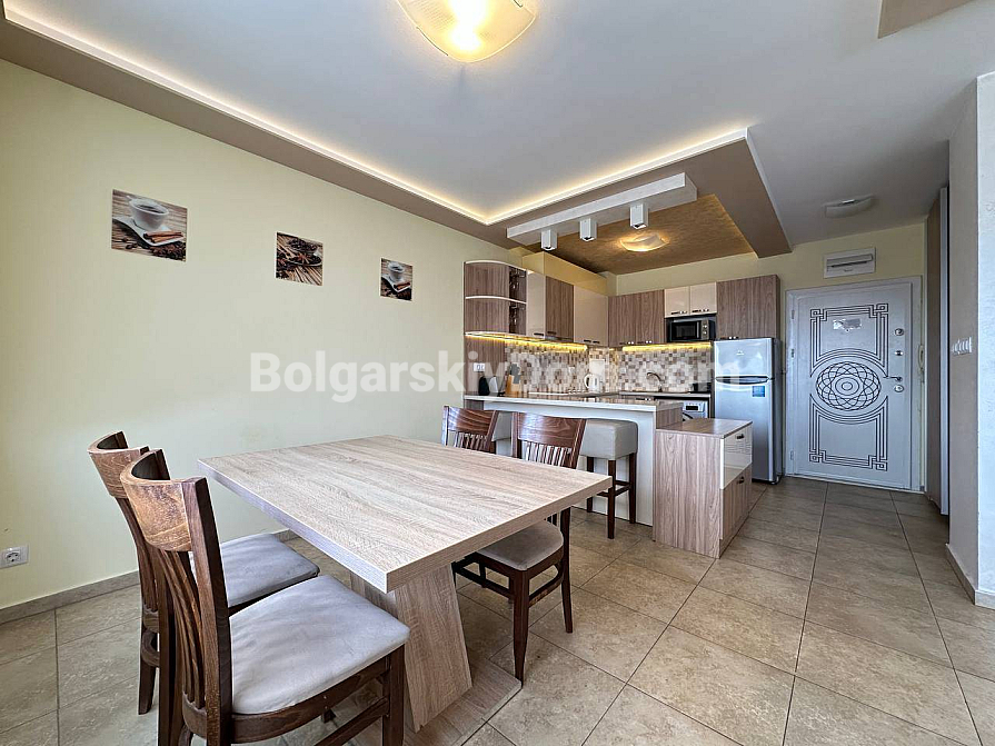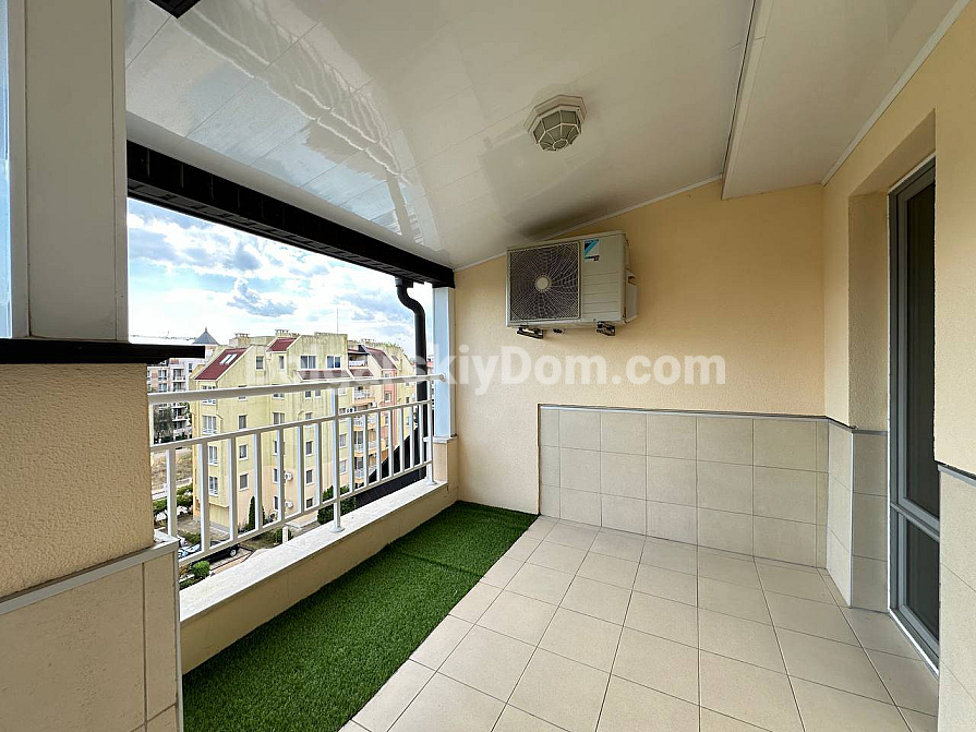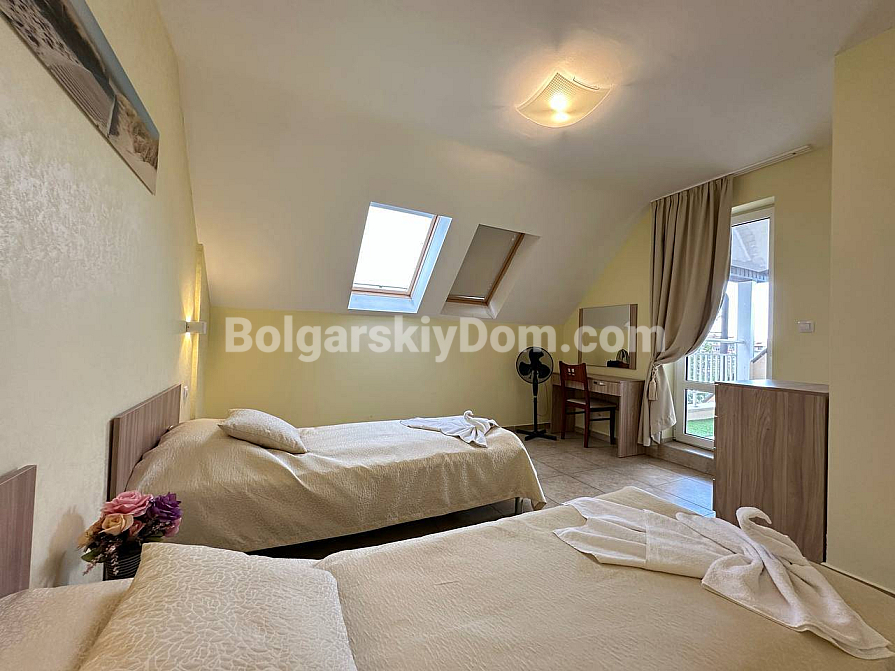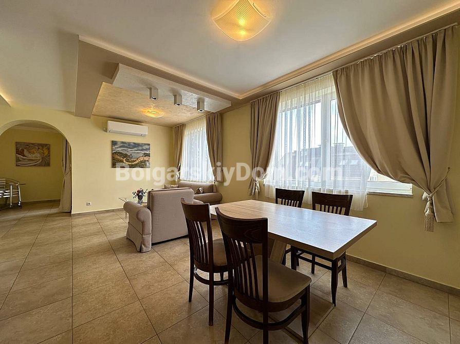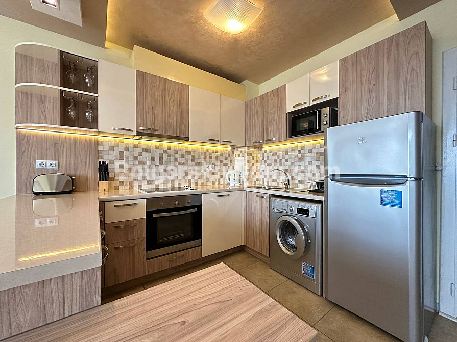 If you are looking for maximum space and a carefully thought-out design, Bolgarskiy Dom has found the perfect offer for you. On the top (sixth) floor of the Sea Dreams complex, a luxurious two-bedroom apartment with a total area of 127 sq.m. is for sale! The interior is decorated in light pastel tones, creating an exceptionally cozy and relaxing atmosphere. The spacious living room features a large sofa, TV, and stylish décor. The modern kitchen with wooden fronts is fully equipped with large appliances: refrigerator, oven, microwave, and even a washing machine. The master bedroom has attic windows and a large bed, while the second bedroom is furnished with two single beds. The entire apartment is air-conditioned and completely ready for move-in.