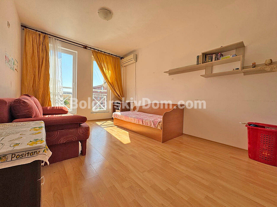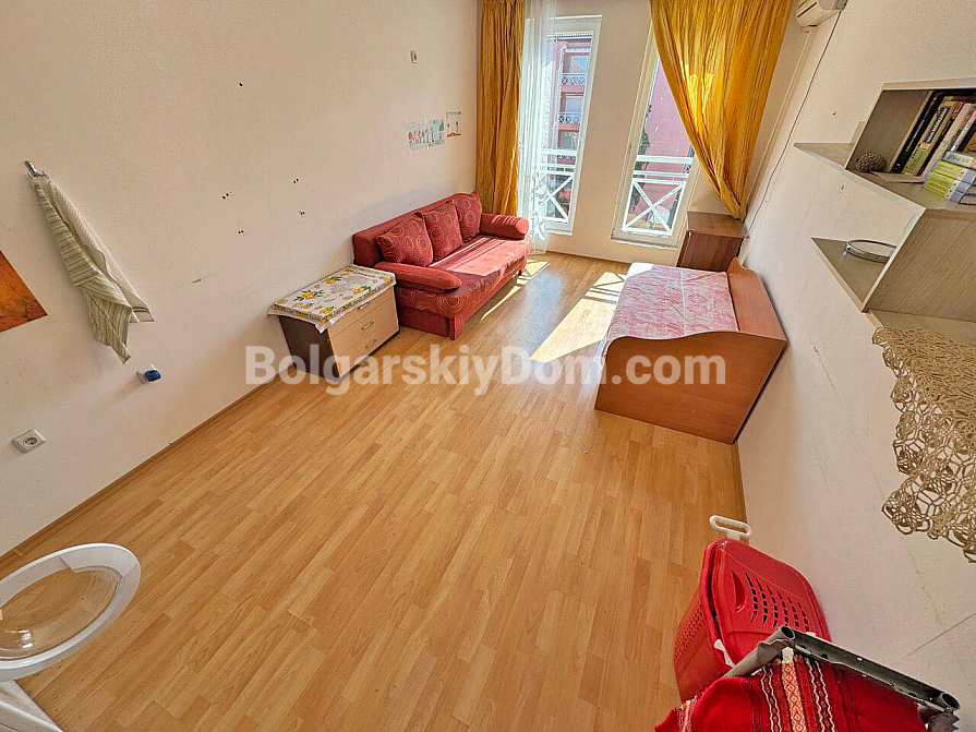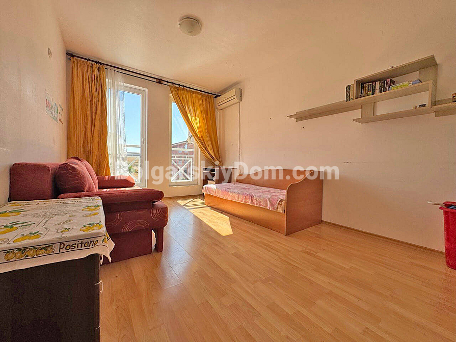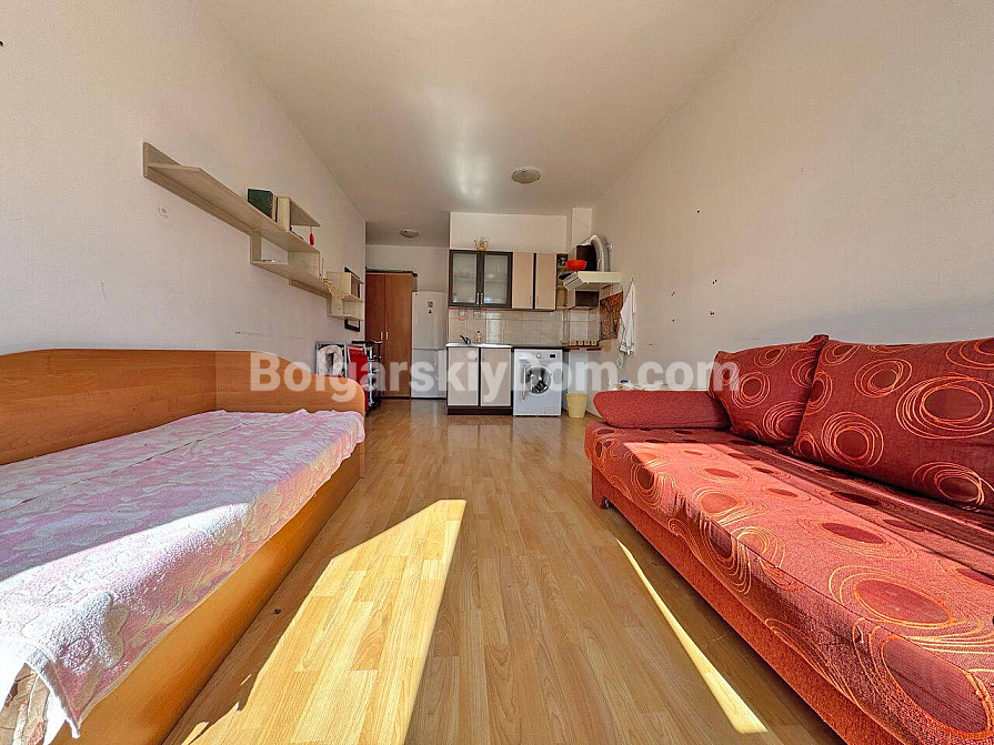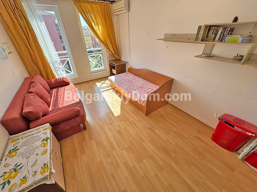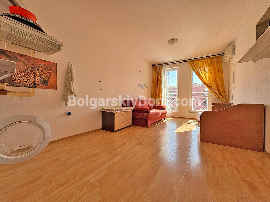 New addition to our budget property catalog! If you’ve been looking for the most affordable entry point into the Bulgarian real estate market — here it is. Bolgarskiy Dom presents a studio with an area of 34 sq.m. in the large-scale Sunny Day 6 complex. This apartment is the perfect budget-friendly solution, located on the fourth floor. The layout includes a bright room with a kitchen area, a bathroom, and a balcony. The property is furnished and requires no additional investment, with a price of less than 1,000 euros per sq.m.