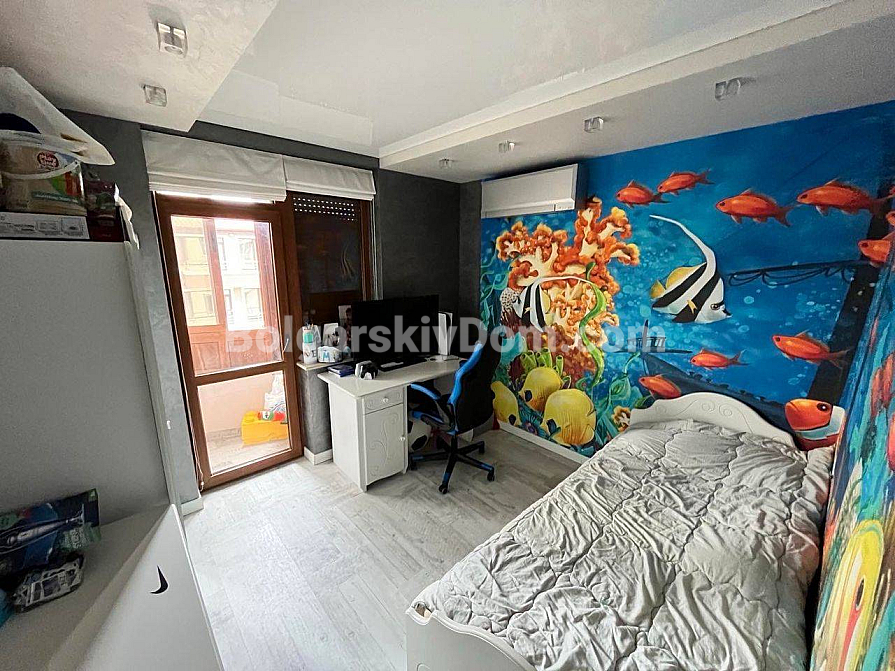 The apartment is fully furnished and finished with high-quality materials: Italian furniture, decorative plasters, stretch ceilings, glass doors, porcelain stoneware, and parquet flooring. The layout is ideal for a family — a spacious living room with kitchen, two glazed terraces, a bedroom with a walk-in closet and a private bathroom, as well as a children’s room with its own bathroom. Heating is provided by reliable Mitsubishi air conditioners. The sea is only 500 meters away.