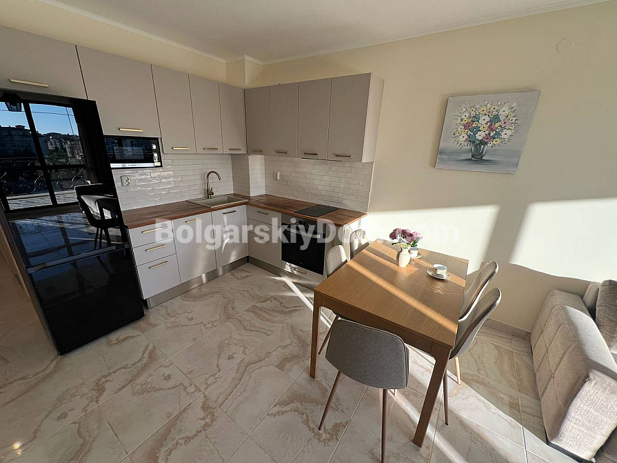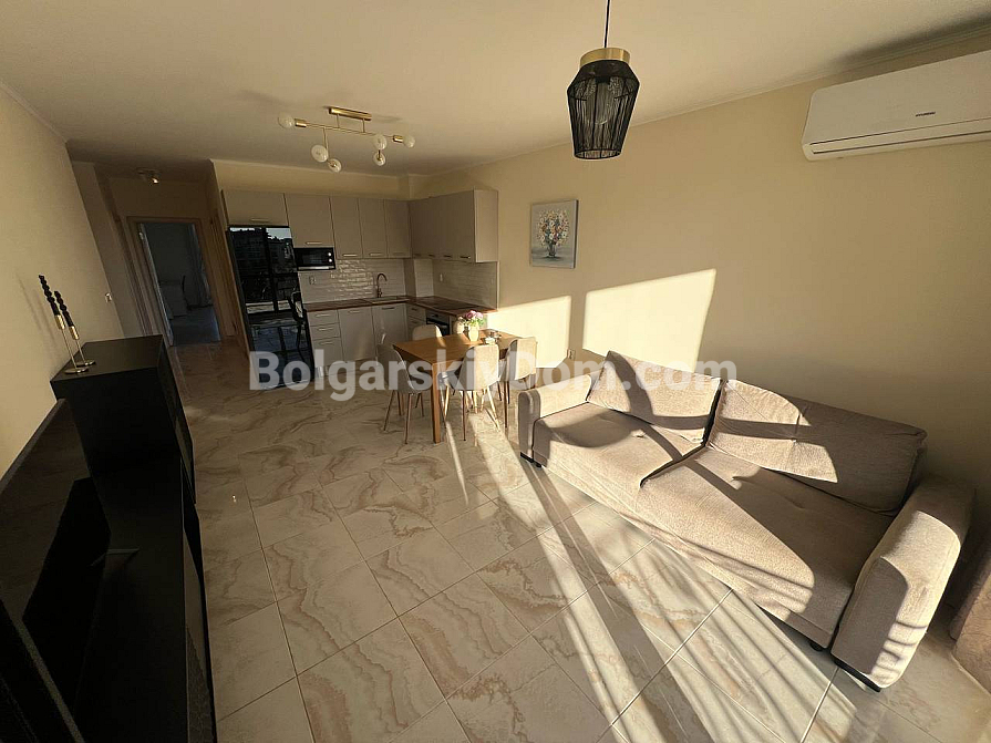 Here is an elegant apartment in a premium-class complex with the possibility of payment in installments! A modern, fully furnished apartment with designer renovation is offered in the luxurious Poseidon complex. The living room, combined with the kitchen, is spacious and bright, decorated in neutral tones with wooden accents. The kitchen is equipped with modern built-in appliances: an oven, hob, extractor hood, microwave, and large refrigerator. There is a comfortable dining area and a soft sofa. The balcony with wrought-iron railings overlooks the green courtyard of the complex – an ideal place for morning coffee. The apartment is fully ready for living, stylish, bright, and designed for comfortable life by the sea. Total area: 106 sq.m., located on the 4th floor of an eight-story building.