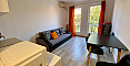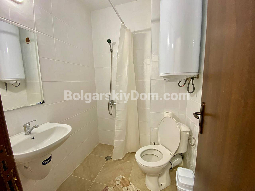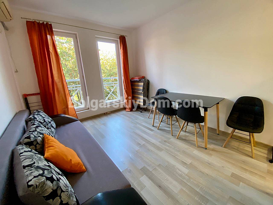 Hot budget offer from Bolgarskiy Dom! Excellent studio with renovation and located in a residential complex with rich infrastructure! A cozy studio of 28 sq.m. is offered for sale in the Sunny Day 6 complex. The main advantage of this property is the modern renovation and new furniture, allowing you to move in immediately without spending time on furnishing. The studio is bright and well-maintained, with an interior designed in light tones and warm wooden accents. The compact kitchen area is fully equipped, including a hob, refrigerator, and microwave oven. The windows offer a picturesque view of the surrounding mountains.