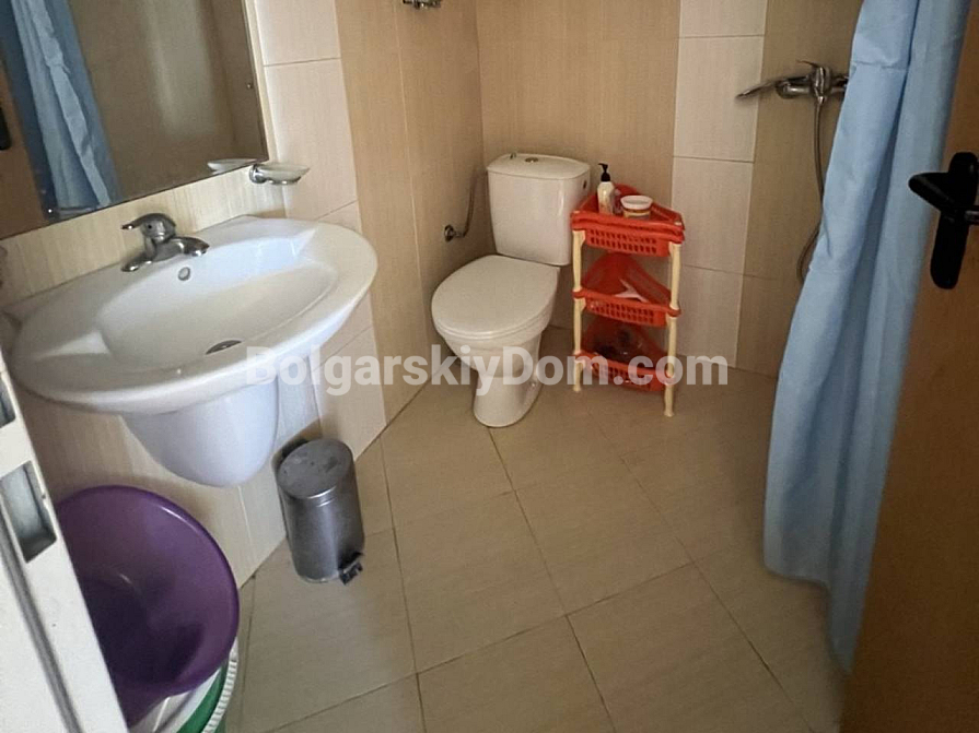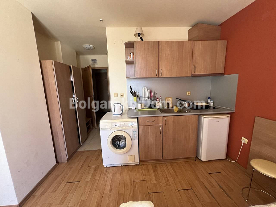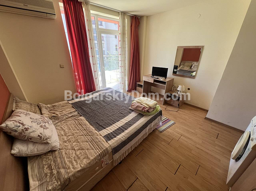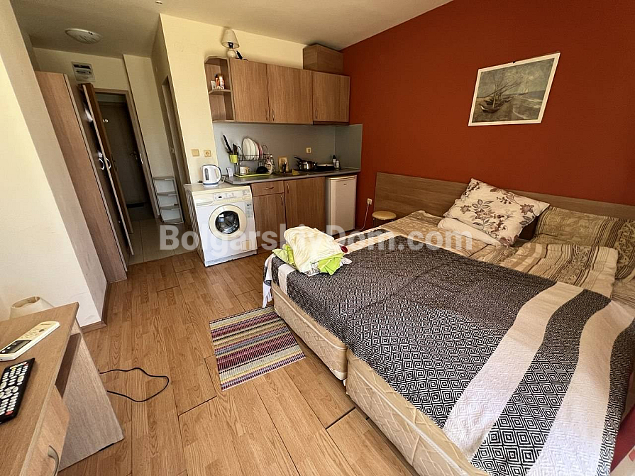 Urgent offer from Bolgarskiy Dom! A cozy studio with full furnishings in the greenest area! We present a compact and comfortable 30 sq.m. studio in the Aphrodite 1 complex. The main advantage of this property is full furnishing and a homely atmosphere. The living space combines a bedroom with a large double bed, a kitchenette, and a small dining area. The kitchen is equipped with all necessary appliances, including a washing machine. The interior in warm tones looks very cozy and bright, despite the standard layout. Ready for viewings — call now!