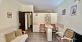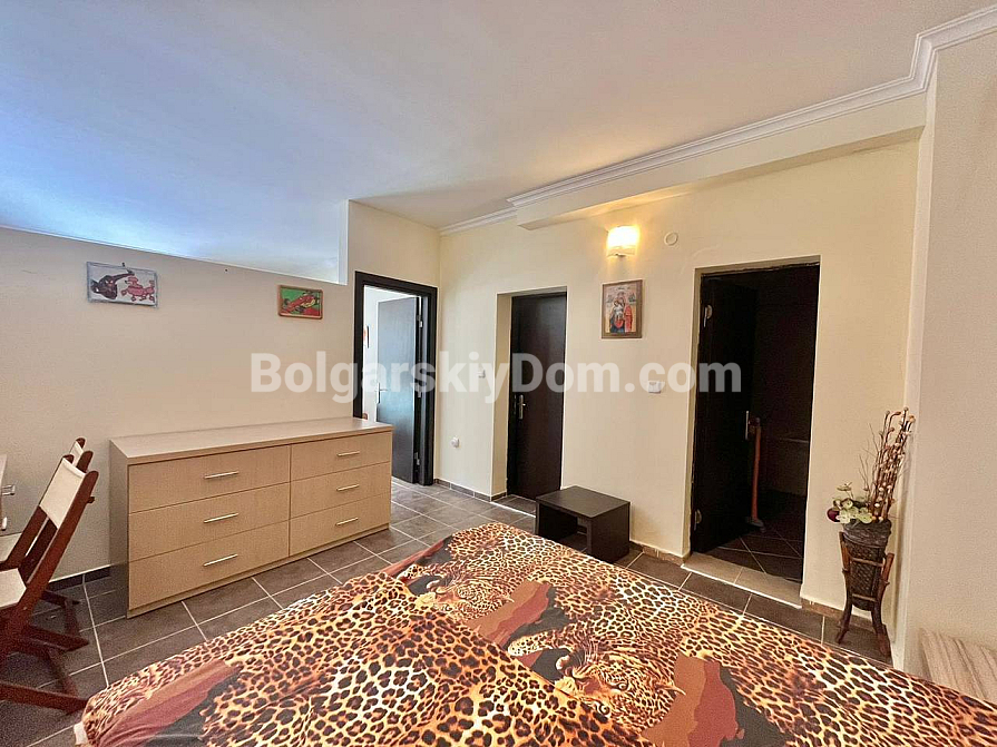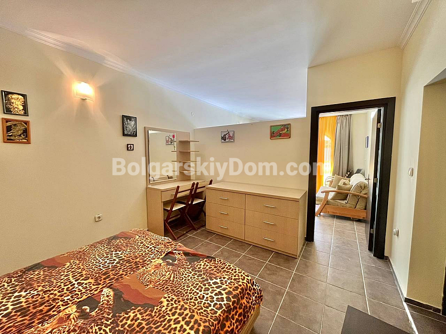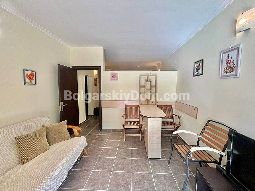 We present to you an unconventional and spacious studio with solid zoning in the St. George Plaza complex – an excellent offer at a good price in Saint Vlas. This 55 sq.m. apartment is located in a rapidly developing part of the resort and, in terms of functionality, corresponds to a full two-bedroom apartment, since the sleeping area is separated by a solid wall. The layout includes a sunny living room, a separate bedroom, a bathroom with a toilet, a laundry area, and a charming arched window that adds a special character to the interior. There is no kitchen block at the moment, however, the apartment is fully furnished and ready for move-in.