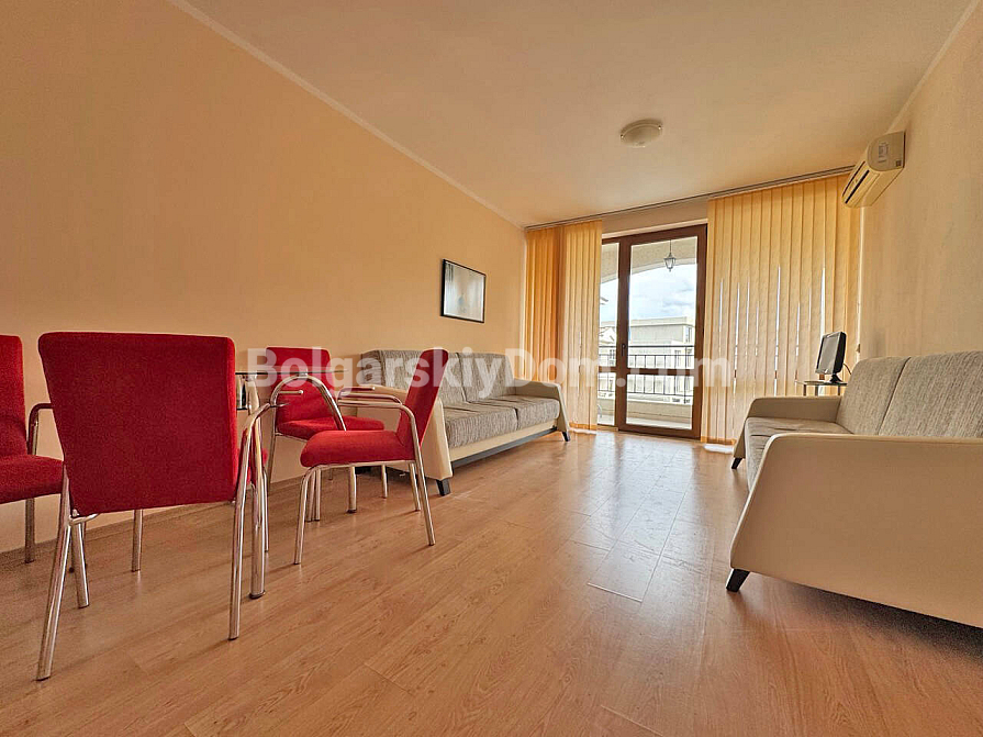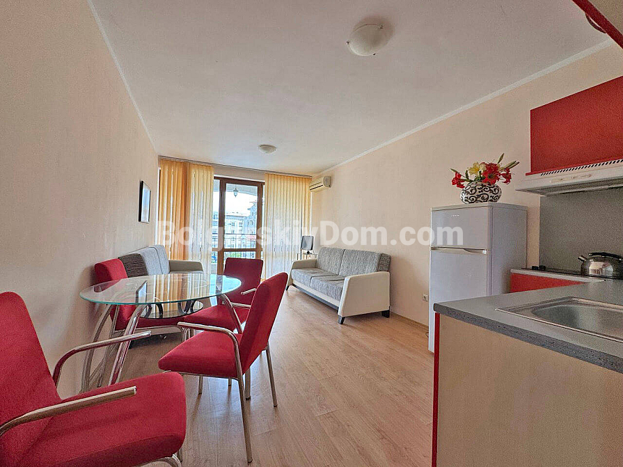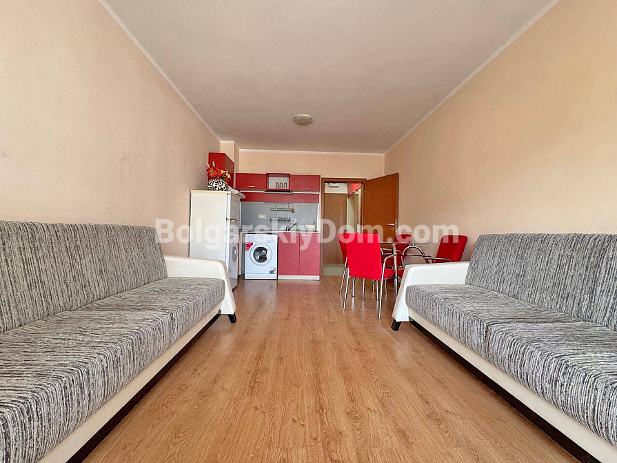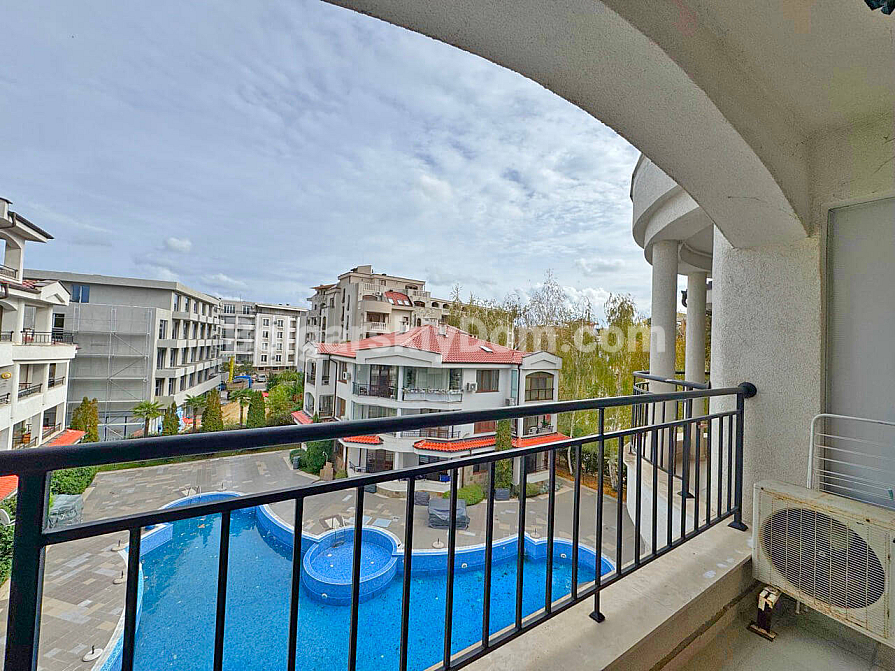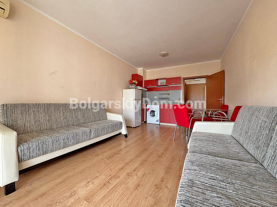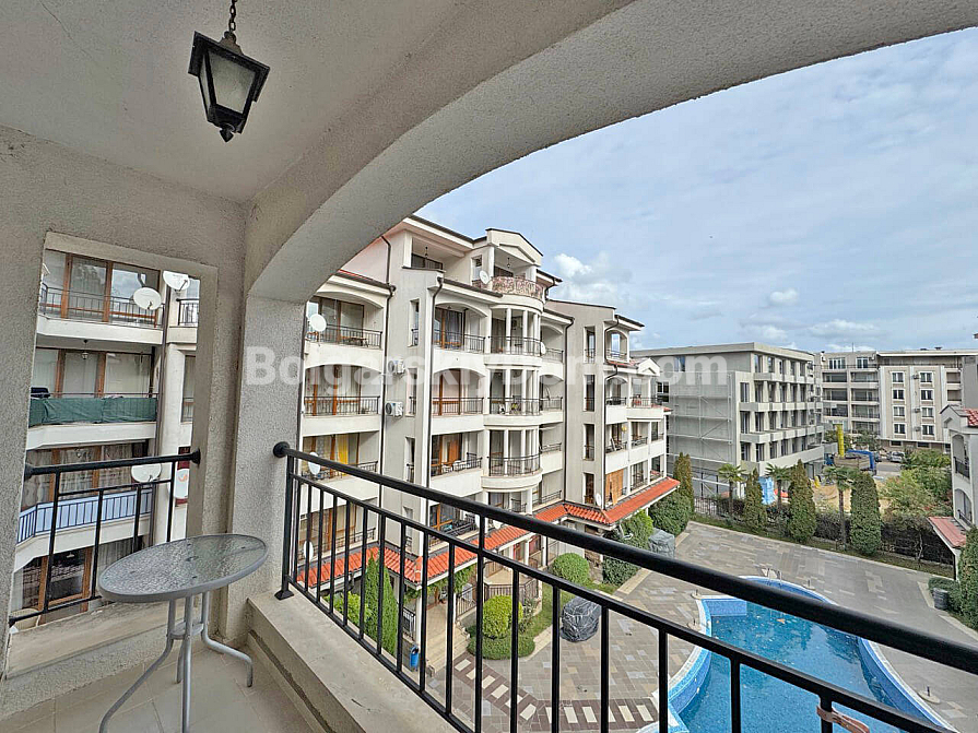 New listing at a great price! Our catalog features a spacious 43 sq.m. studio with a beautiful pool view in the modern Chateau Valon complex in Sunny Beach. The apartment is located on the third floor, fully furnished and in excellent condition – ready for immediate move-in or rental. The layout includes an entrance hallway, a large room with a separated kitchen area, a bathroom, and a cozy balcony overlooking the green courtyard. This is an ideal, highly liquid option for comfortable holidays or a profitable investment!