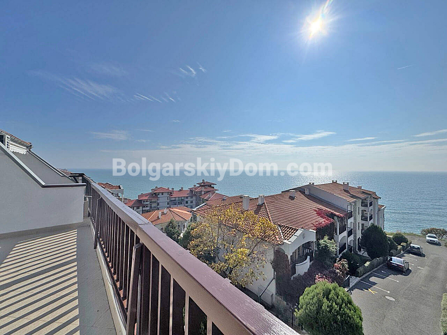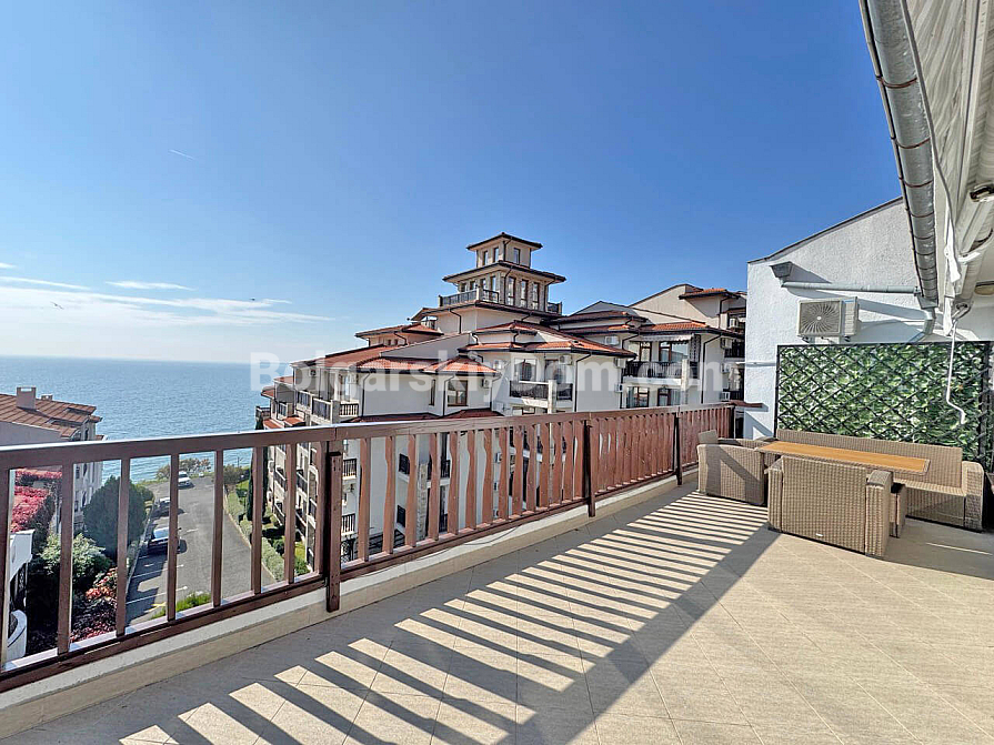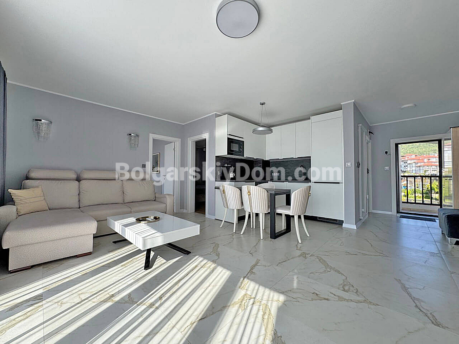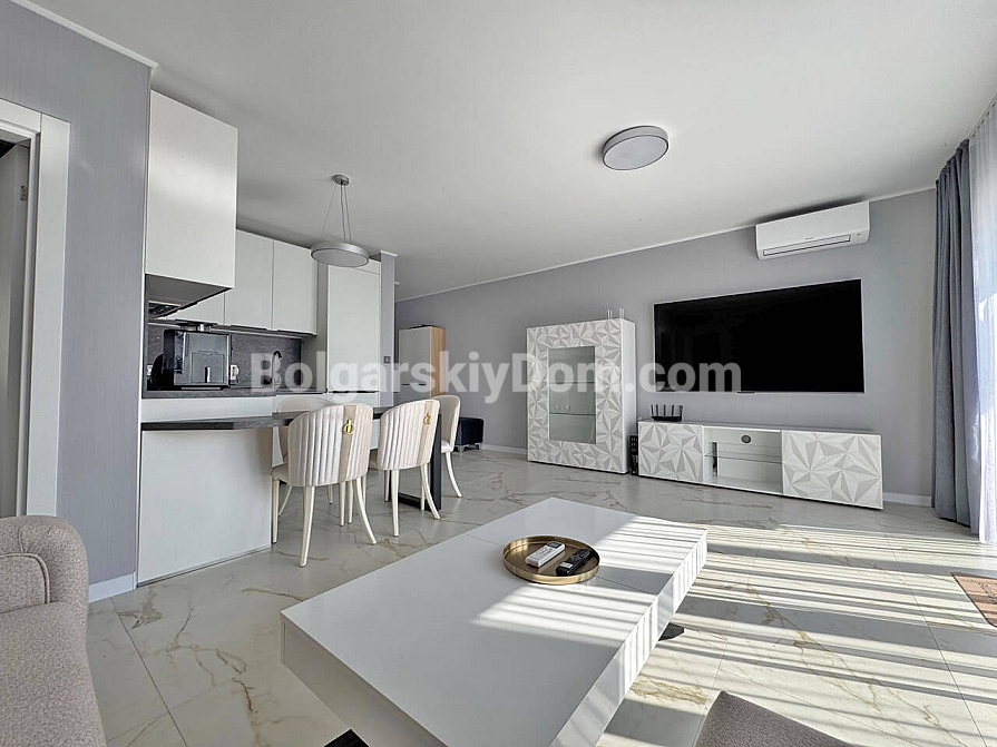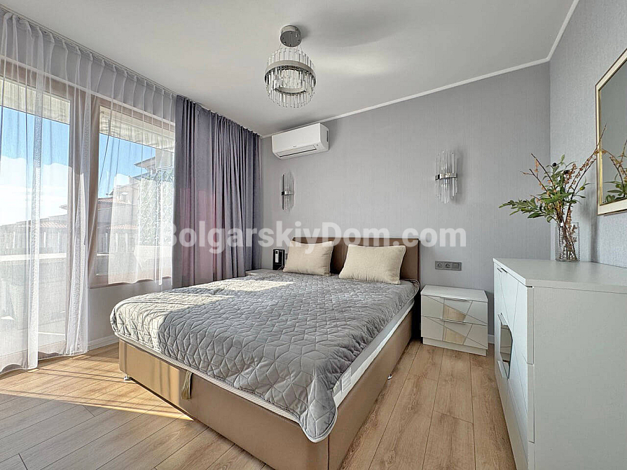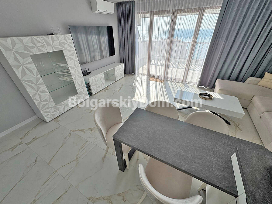 A new flagship apartment has arrived in the Bolgarskiy Dom catalog: a two-bedroom apartment of 103 sq.m. with a stunning, direct sea view in the Sun Coast Resort complex, located right on the first line in Saint Vlas! The apartment is in perfect condition, fully furnished and equipped. The layout is ideal for a family: an entrance hall, a spacious living room combined with a kitchen and dining area, two full bedrooms, a bathroom, and a balcony set up as a cozy relaxation spot. You are buying a ready-to-move-in home where all you need to think about is enjoying your stay!