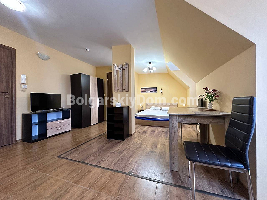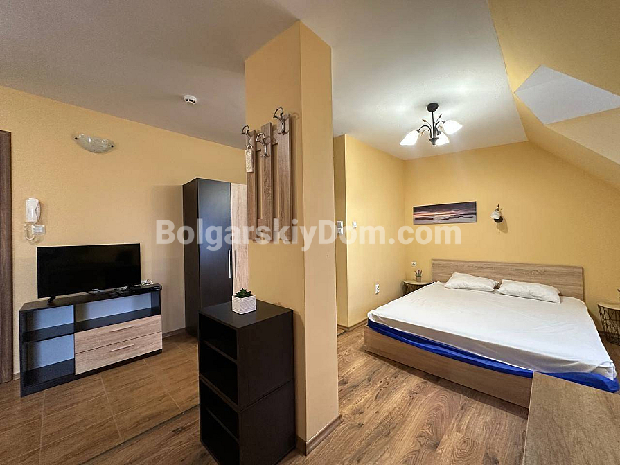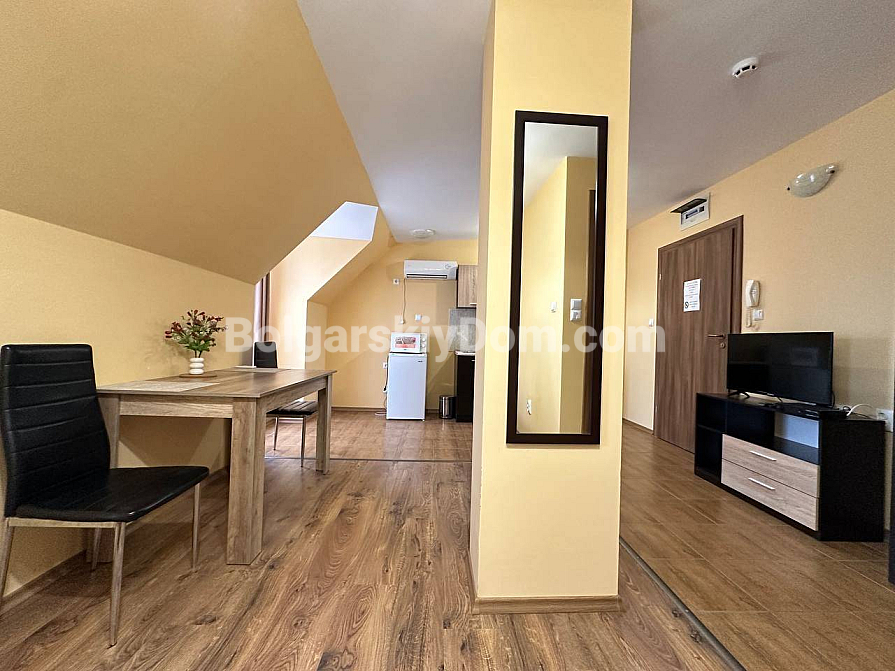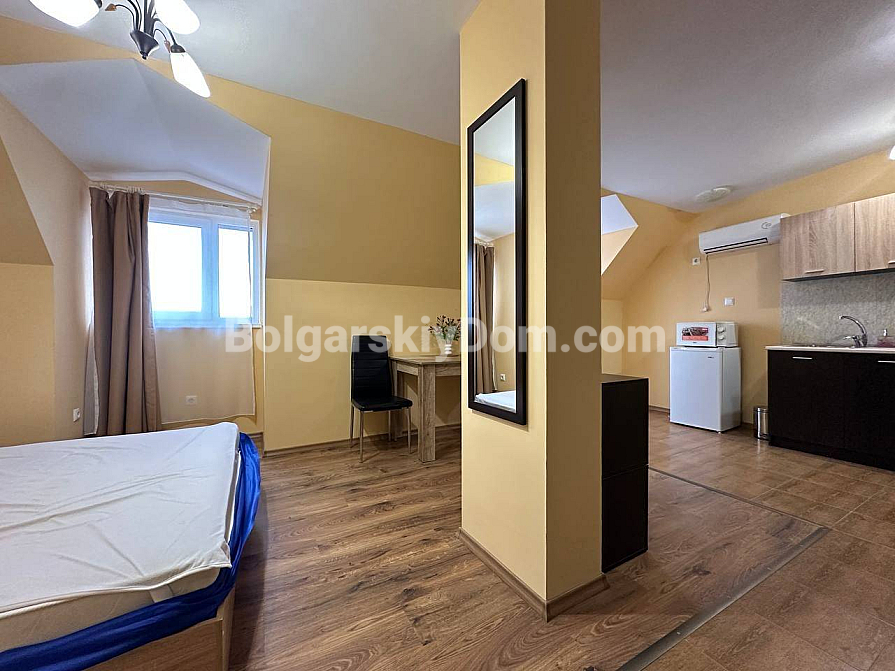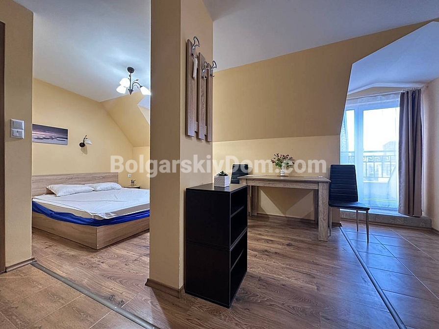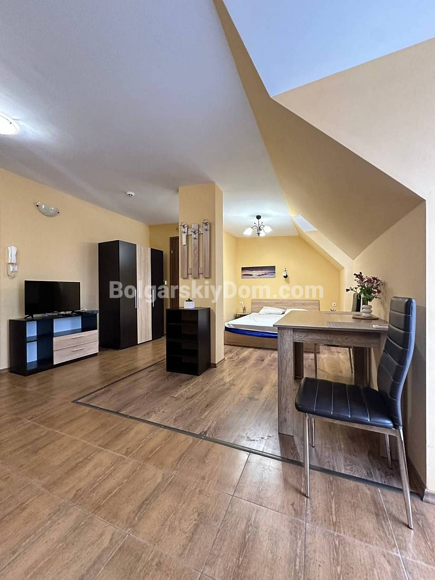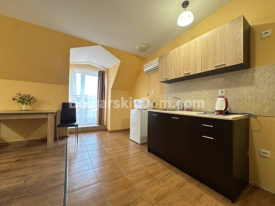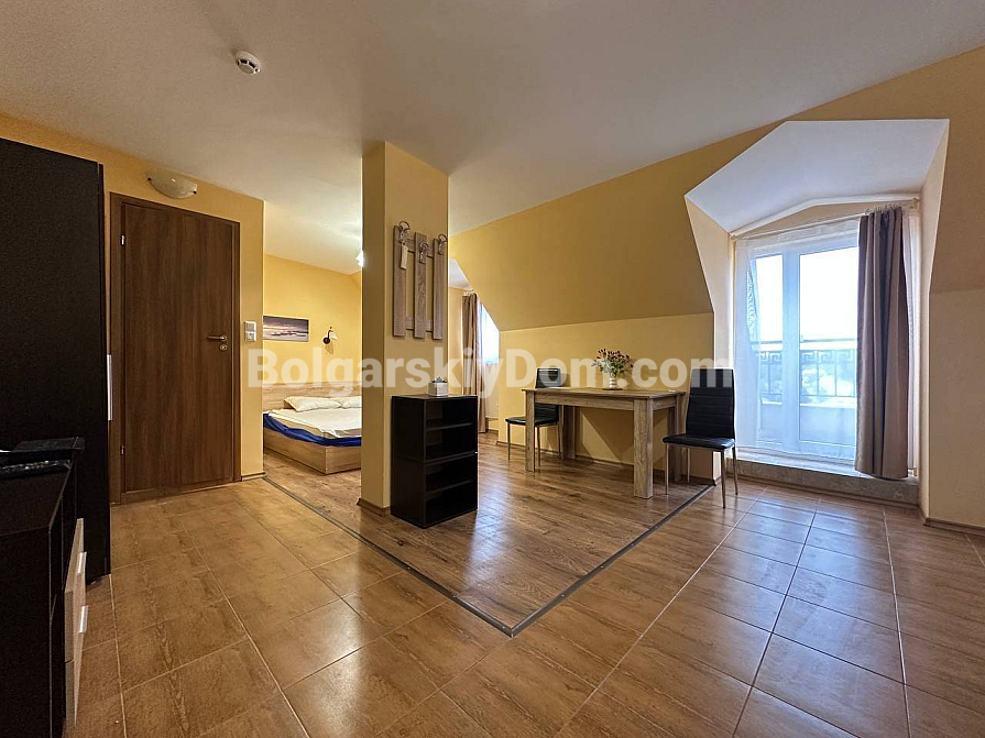 Light, air and sea views are a studio with its own individual character in the Horizon complex, located in a quiet, green area at the junction of Sunny Beach and Sveti Vlas resorts. This apartment on the last, fifth floor of the complex is not just square meters, but a space with a mood. The area is 40 sq. m. It is thought out to the smallest detail: an interesting circular layout creates a sense of movement and lightness. On the right is a neat kitchen area where everything is at hand. On the left, in a cozy niche behind a column, there is a sleeping place hidden — a private corner of privacy. Between them is a dining area that unites the entire space, making it truly homely. And behind the glass door is a small terrace with a view that is hard to tear yourself away from: an endless resort and the sea on the horizon.