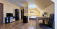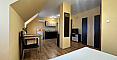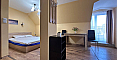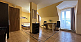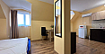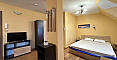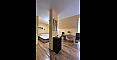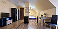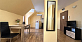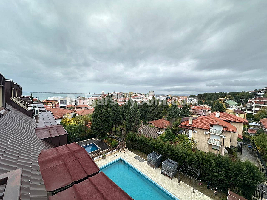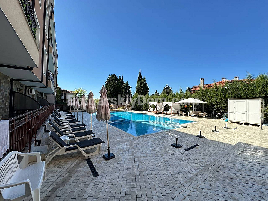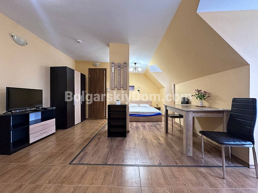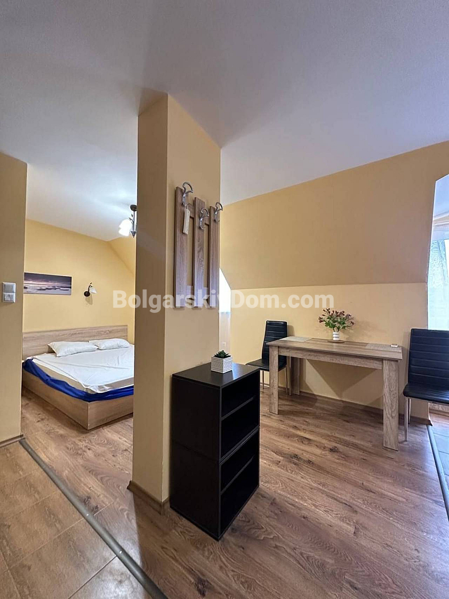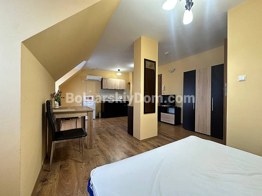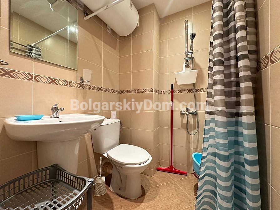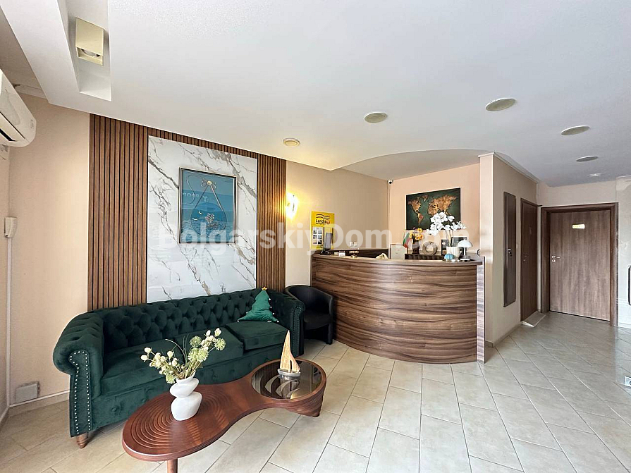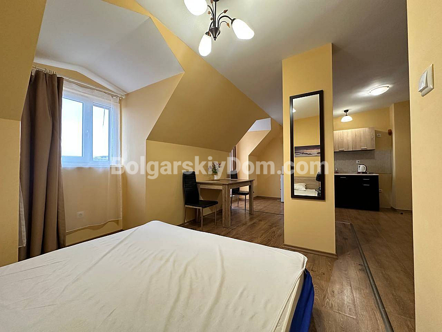 Light, air and sea views are a studio with its own individual character in the Horizon complex, located in a quiet, green area at the junction of Sunny Beach and Sveti Vlas resorts. This apartment on the last, fifth floor of the complex is not just square meters, but a space with a mood. The area is 40 sq. m. It is thought out to the smallest detail: an interesting circular layout creates a sense of movement and lightness. On the right is a neat kitchen area where everything is at hand. On the left, in a cozy niche behind a column, there is a sleeping place hidden — a private corner of privacy. Between them is a dining area that unites the entire space, making it truly homely. And behind the glass door is a small terrace with a view that is hard to tear yourself away from: an endless resort and the sea on the horizon.