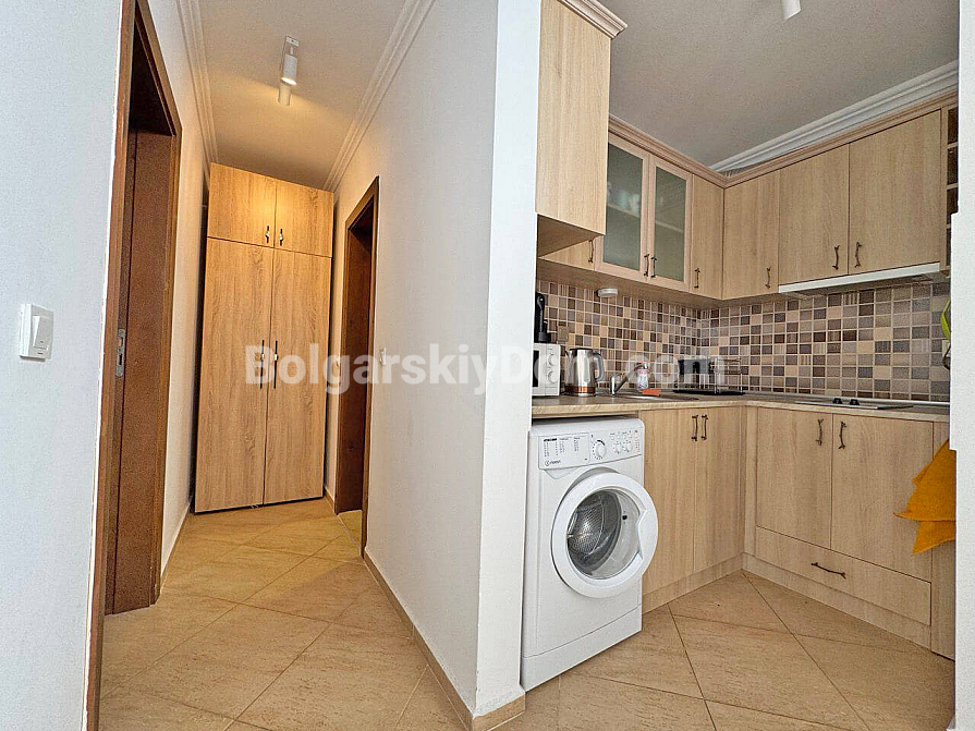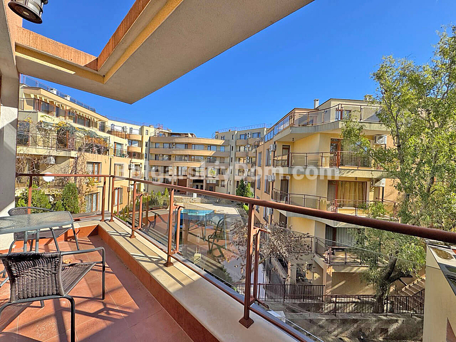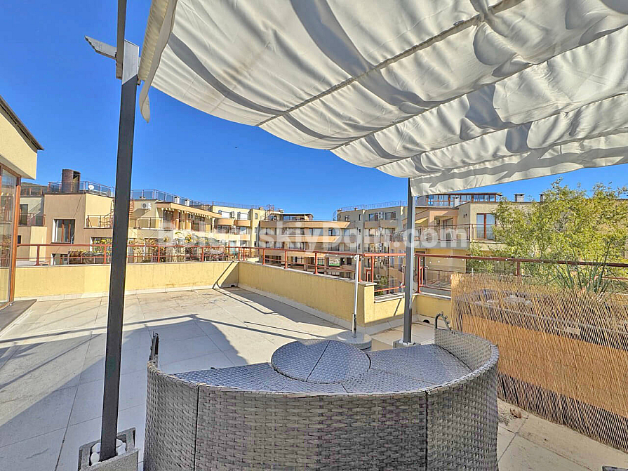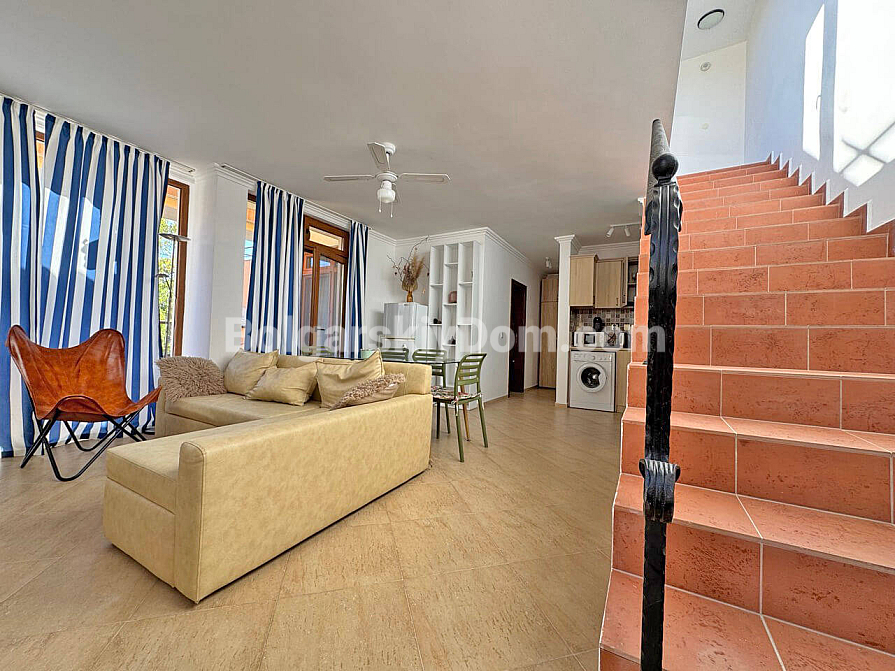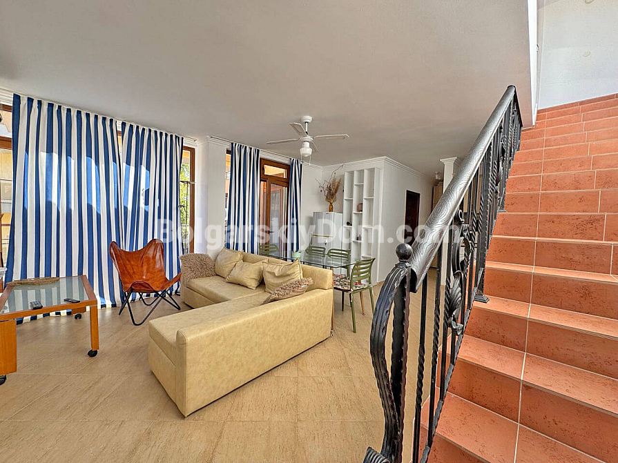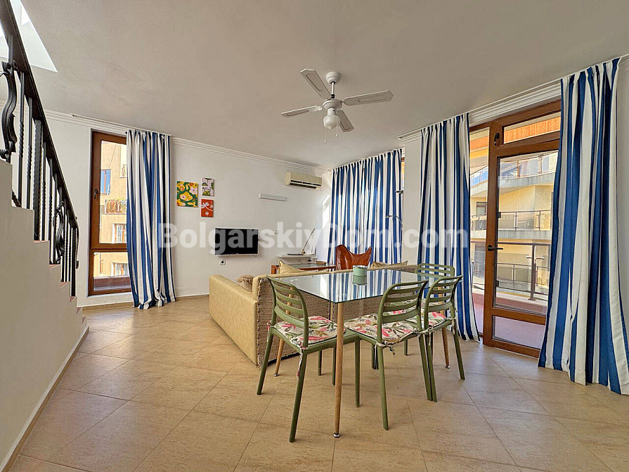 Wow-format now for sale! Our catalog features a stunning two-room maisonette of 129 sq.m. in the Antonia complex, located in the prestigious resort of Saint Vlas! This apartment spans two levels (second and third floors) and offers an ideal space for living with maximum comfort. The maisonette is sold fully furnished and equipped with appliances — completely ready for year-round living, summer holidays, or profitable rental. The layout is very functional: the first level includes an entrance hall, bathroom with shower, a spacious living room combined with a kitchen and dining area, and a terrace. A staircase leads to the second level, where there is a bedroom and another terrace.