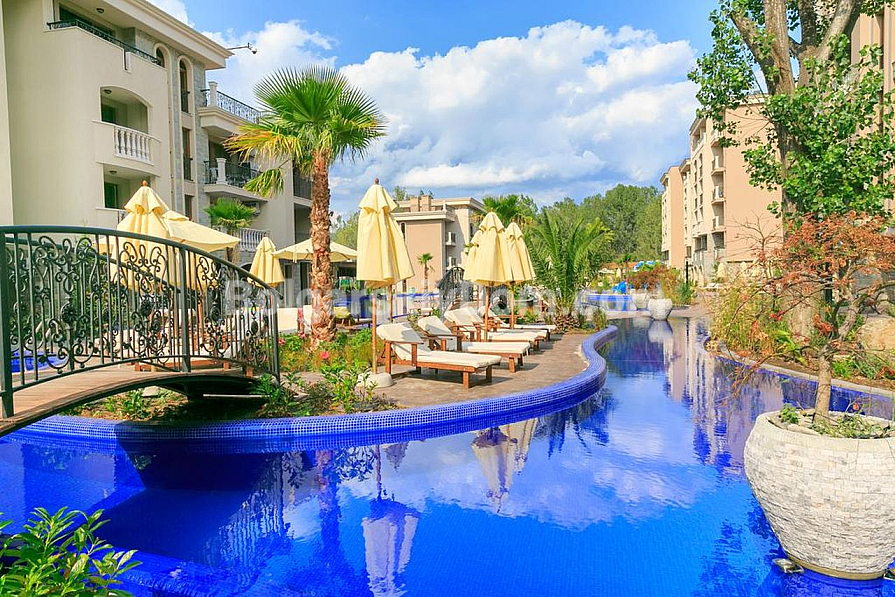 A wonderful offer in one of the most beautiful and well-maintained corners of Sunny Beach is a three-bedroom apartment with an area of 99 square meters in the legendary Cascadas complex. It is located on the ground floor, which is very attractive for families with young children. The apartment has a pleasant, bright interior that creates a feeling of lightness and comfort. Everything is ready for life here: modern furniture — stylish, but not pretentious; a full set of necessary household appliances; two bathrooms — convenient for a large family or guests; two terraces overlooking the pool and the green area of the complex.