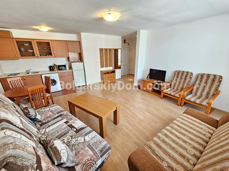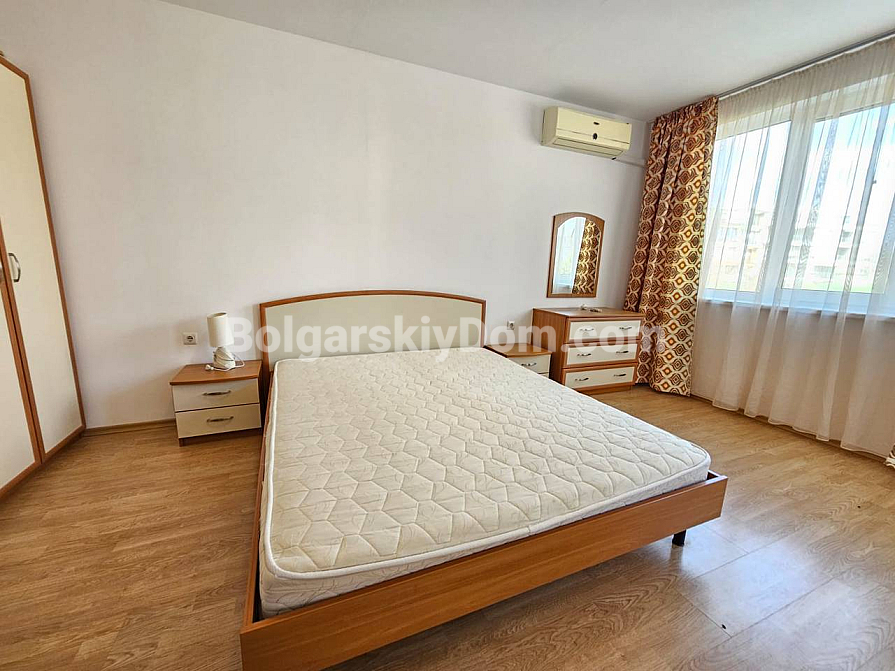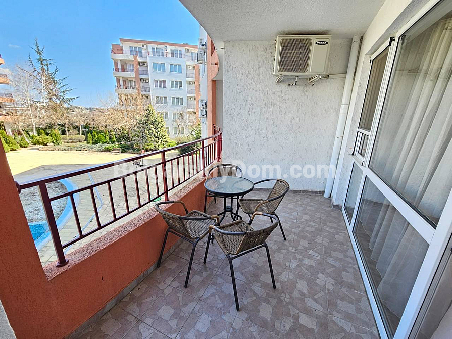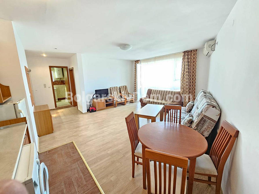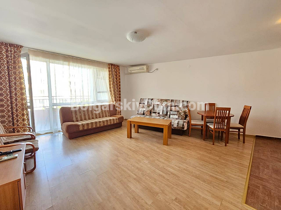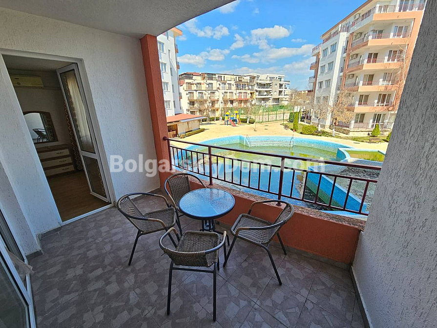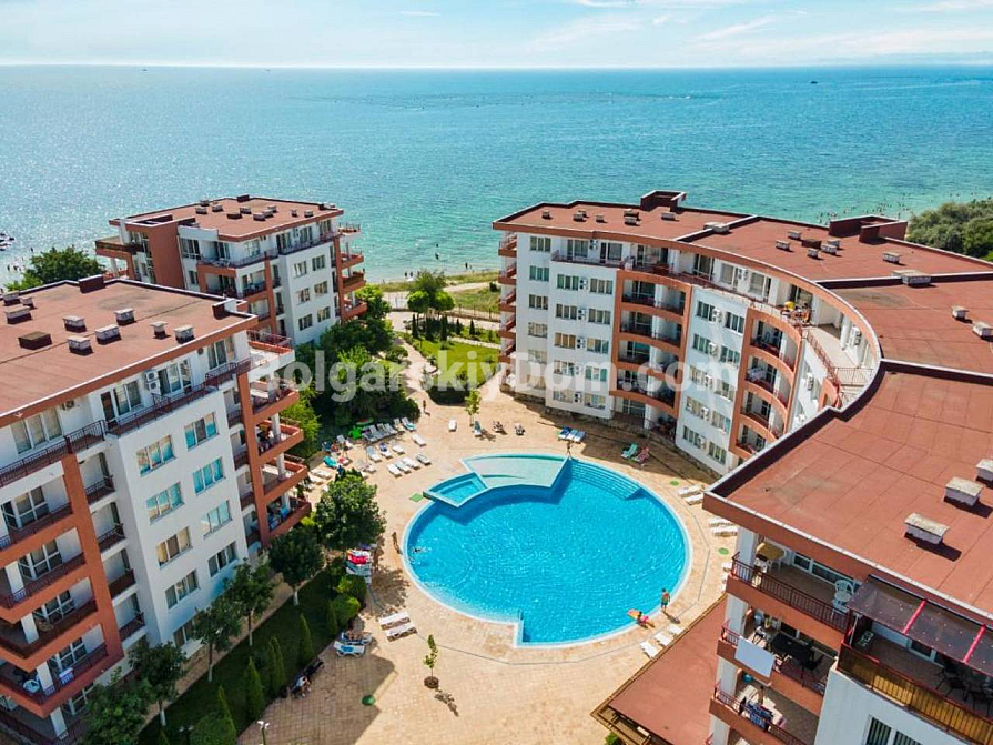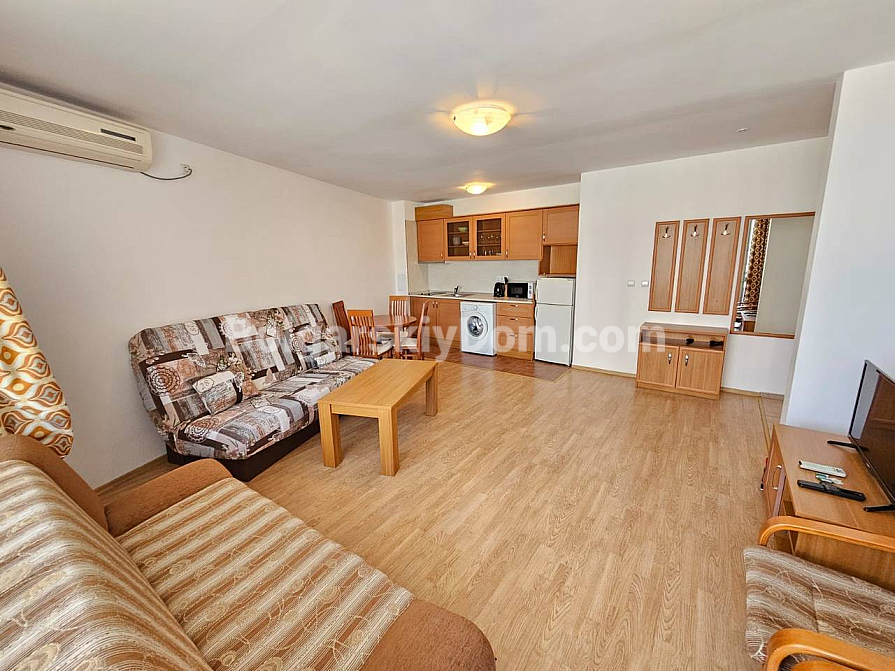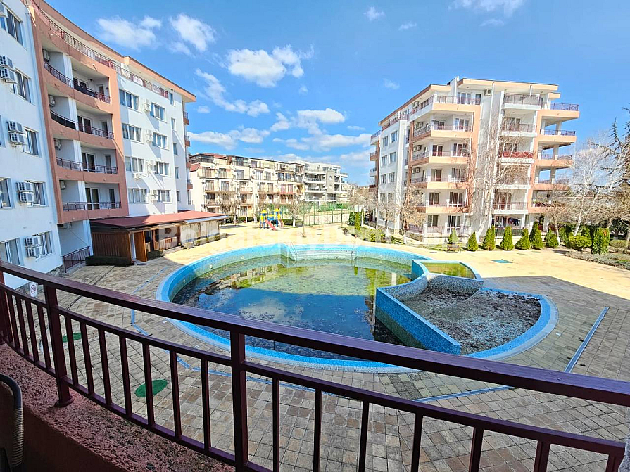 A prime frontline property in a residential complex with a tennis court! Our agency Bolgarskiy Dom presents a spacious one-bedroom apartment with an area of 79 sq.m. in the Riviera Fort Beach complex, located in the cozy village of Ravda. The apartment is situated on the 2nd floor and is sold fully furnished and equipped with appliances. The layout includes a living room with a kitchen/dining area, a separate bedroom, and a terrace overlooking the pool. The interior is bright and standard, fully furnished: a bedroom set, a kitchenette in a semi-niche, and a soft seating area. This property is ideal for comfortable year-round living or renting out with a high return.