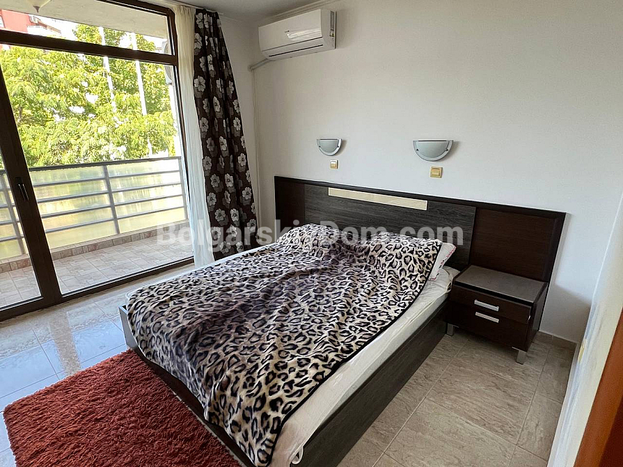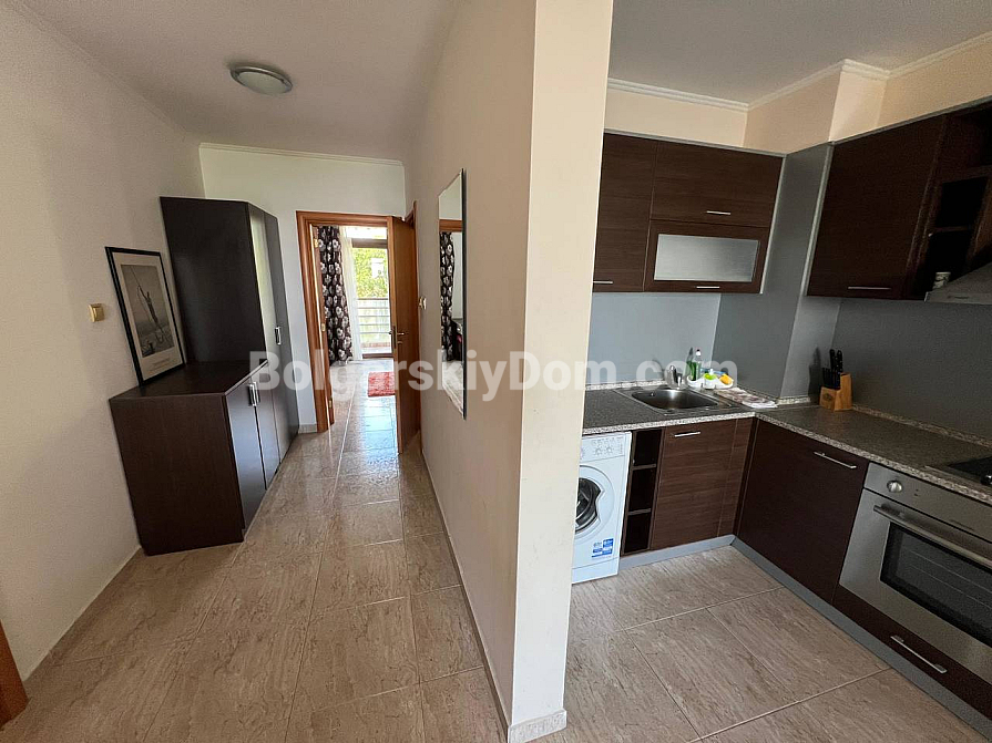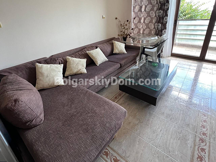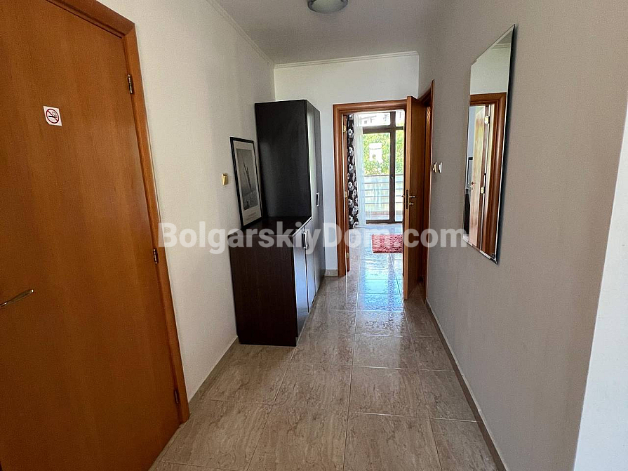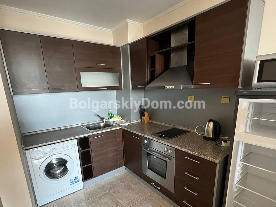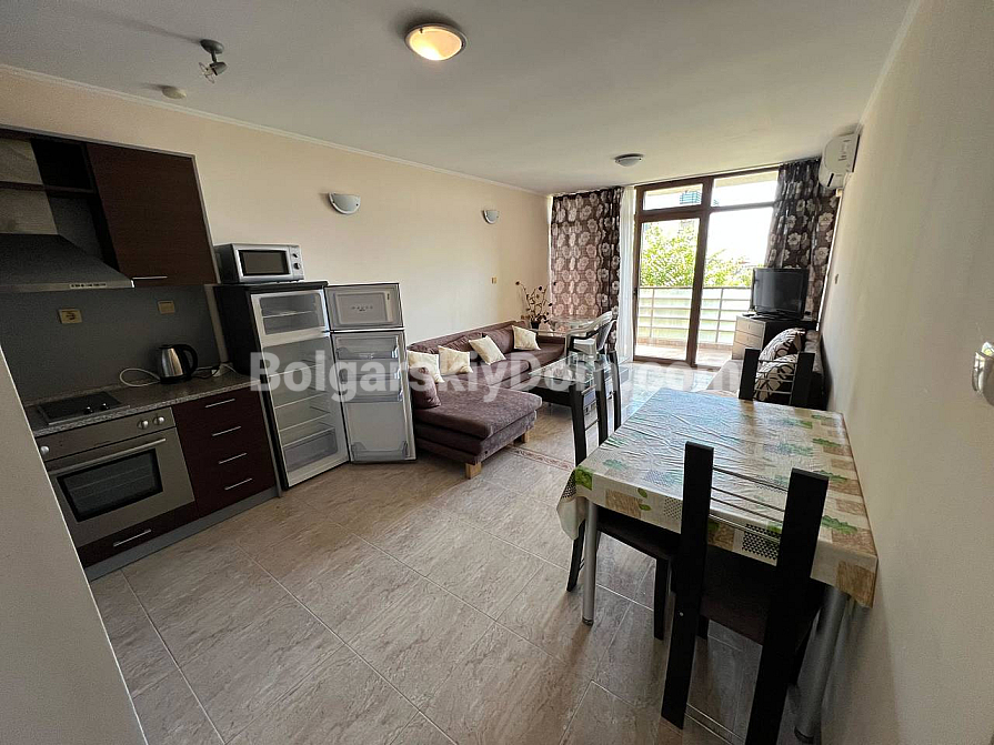 A new addition to the luxury segment of our catalogue! Among the most prestigious listings of Bolgarskiy Dom is a one-bedroom apartment in the Diamant complex, the top-class resort of Saint Vlas. The apartment has an area of 62.45 sq.m. and is located on the 2nd floor. It is sold fully furnished and equipped, ready for immediate move-in. The layout is well thought out: a bright living room with a kitchen, a bedroom, and, notably, two terraces! One overlooks the well-maintained courtyard, while the other offers a partial sea view.