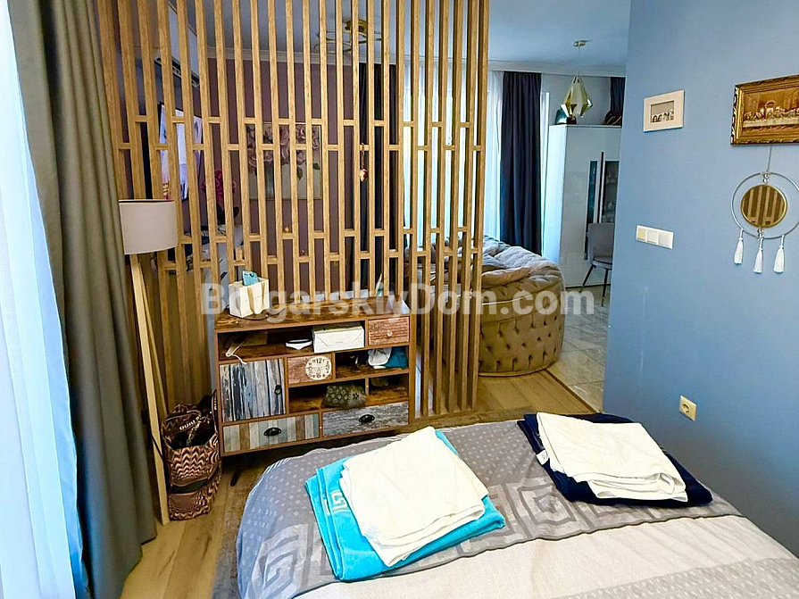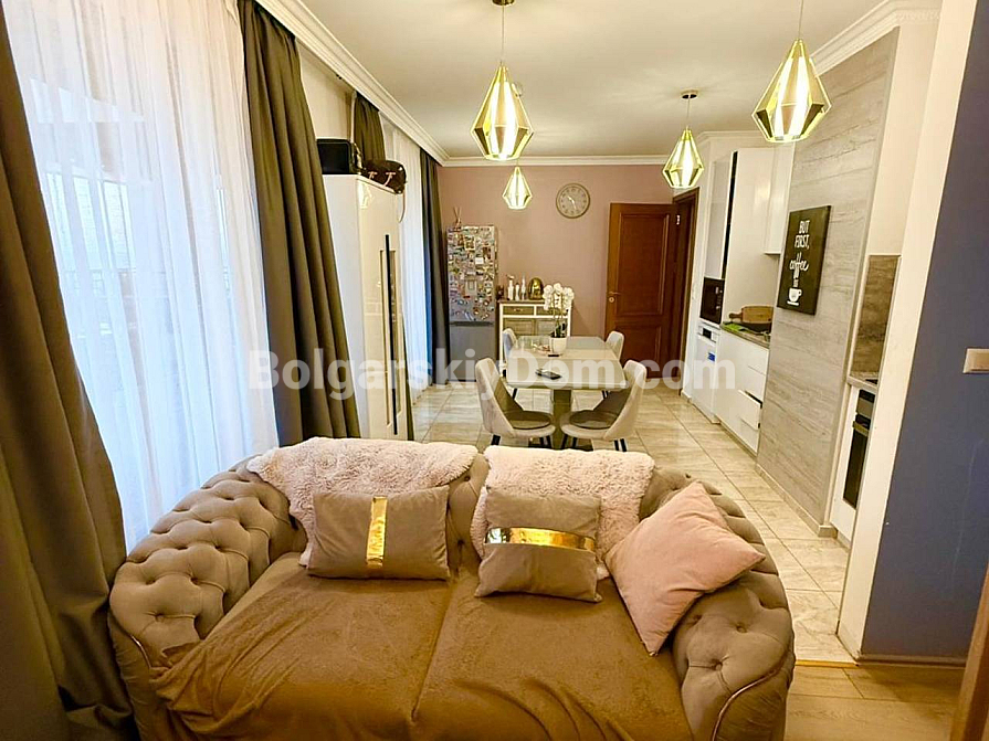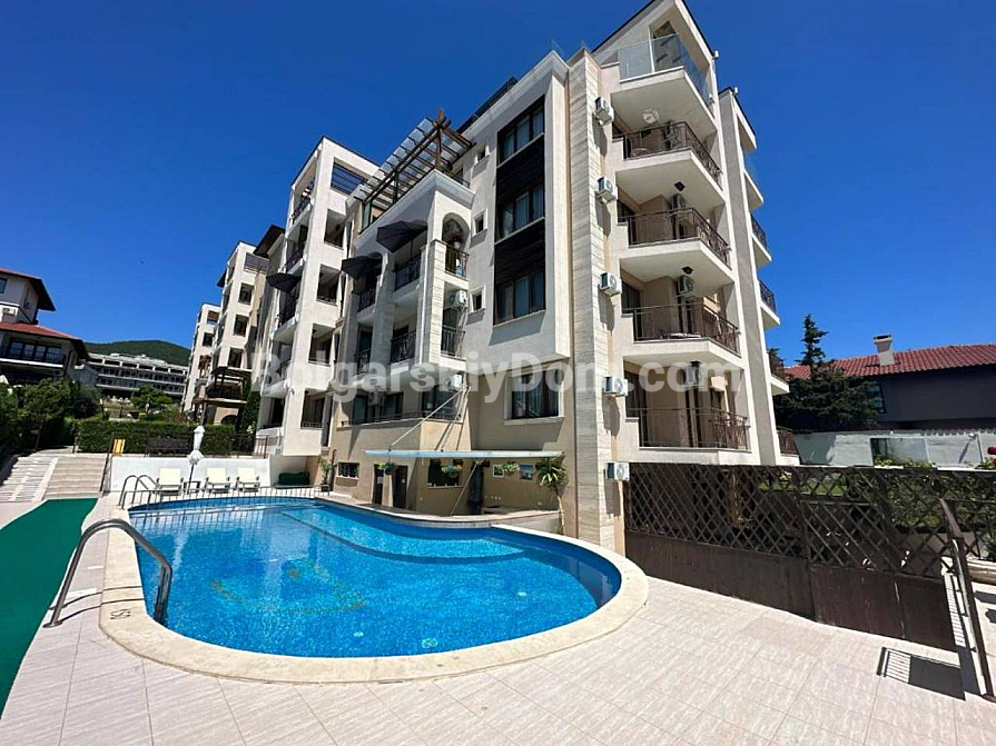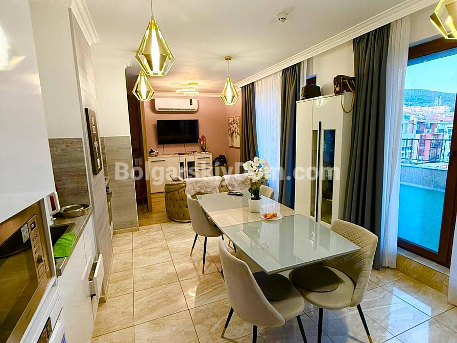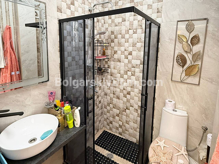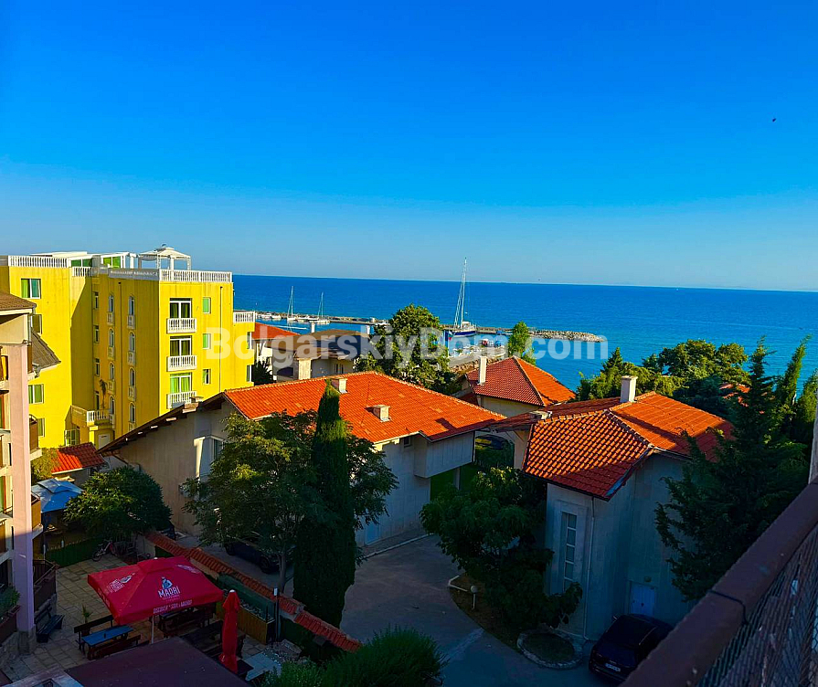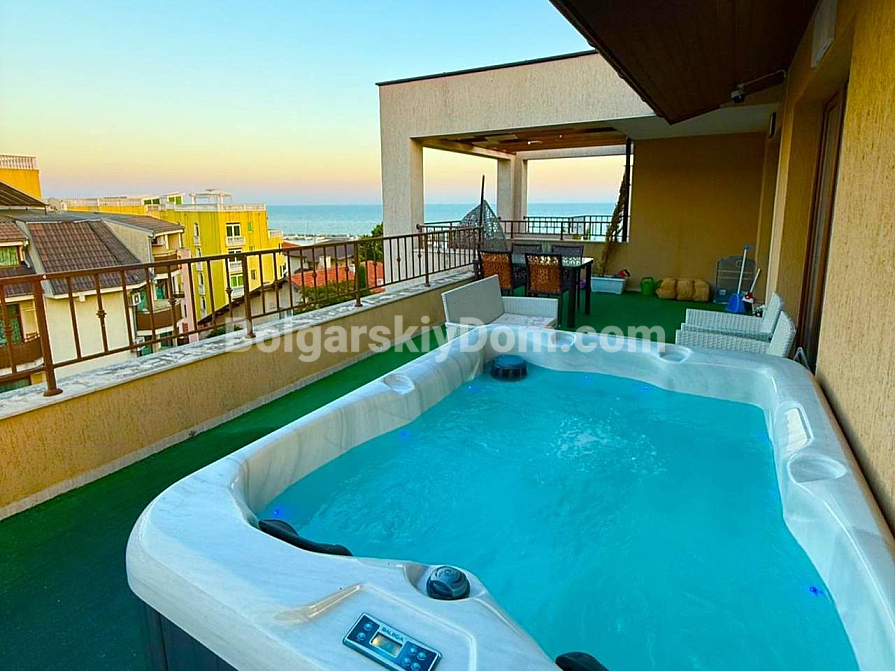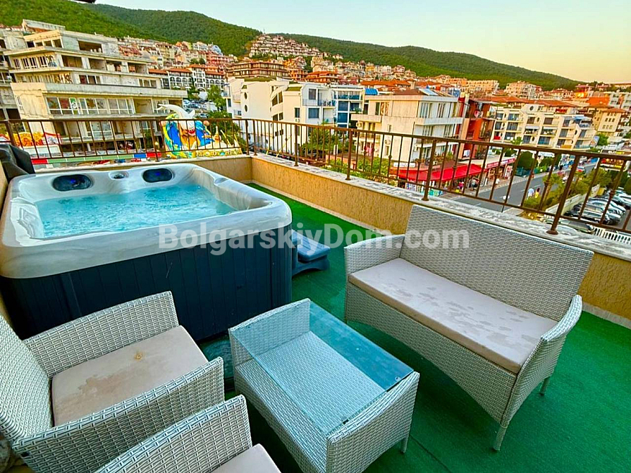 Top location and a breathtaking sea panorama right from your windows! Among the most prestigious listings of Bolgarskiy Dom is this unique offer. We present a luxury penthouse in Porto Paradiso (Saint Vlas), a complex with modern Mediterranean architecture, situated on the top floor and offering an incredible panoramic view of the sea, the mountains, and the old town of Nessebar. The property has an area of 115 sq.m. The apartment is located on the 6th (top) floor and features excellent finishing. Inside: a spacious living room with a kitchen, a separate bedroom, and a designer bathroom with a premium shower system. But the highlight is the very large terrace equipped with its own jacuzzi — the perfect place to enjoy sunrises and sunsets. The property is sold fully furnished with high-quality, expensive furniture and all necessary appliances.