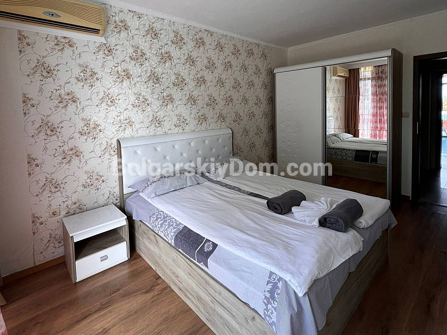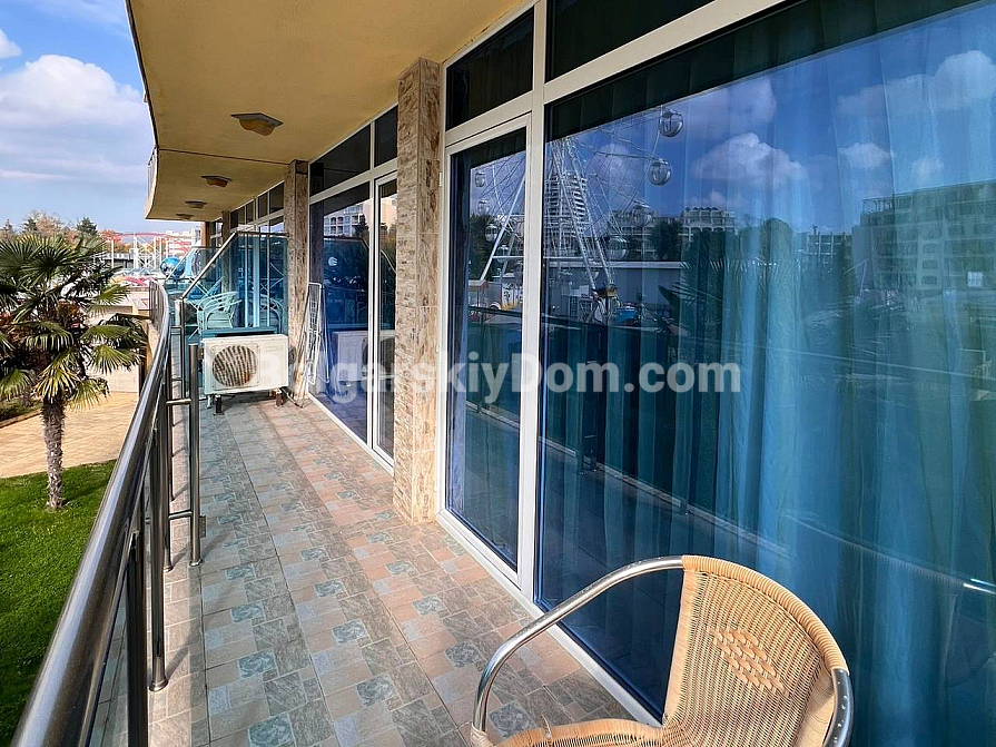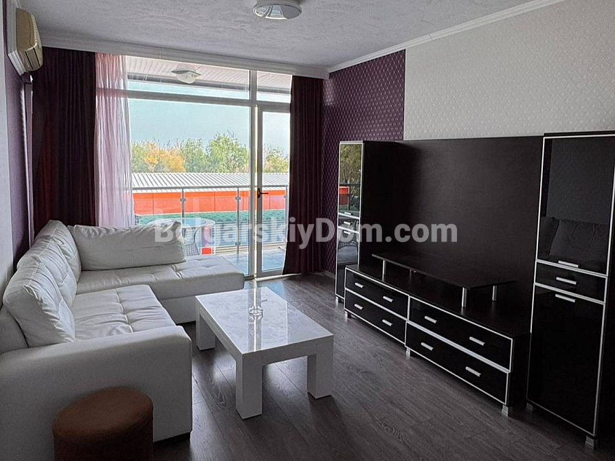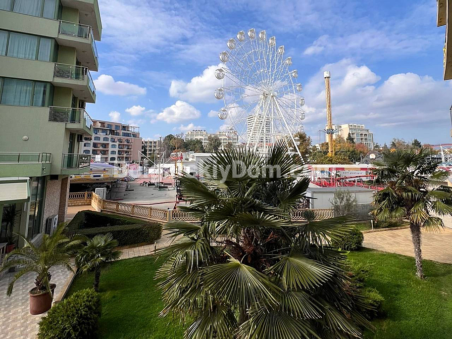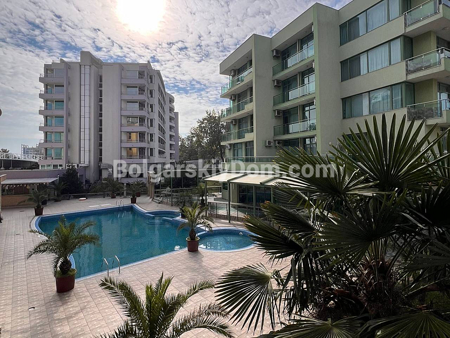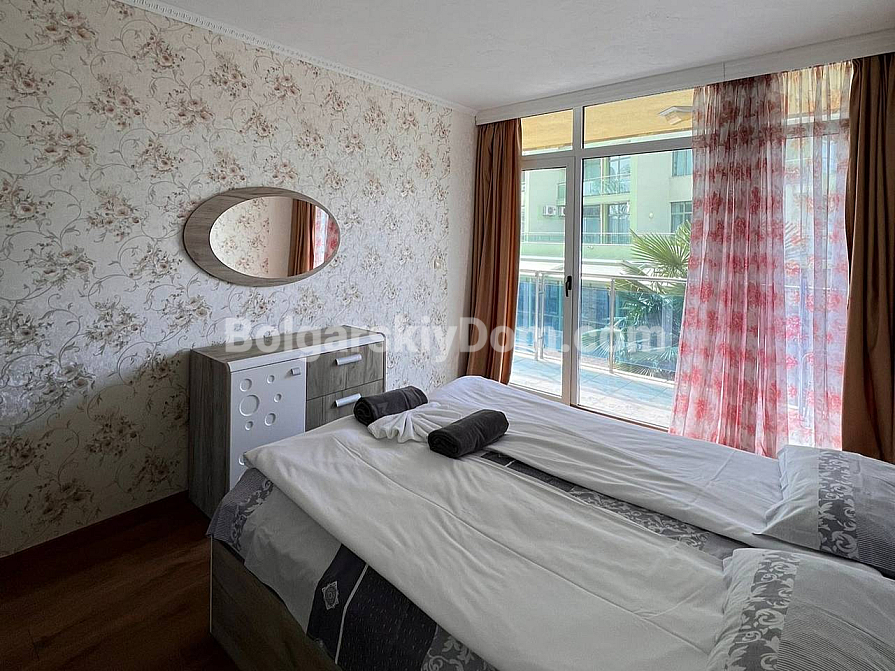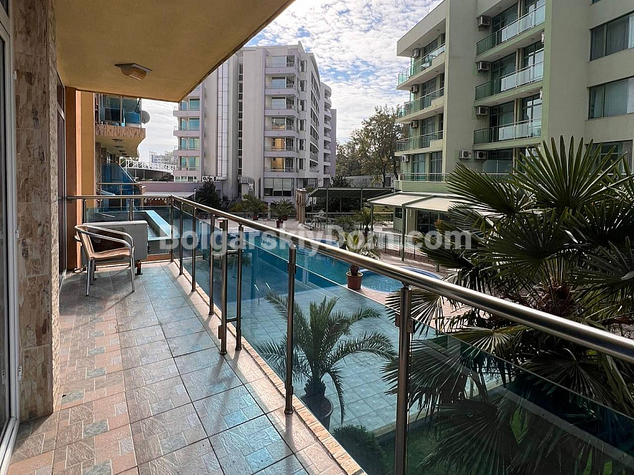 A new addition to the panoramic listings! Among the most attractive offers of Bolgarskiy Dom in Sunny Beach is this spacious two-bedroom apartment. We present a property with an area of 101 sq.m. in the Gallery 2 complex. The apartment, located on the 2nd floor, offers excellent functionality: a bright living room with a kitchen, two separate bedrooms and two fully equipped bathrooms with shower cabins. And the main highlight — two spacious terraces! One overlooks the pool and inner courtyard, while the other faces the street with a partial sea view.