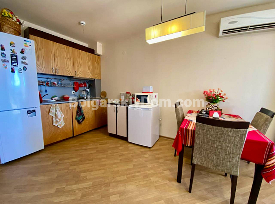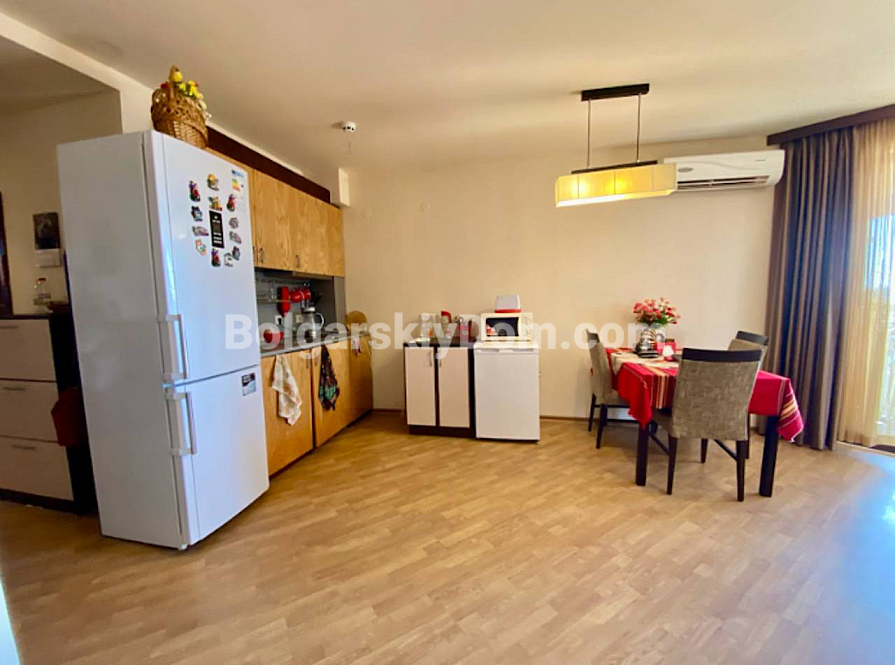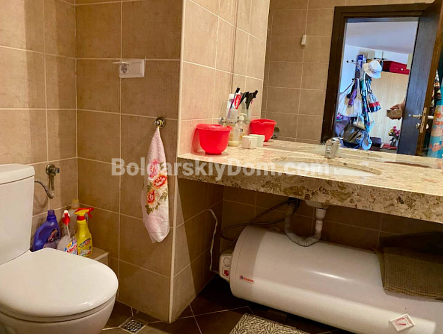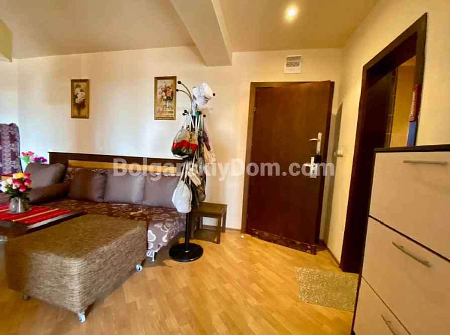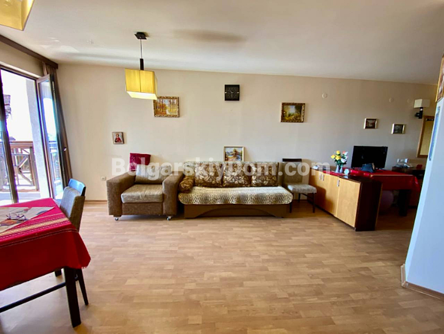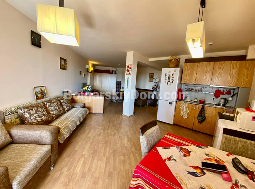 Fresh listing in a quiet area away from the tourist hub of the resort. In the Chairite complex, a studio apartment with a truly impressive size of 76 sq.m. has come up for sale. This is a full-fledged residential space on the third floor. The apartment is fully furnished and ready for you to move in: a spacious living room with a kitchen area, a neat bathroom, and a terrace. The building has Act 16 and is in excellent condition, so there will be no surprises with repairs or documentation. Take note of the attractive price — one of the lowest in our catalog.