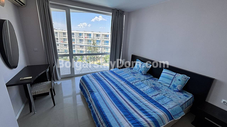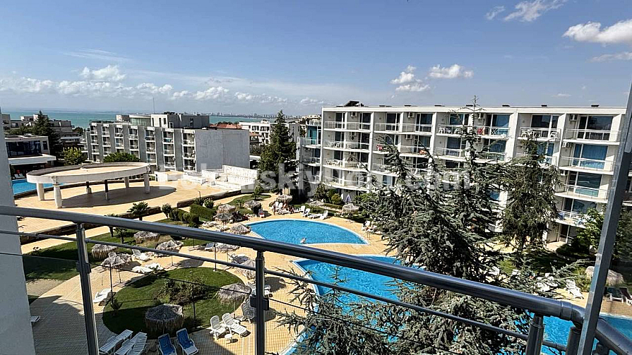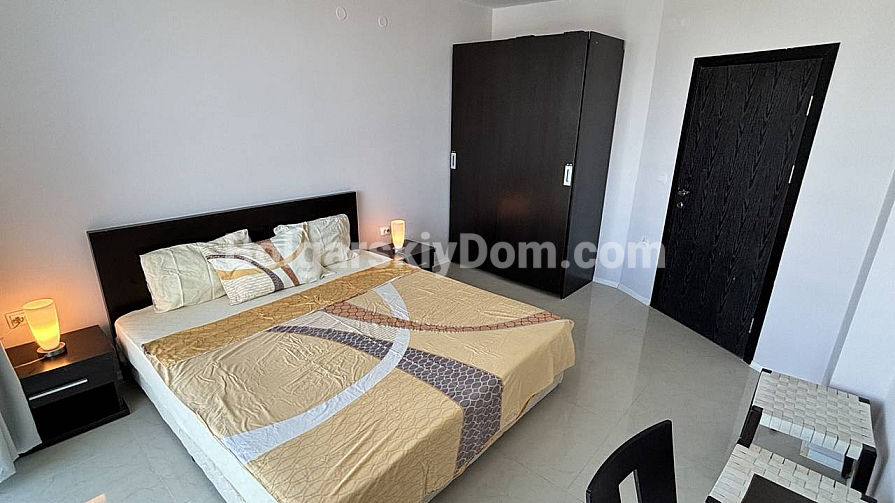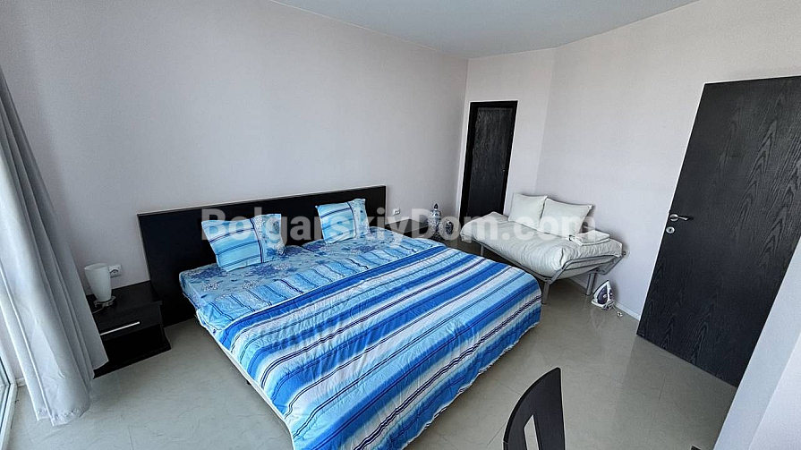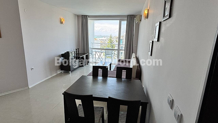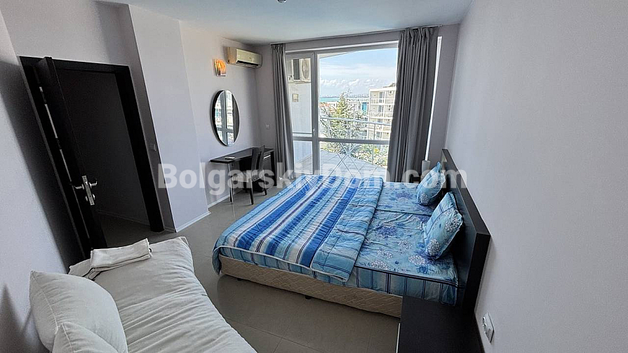 In the prestigious Sarafovo district, on the top floor of the Atlantis complex, Bolgarskiy Dom presents an apartment that truly deserves attention. The main highlight of this 105 sq.m property is that the sea is visible from absolutely every window. The southwest orientation fills the rooms with warmth throughout the day, while the wide panoramic terrace connecting the living room and both bedrooms creates a perfect outdoor relaxation area. The apartment is fully furnished and equipped with a functional kitchen, modern upholstered furniture, and an important comfort bonus — a separate walk-in wardrobe in the master bedroom.