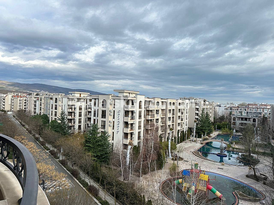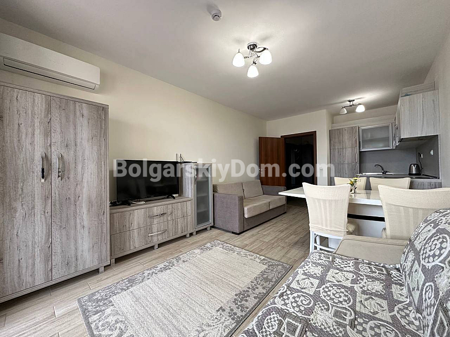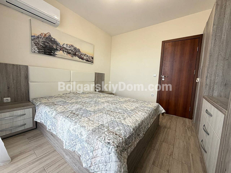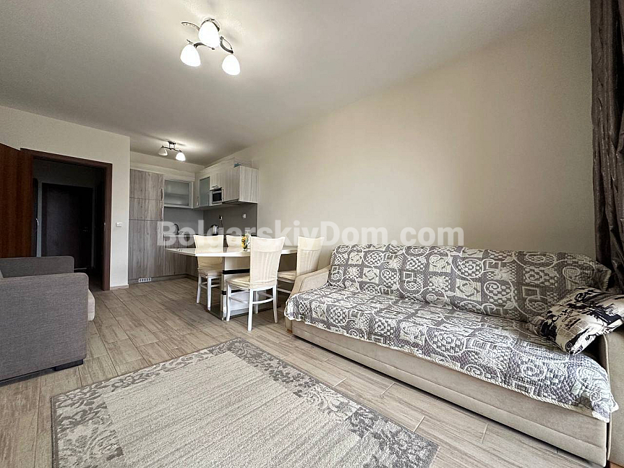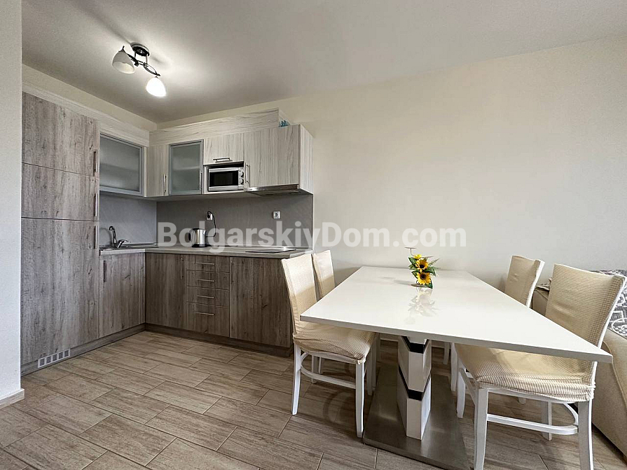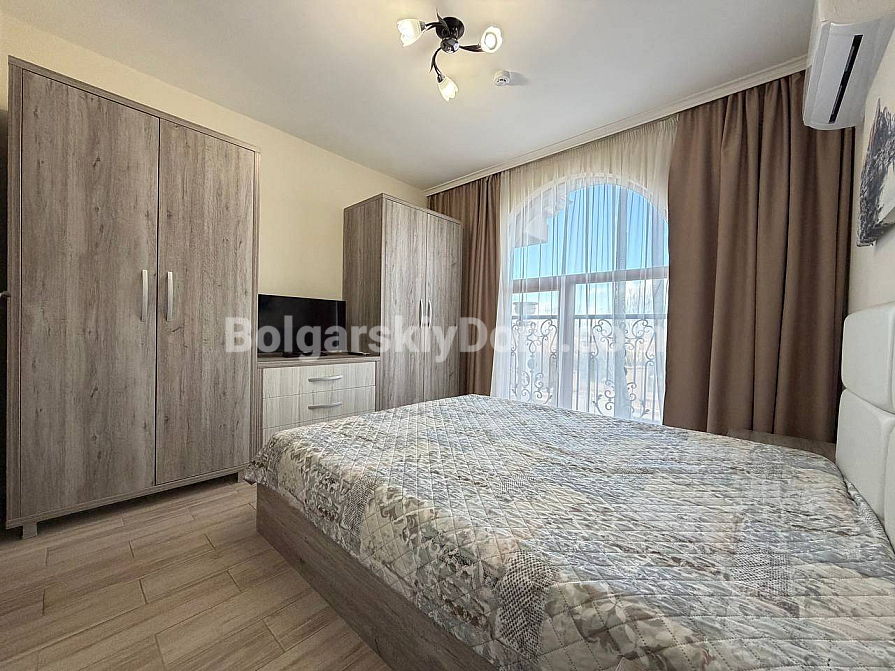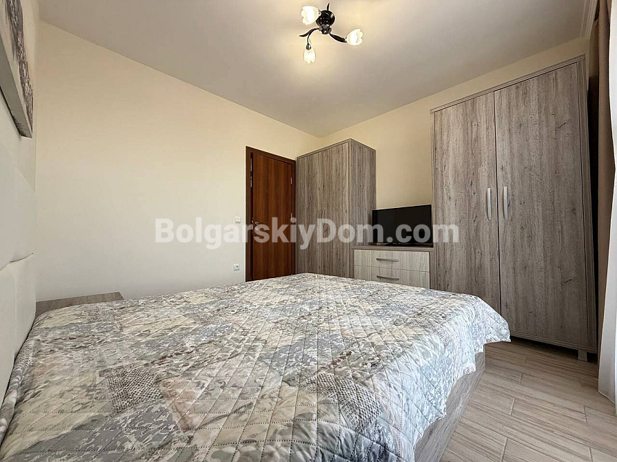 We offer a one-bedroom apartment on the top floor of Cascadas 15 complex, located in the final phase of development – 60 sq.m. of bright, clean space. The apartment is fully furnished and equipped, with a classic and neat interior where every element is in its place and seems to be waiting for new owners. The layout is well thought out: a spacious entrance hall, two separate rooms with natural light, a bathroom with a shower cabin, and a private terrace overlooking the green territory of the complex and its swimming pools – a perfect spot for morning coffee or evening relaxation. The furniture is of good quality, the appliances are modern and in working condition. The windows let in plenty of light, creating a sense of openness despite the compact size. Everything is ready for you to move in and start living immediately.