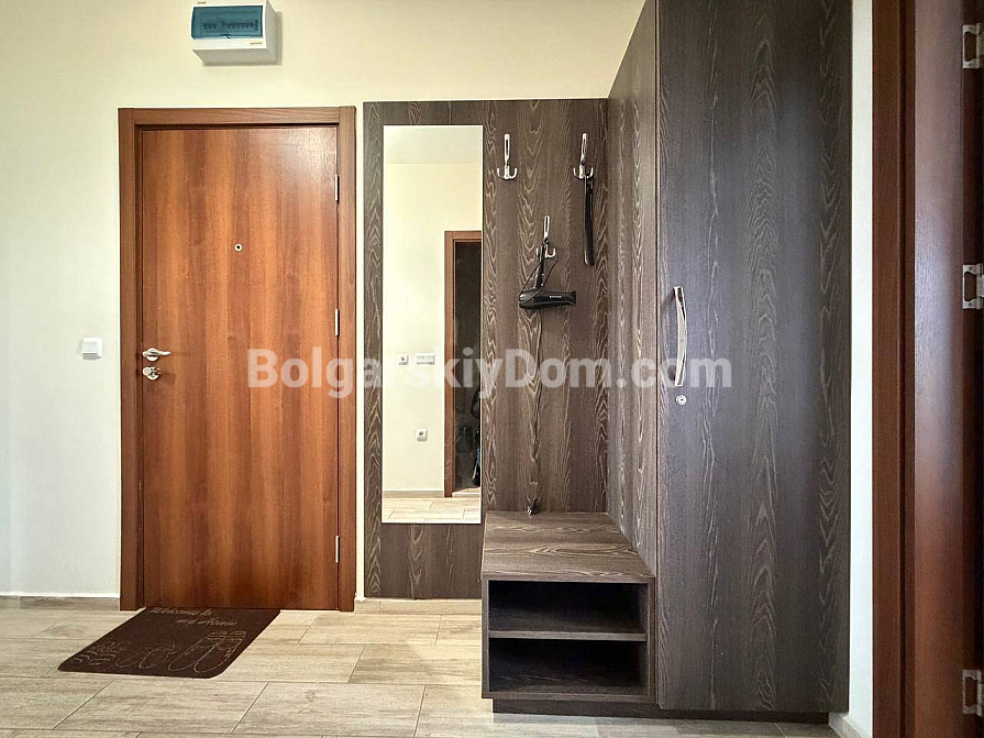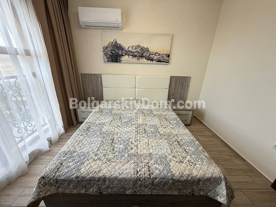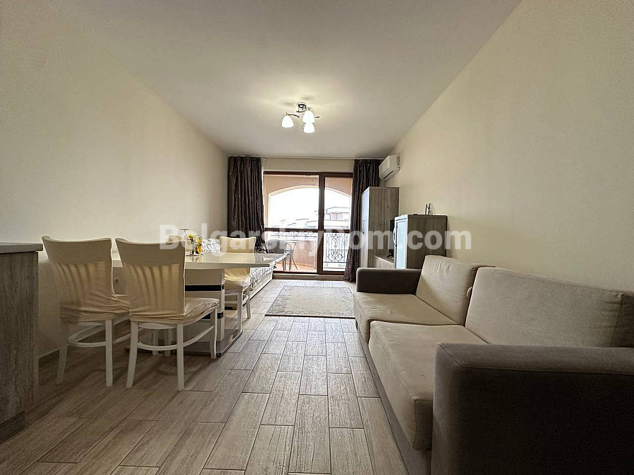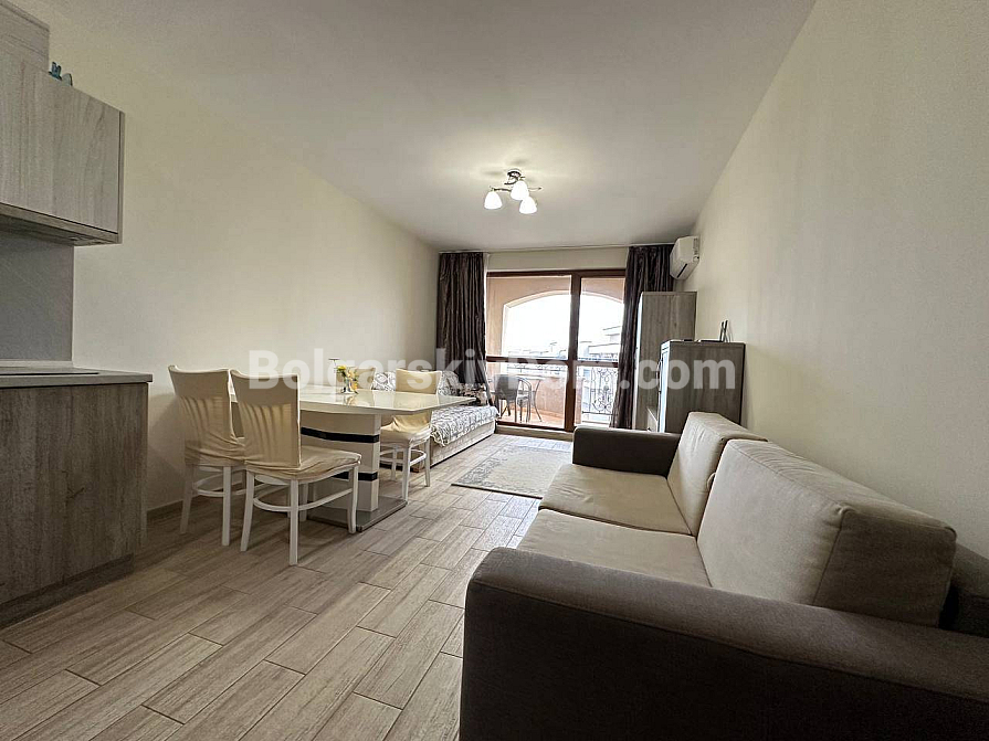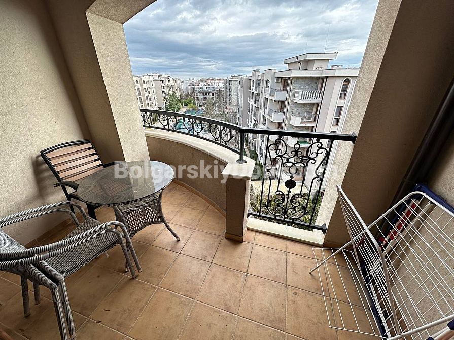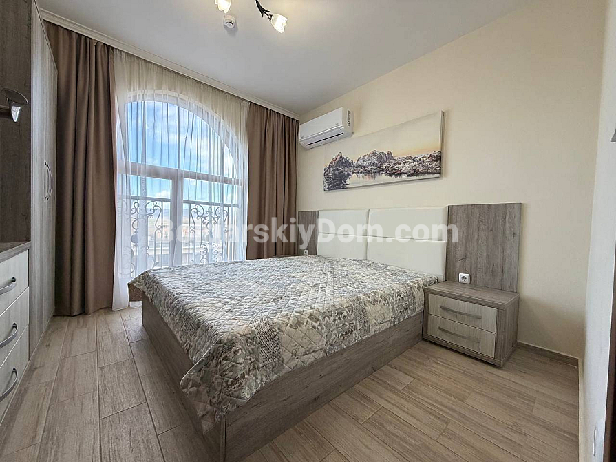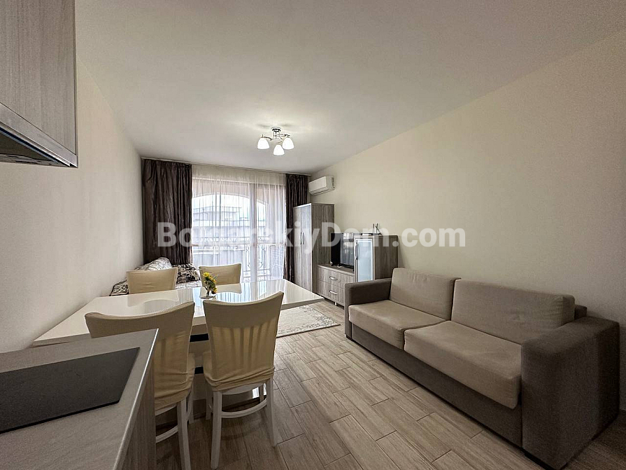 We offer a one-bedroom apartment on the top floor of Cascadas 15 complex, located in the final phase of development – 60 sq.m. of bright, clean space. The apartment is fully furnished and equipped, with a classic and neat interior where every element is in its place and seems to be waiting for new owners. The layout is well thought out: a spacious entrance hall, two separate rooms with natural light, a bathroom with a shower cabin, and a private terrace overlooking the green territory of the complex and its swimming pools – a perfect spot for morning coffee or evening relaxation. The furniture is of good quality, the appliances are modern and in working condition. The windows let in plenty of light, creating a sense of openness despite the compact size. Everything is ready for you to move in and start living immediately.
