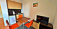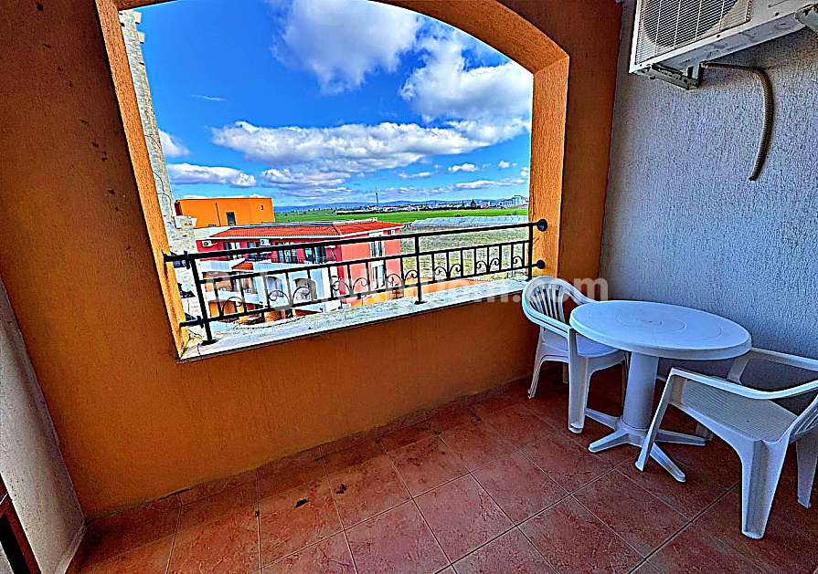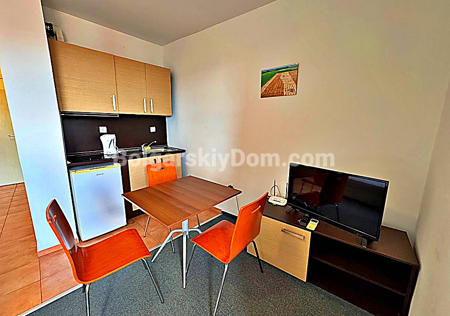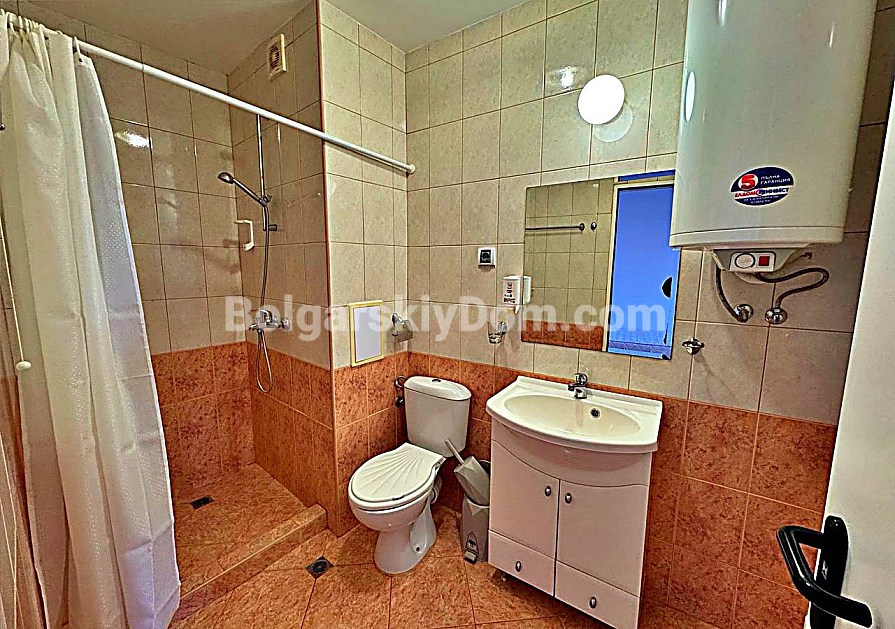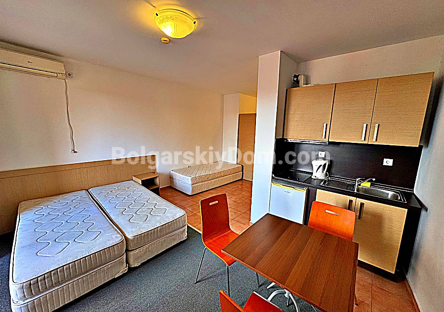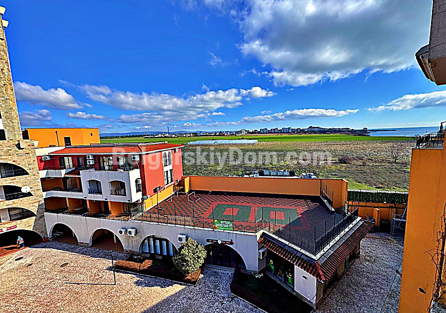 A fresh and profitable offer from Bolgarskiy Dom! A spacious studio right on the first sea line in the Marina Cape complex in the quiet resort town of Aheloy. The property is located on the 4th floor of a five-storey brick building built in 2012 with an elevator. The total area is 41 sq.m. and includes an entrance hall, a large room (living area + kitchenette + sleeping space), a bathroom with a shower, and a terrace overlooking the complex pool and green territory. The studio is furnished and equipped with household appliances — bright and comfortable, suitable for 2–3 people, ready for immediate move-in or daily rental during the season.