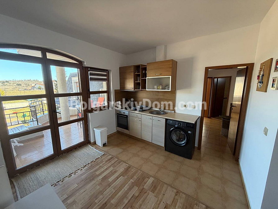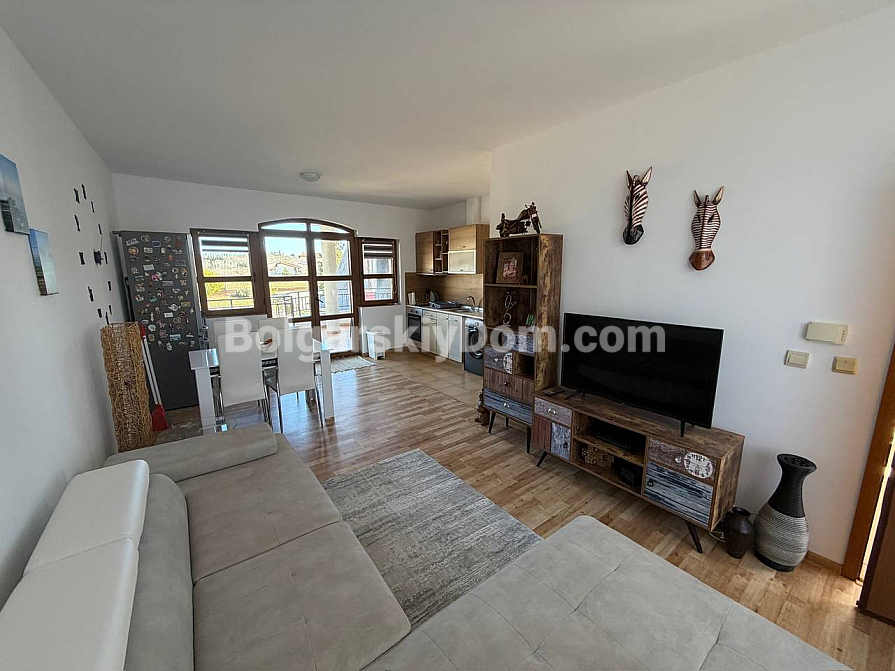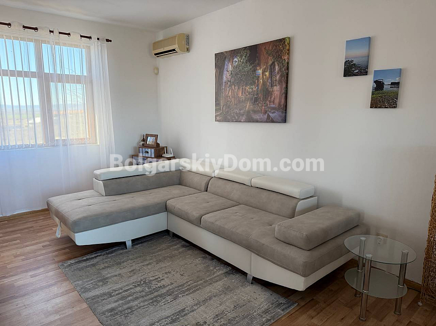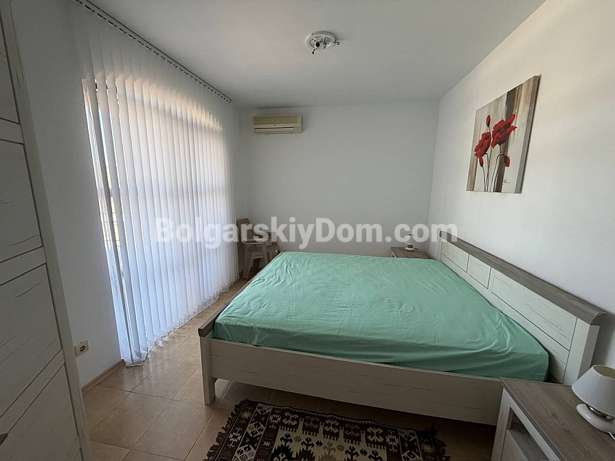 A new addition to the catalog from Bolgarskiy Dom! A spacious two-bedroom apartment with panoramic mountain views in the Nessebar View complex in the village of Kosharitsa. The apartment with a total area of 96 sq.m. is located on the 2nd floor (the top floor in a two-storey section) of a brick building built in 2008. The layout includes an entrance area with a kitchenette, a corridor, two separate bedrooms, a bathroom with a shower and toilet, plus a terrace with mountain views. Fully furnished and ready for immediate move-in or rental as an investment property.