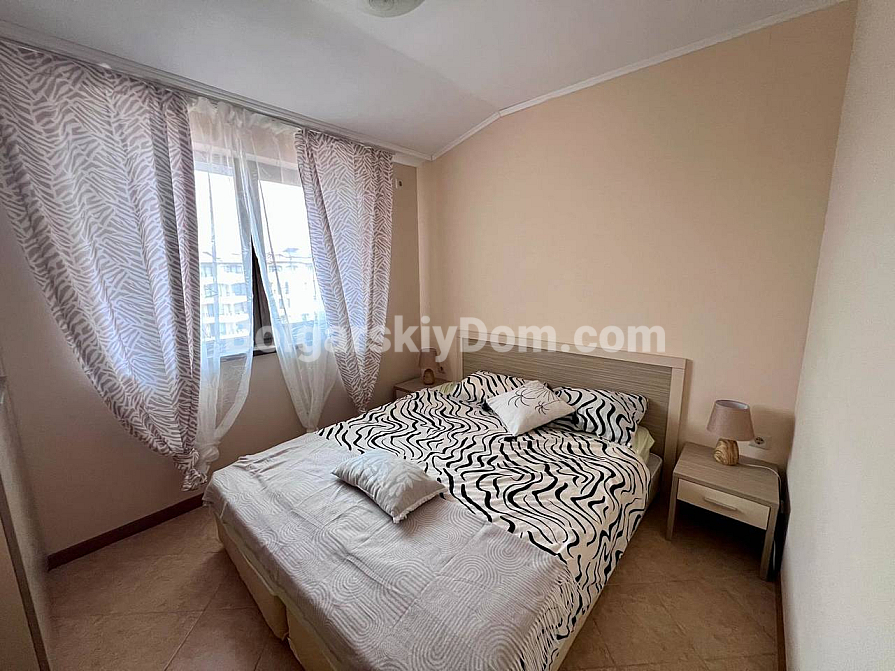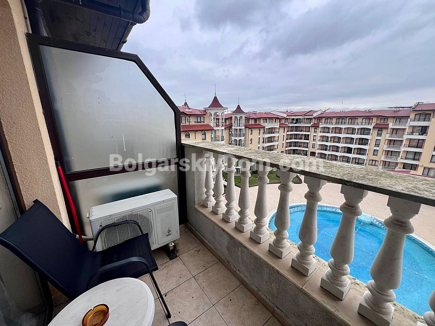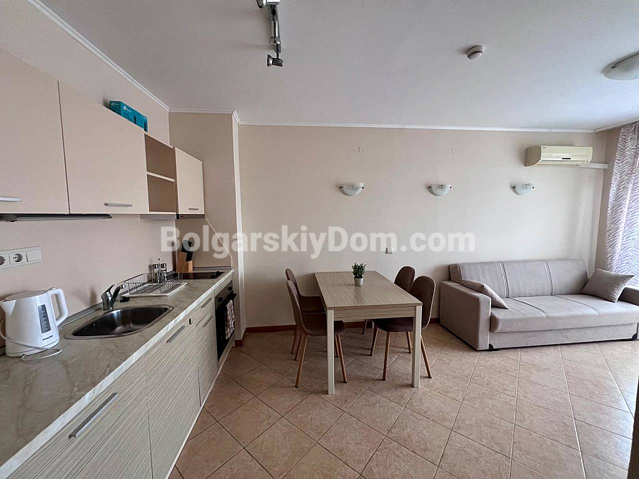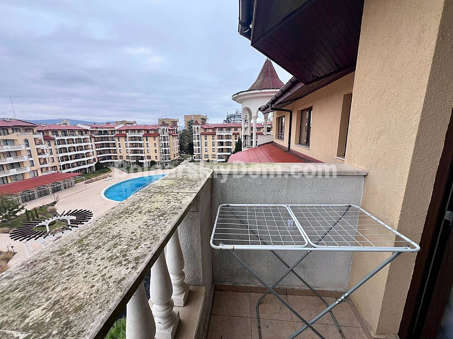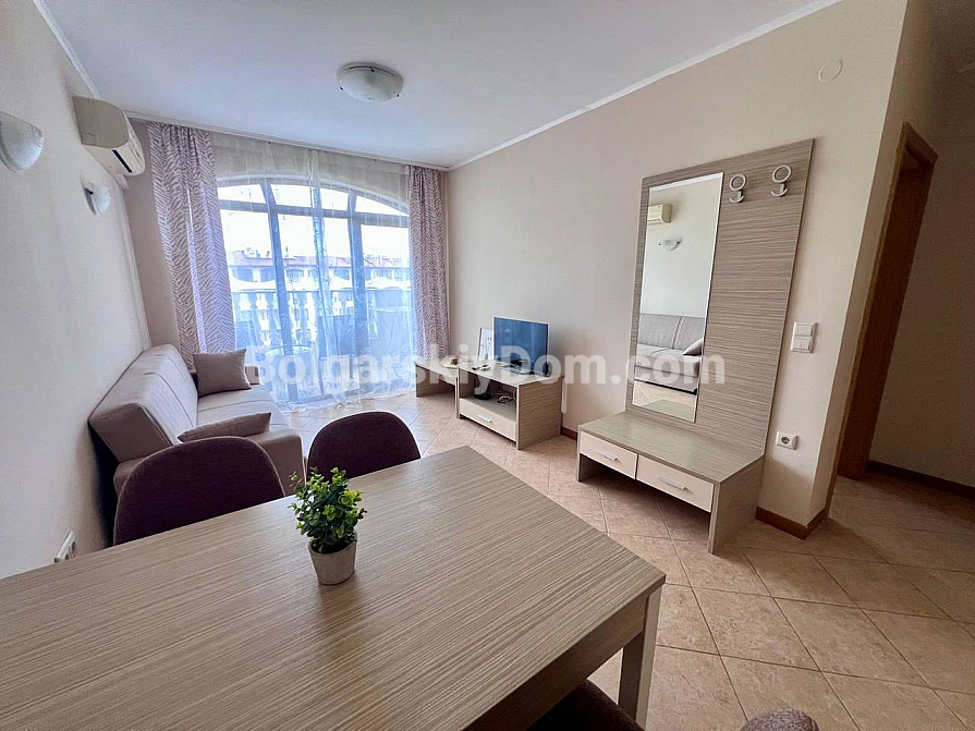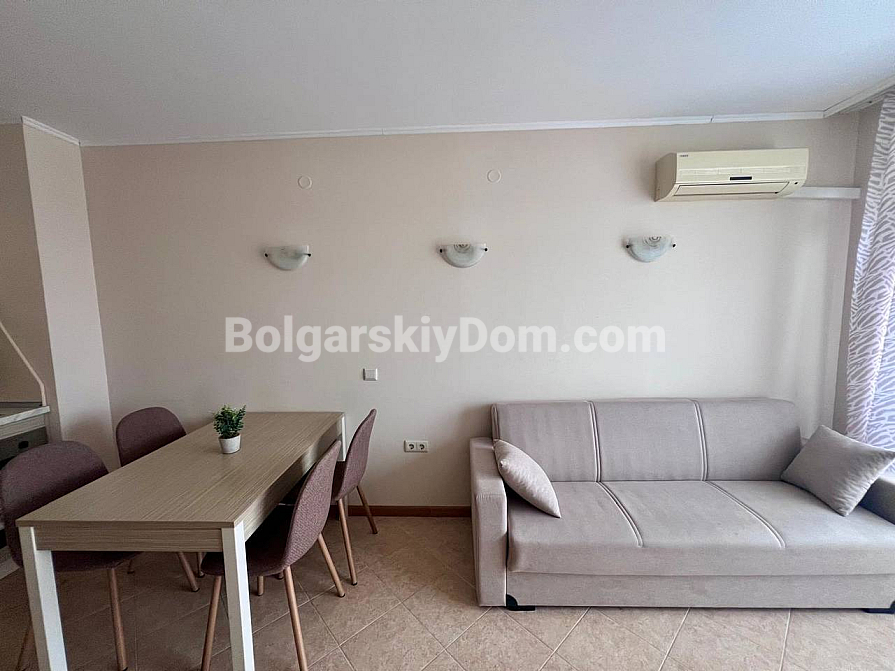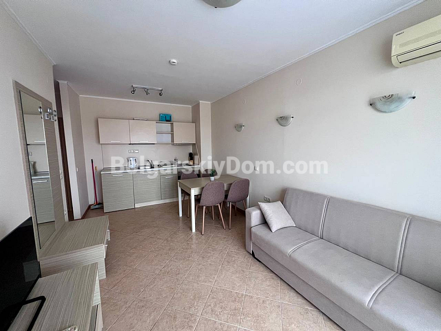 New addition to the Bolgarskiy Dom catalogue! A modern one-bedroom apartment in the Royal Sun complex in the center of Sunny Beach. The apartment has an area of 49 sq.m. and is located on the 6th floor of a six-storey building with an elevator. It features a classic layout: a spacious living room with a kitchen area, a separate bedroom, a bathroom, and a private terrace overlooking the complex pool. The apartment has been fully renovated, furnished with modern furniture, and equipped with all necessary appliances and air conditioning — ready for move-in in any season.