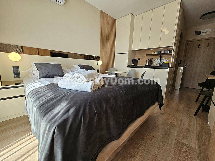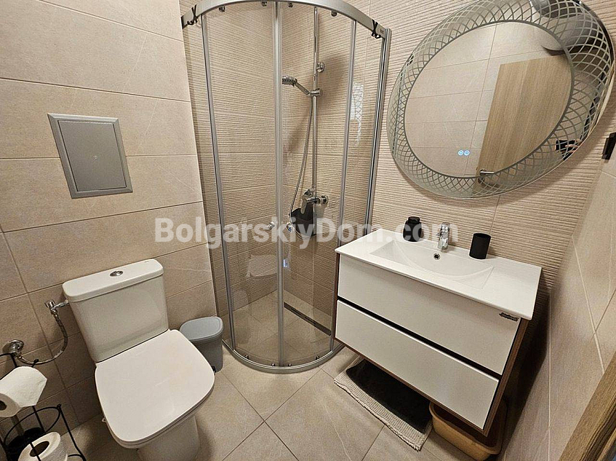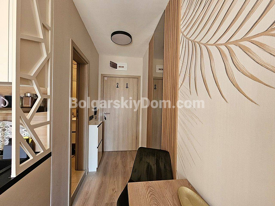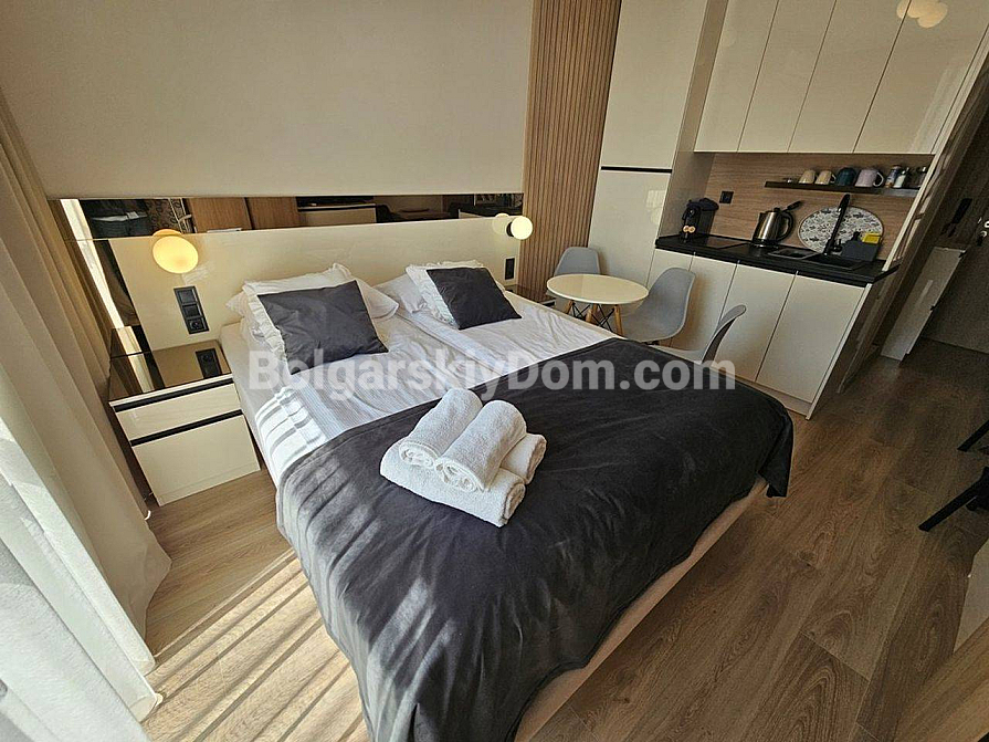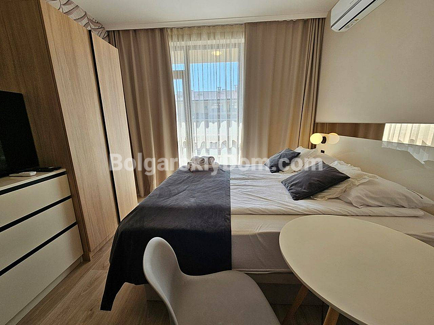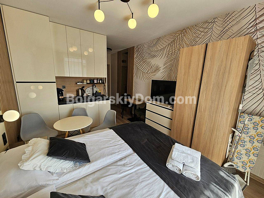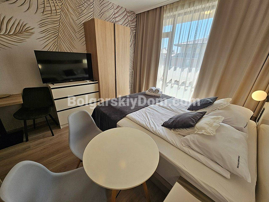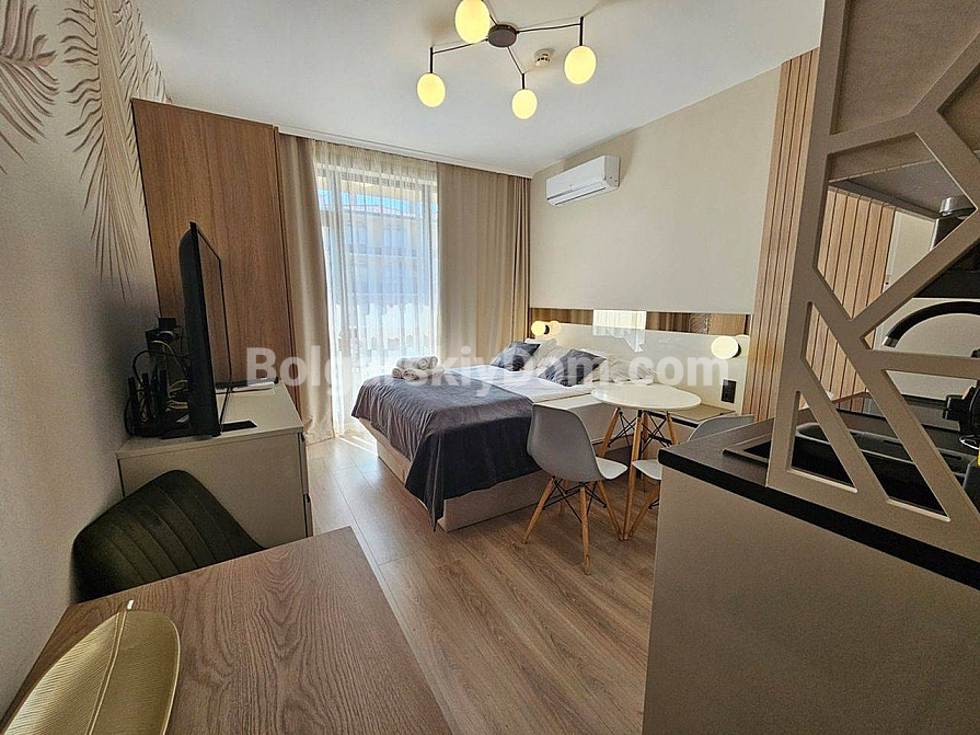 New listing in the Bolgarskiy Dom catalogue! A bright, fully move-in ready studio in the Sorrento Sole Mare complex in Saint Vlas. The apartment has an area of 34.17 sq.m., located on the ground floor, with south-facing windows — sunlight all day, warm and bright. The condition is perfect: fresh modern renovation, stylish furniture, and all necessary appliances — move in right away or start short-term or long-term rental immediately. The space is ergonomically designed: a kitchenette, a relaxation/sleeping area, a bathroom with a shower, and an entrance hall — compact yet very cozy.