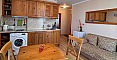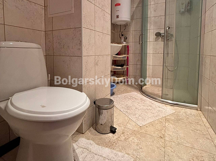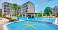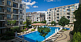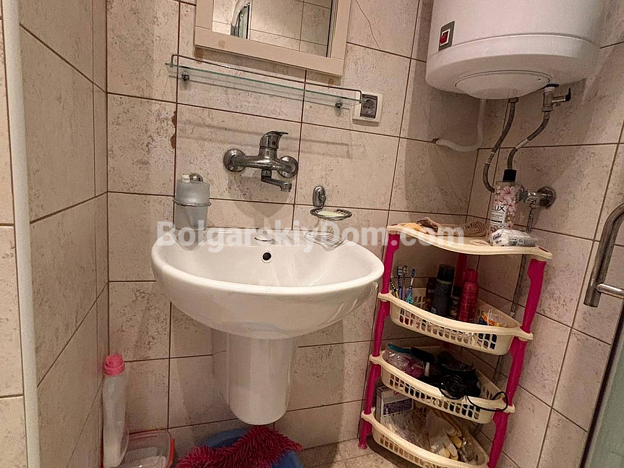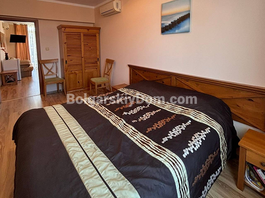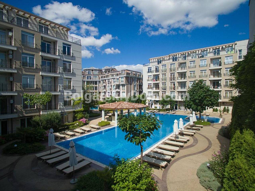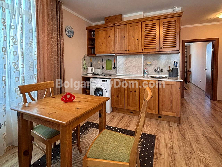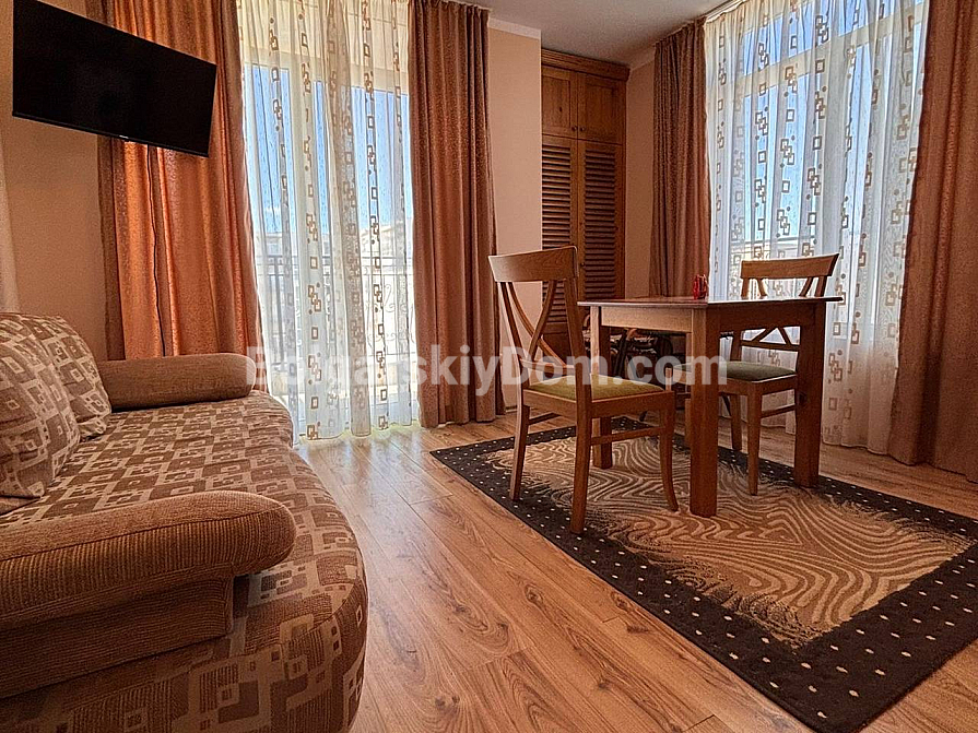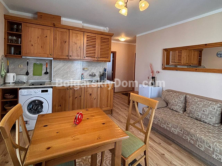 A new listing in the Bolgarskiy Dom catalog! A cozy, fully move-in-ready one-bedroom apartment in the Dawn Park complex, located in a quiet part of Sunny Beach. Total area 56.64 sq.m. (living area 46.09 sq.m.), situated on the 5th floor. The apartment is bright, with a lovely terrace overlooking the pool — direct access to fresh air from the living room. Layout: entrance hall with a shoe cabinet, living room with a sofa, TV, air conditioner, dining table for 4 and a coffee table, built-in wardrobe, mirror, kitchenette with upper and lower cabinets, sink, 2-burner stove, extractor hood, washing machine and refrigerator, bathroom with shower cabin and toilet, separate bedroom with a bed, wardrobe, bedside tables, air conditioner and a dressing table with mirror. Furnished with modern furniture in good condition — perfect for a couple or a family.
