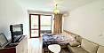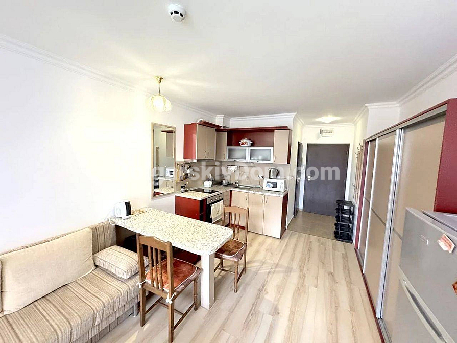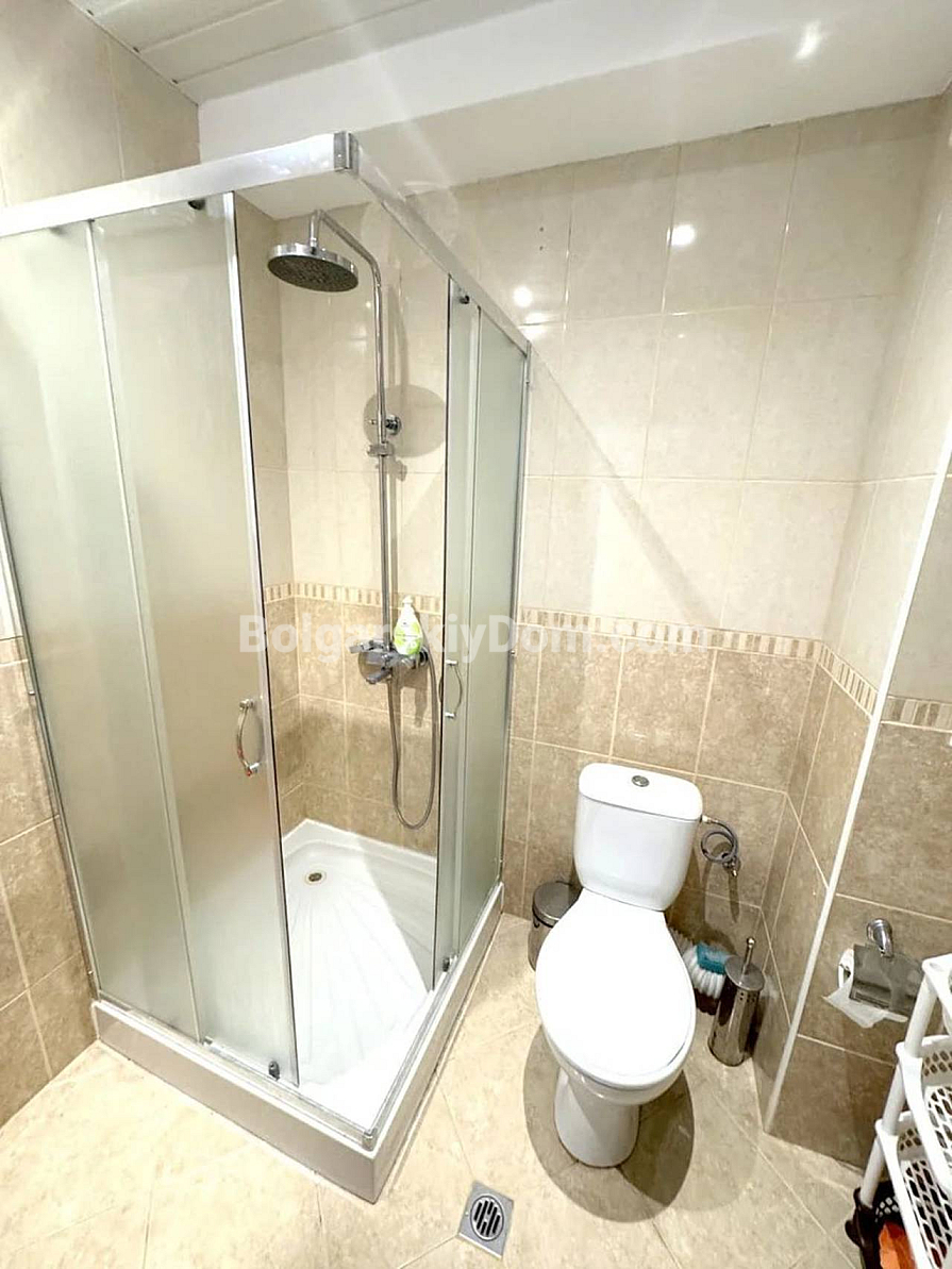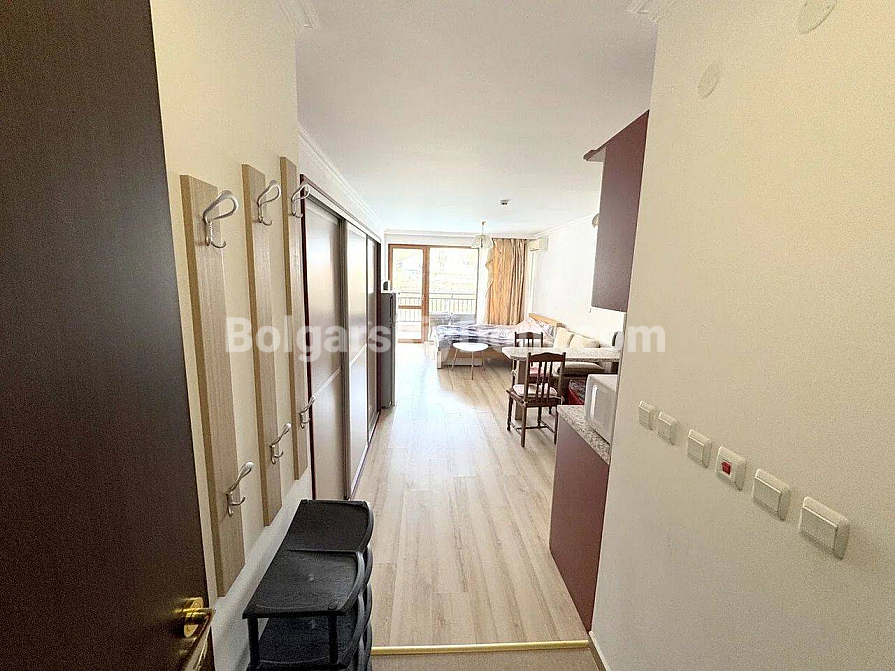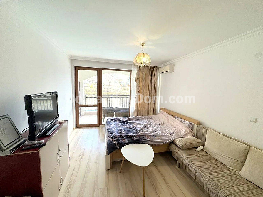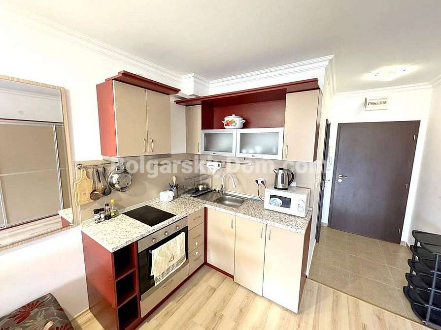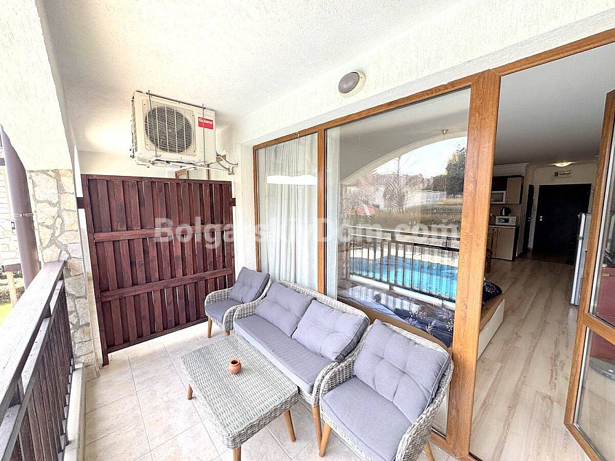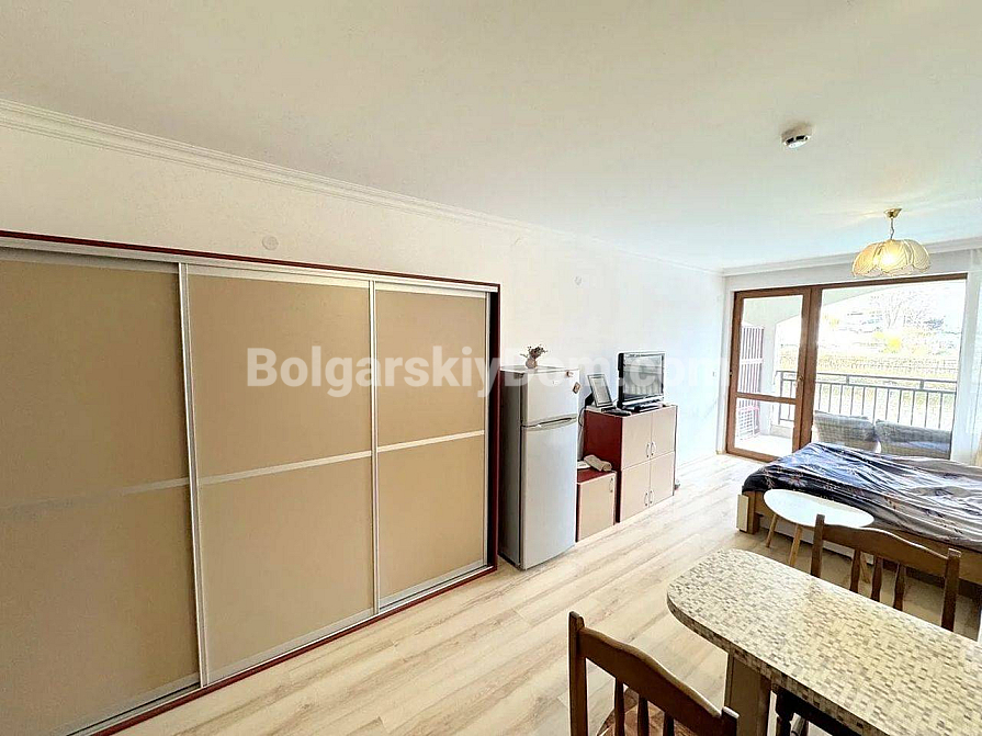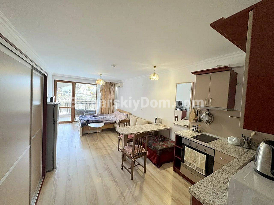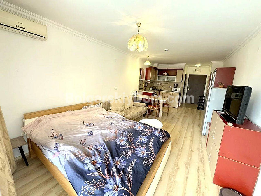 New listing in the Bolgarskiy Dom catalog! A cozy studio on the first sea line in the gated Amphora complex in Saint Vlas. Total area 48 sq.m., located on the 2nd floor of a seven-storey building with an elevator. The apartment is fully move-in ready: entrance hall, living area with a kitchen zone and a designated sleeping area, bathroom with a shower, and a spacious terrace overlooking the complex pool. The studio is sold with furniture and all necessary appliances — bright, comfortable, ideal for a couple or a small family, and also perfect for short-term rentals during the high season.
